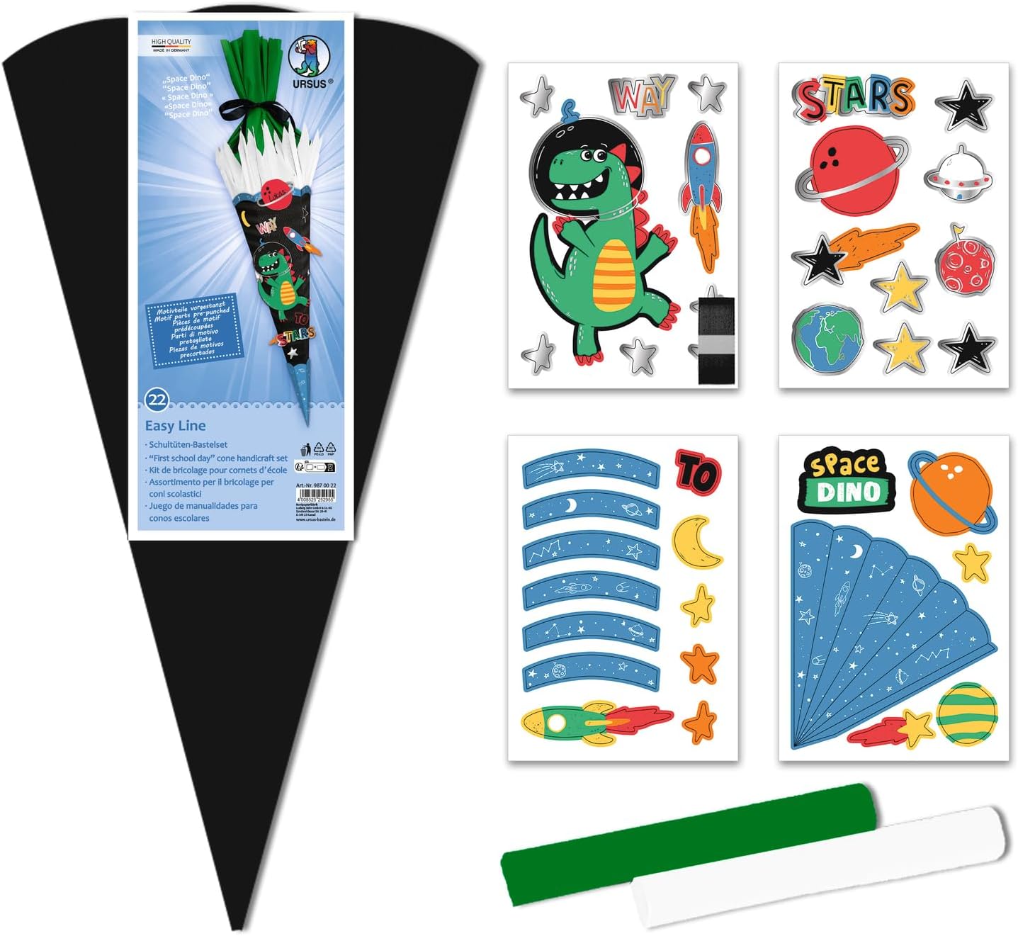 Set per la realizzazione di un cono scuola personalizzato con motivo di dinosauro in nero e blu Cono di zucchero a 6 lati in cartone ondulato 3D pretagliato, con un diametro di circa 20 cm e un'altezza di circa 68 cm, 260 g/m². Sono inclusi 2 rotoli di crêpe craft di circa 250 x 50 cm, nastro di raso, vari pezzi fustellati (alcuni glitterati o rifiniti in lamina) e istruzioni per la realizzazione. Facile e veloce da assemblare, ideale come regalo per il ritorno a scuola Da riempire individualmente con accessori scolastici, caramelle e piccoli giocattoli.
