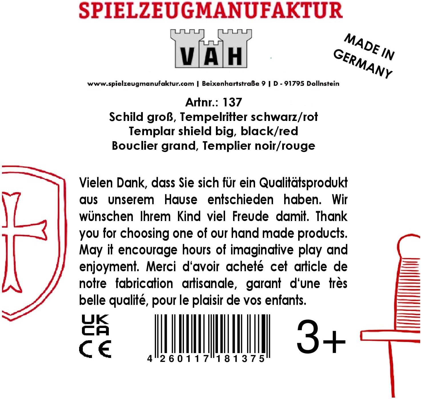 MADE IN GERMANY: Realizzato a mano con materie prime rinnovabili regionali a Dollnstein, in Baviera - Sopravvive a ogni battaglia e sembra eccezionale nel farlo. I giocattoli in legno come ai tempi dei nonni. SICURO DA MANEGGIARE: Grazie ai passanti saldamente rivettati in pelle rigenerata riciclata, il cartello si adatta perfettamente alla mano. ROBUSTO E SOSTENIBILE: colori innocui, materie prime rinnovabili, robusto pannello rigido e manico in pelle riciclata. Gioca senza sensi di colpa. GIOCARE CON UN EFFETTO DI APPRENDIMENTO: un motivo storico e un look autentico preparato per i bambini. Un pezzo di storia vivente da toccare. REGALA GIOIA: sia come costume per travestimenti o carnevale, giochi di ruolo, battaglie selvagge nella cameretta dei bambini o come regalo. Garantito per divertirti giocando a lungo. Si può combinare perfettamente con gli altri prodotti del negozio VAH.