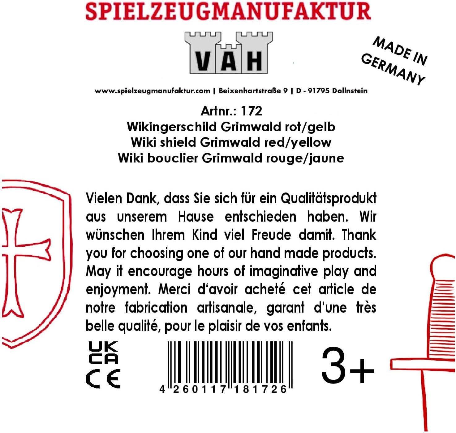 MADE IN GERMANY: Realizzato a mano con materie prime rinnovabili regionali a Dollnstein, in Baviera - Sopravvive a ogni battaglia e sembra eccezionale nel farlo. I giocattoli in legno come ai tempi dei nonni. SICURO DA MANEGGIARE: Grazie ai passanti saldamente rivettati in pelle rigenerata riciclata, il cartello si adatta perfettamente alla mano. ROBUSTO E SOSTENIBILE: colori innocui, materie prime rinnovabili, robusto pannello rigido, vero legno regionale e manico in pelle riciclata. Gioca senza sensi di colpa. GIOCARE CON UN EFFETTO DI APPRENDIMENTO: un motivo storico e un look autentico preparato per i bambini. Un pezzo di storia vivente da toccare. REGALA GIOIA: sia come costume per travestimenti o carnevale, giochi di ruolo, battaglie selvagge nella cameretta dei bambini o come regalo. Garantito per divertirti giocando a lungo. Si può combinare perfettamente con gli altri prodotti del negozio VAH.