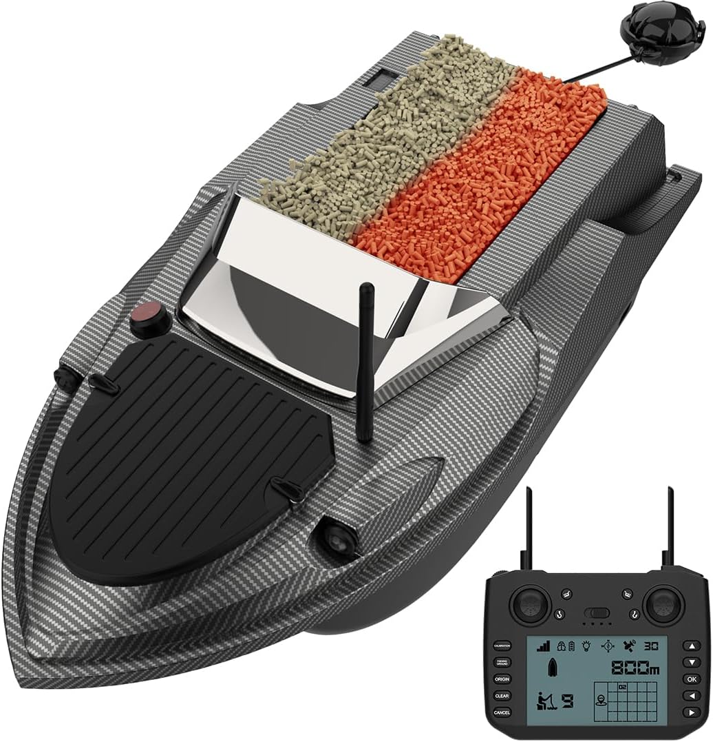 Gamma di controllo estesa e potenza ad alta velocità: dotata di un robusto sistema di alimentazione a 12 V e di propulsione a doppia azionamento, questa barca da esca raggiunge velocità impressionanti con due opzioni di marcia. Goditi fino a 800 metri di portata remota, perfetto per la copertura di aree ampie in laghi, fiumi o bacini idrici. Navigazione GPS di precisione e funzioni di crociera: supporta 9 zone di pesca e fino a 180 waypoint GPS, con caratteristiche come waypoint cruising, navigazione a velocità fissa, correzione automatica del percorso e ritorno a un tasto (inclusa batteria scarica e ritorno di perdita di segnale). La protezione elettronica della recinzione garantisce un funzionamento sicuro in ogni momento. Sistema intelligente a doppia tramoggia con capacità di carico pesante: personalizza la consegna dell'esca con tramogge singole/doppie commutabili, che contengono fino a 3 kg di esca. Utilizzare la funzione di rilascio del gancio e di caduta della rete per una configurazione efficiente della linea e un'esca mirata. Illuminazione migliorata per la pesca diurna e notturna: dispone di due luci di navigazione anteriori ad alta luminosità con due modalità di illuminazione, luci di segnalazione direzionali posteriori e avvisi automatici di batteria scarica, garantendo visibilità e sicurezza anche durante le sessioni di pesca notturne. Telecomando avanzato con schermo HD 4.3: il controller ergonomico include un display ad alta definizione da 4,3 pollici per dati in tempo reale e posizionamento visivo, offrendo un controllo e una facilità d'uso senza pari sia per i pescatori principianti che professionisti.