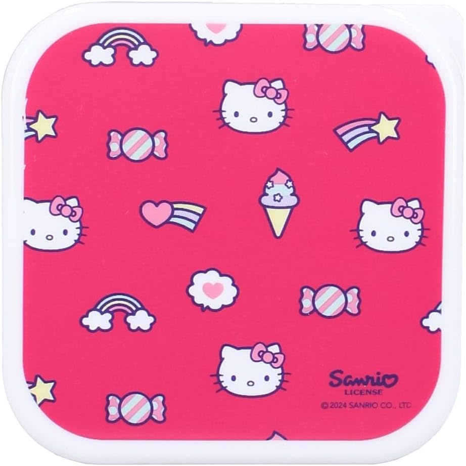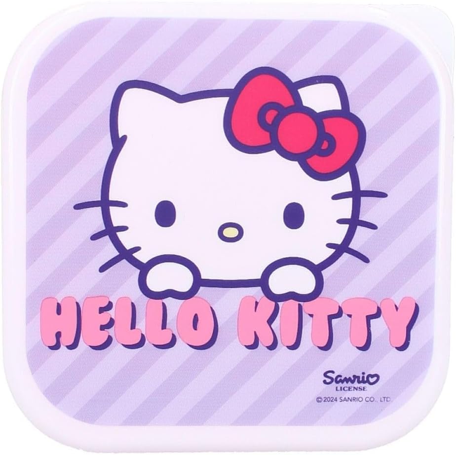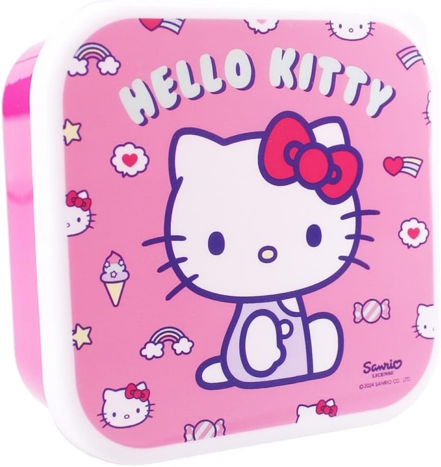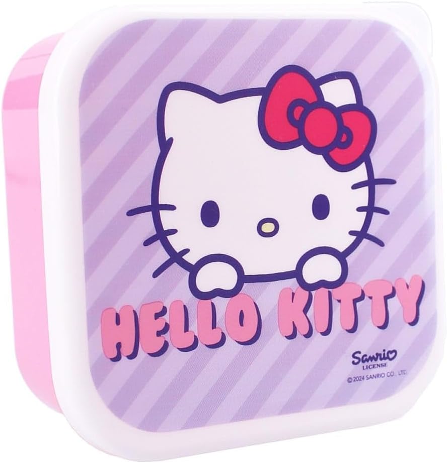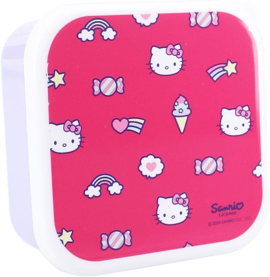 Queste scatole per snack 3 in 1 Hello Kitty della collezione "Fresh Bites" sono ideali per uno spuntino in viaggio. Ci sono 3 scatole per snack di diverse dimensioni/ogni scatola per snack ha una stampa unica del popolare personaggio Hello Kitty. Le scatole per snack si chiudono in modo sicuro e si incastrano facilmente. In questo modo sono comodi da riporre.