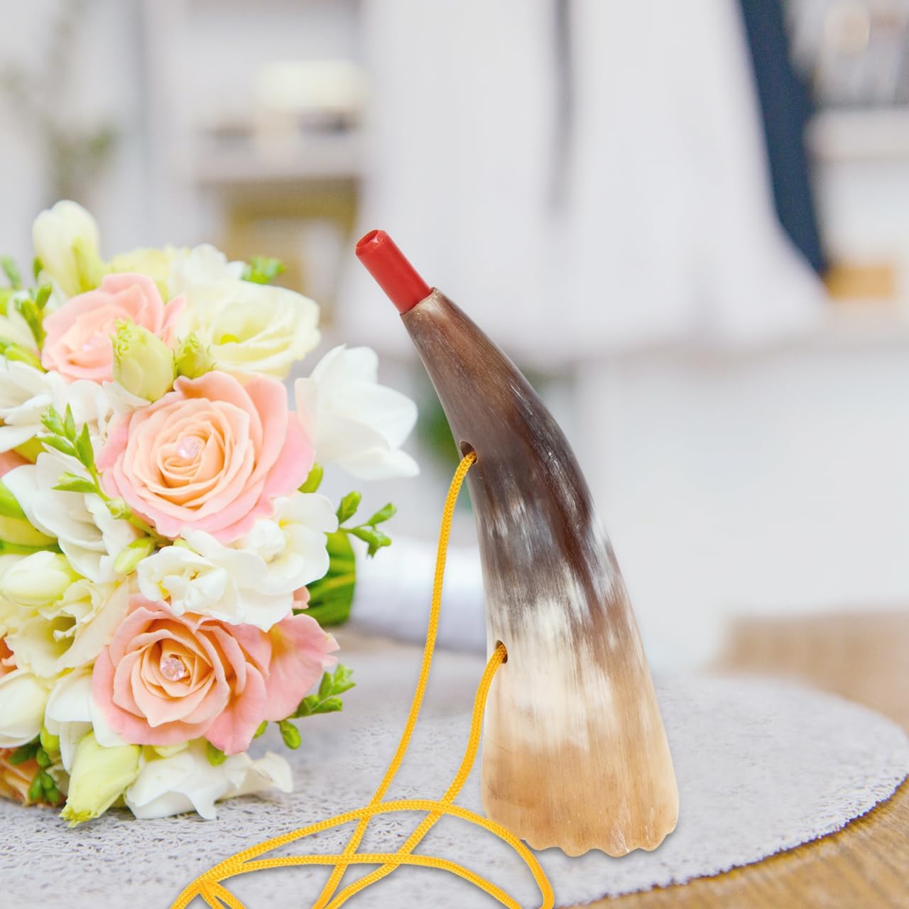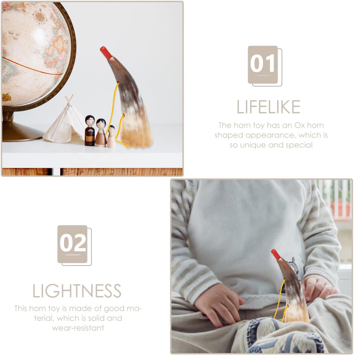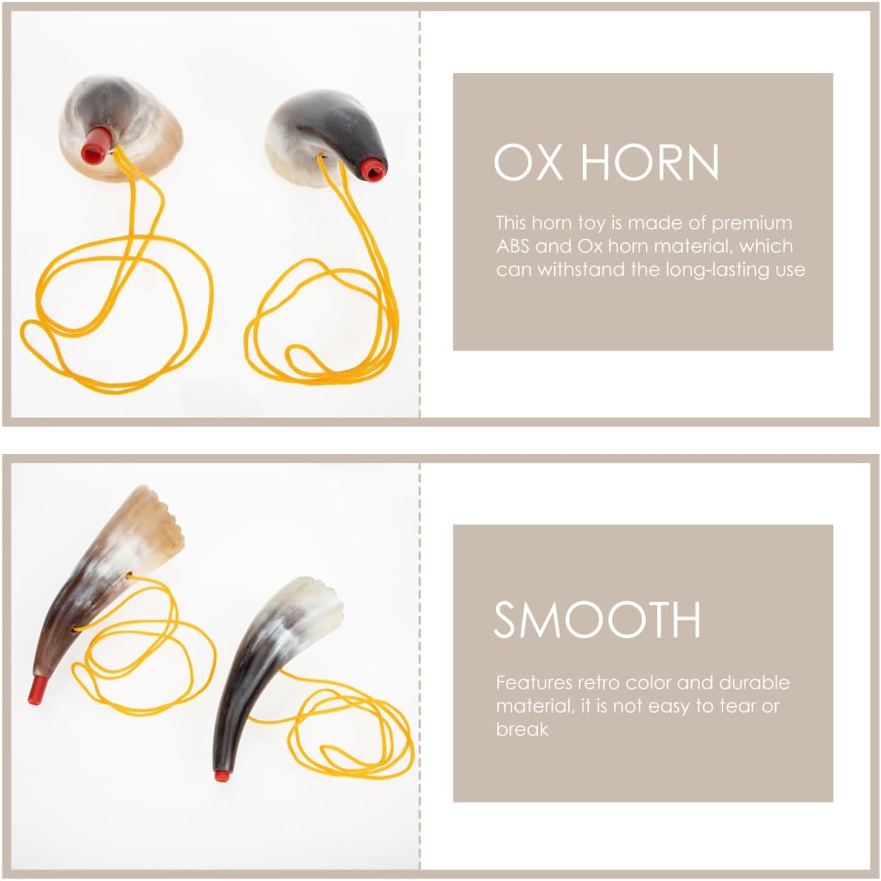 Il giocattolo in corno ha un aspetto a forma di corno di bue, unico e particolare. Il suono chiaro e croccante, il riverbero corto, il giocattolo in corno può fare un bel suono. Il giocattolo ha una meravigliosa produzione di suoni e può fornire suoni straordinari e bei rumori. Progettato con un cordino, il giocattolo in corno può essere appeso al collo o alla mano, facile da trasportare e riporre. Questo giocattolo in corno è realizzato in buon materiale .