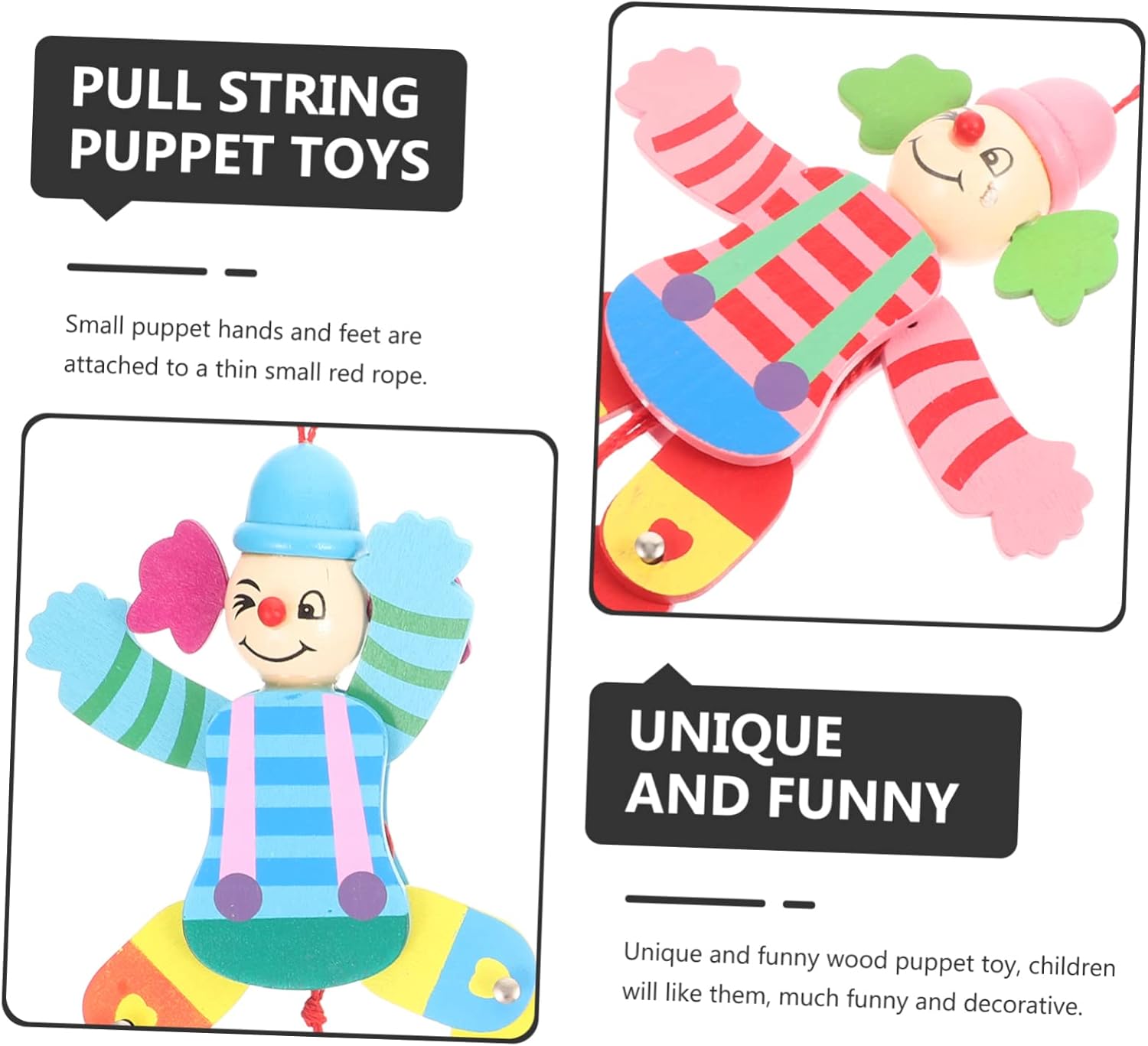 Giocattoli interattivi: pregevole fattura con aspetto attraente, adatto per decorare soggiorno, festa, caffetteria o qualsiasi occasione di vacanza, divertente marionetta Marionette divertenti: vivido design dall'aspetto da clown con colori vivaci, può esercitare la flessibilità e la creatività delle dita dei bambini, burattini marionetta Marionetta da clown: la marionetta da clown può portare più divertimento a casa quando non possono giocare, burattina da clown in legno Marionetta: il giocattolo intellettuale può dare abilità pratica e capacità di pensiero ai bambini, la tua adorerà un giocattolo divertente, un burattino da clown Oggetto di scena per spettacoli di marionette: il divertente burattino marionetta dal design da clown può essere un giocattolo interattivo tra bambini e genitori, burattino di legno