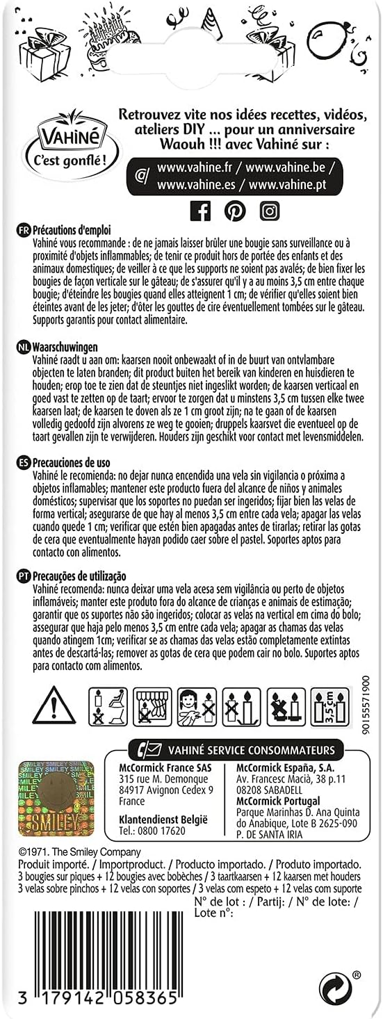 CREA, DECORA E REINVENDITA I Dessert PIÙ FELICI! : Le nostre candele Smiley offrono un mondo di possibilità per decorare i tuoi dolci e torte di compleanno. Sorprendi grandi e piccoli con una festa 100% trendy e divertente. 1971 The Smiley Company CANDELE DI COMPLEANNO PER BAMBINI: Ogni confezione contiene due tipi di candele Smiley. Troverete nel 3 candele rotonde su spiedini, ognuna con uno smiley diverso e 12 candele classiche con stampa Smiley. IL NOSTRO CONSIGLIO DEGLI ESPERTI - Completa la decorazione della tua torta di compleanno Smiley con le decorazioni di zucchero Smiley di Vahiné! Scopri l'ampia varietà di candele Vahiné: candele di unicorno, candele per adulti, safari, numeri... Il sigillo di qualità Vahiné: Vahine, un marchio di qualità, affidabile e innovativo, con oltre 40 anni addolcire i momenti più speciali. VAHINÉ SI IMPEGNATO: Obiettivi 2025: Riduzione del 25% dell'impronta di carbonio, 60% dei materiali riciclati nei nostri imballaggi PET, 100% dei nostri imballaggi in plastica riutilizzati, riutilizzati o rivalutati.