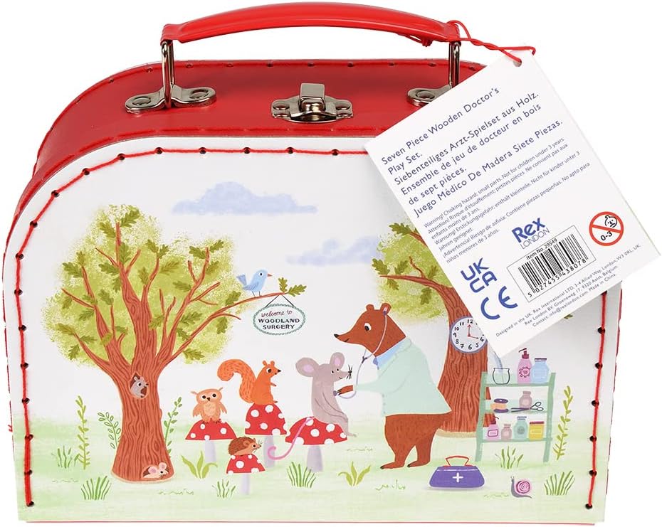 Questo set di 7 giocattoli in legno dal design accattivante è l'ideale per far giocare il tuo bambino come medico Il set viene fornito in una valigetta da medico di alta qualità con manico stampato con scene degli amici del bosco Il kit da sette pezzi include: osteotoscopio, termometro, martello per il test dei riflessi, siringa, flacone medico, tubo per dongue o materiale per medicazioni Non adatto a bambini di età inferiore a 3 anni Il prodotto è realizzato in legno, cartone, PVC e cotone. Misura 7 pollici di larghezza, 8 pollici di lunghezza e 3 pollici di altezza