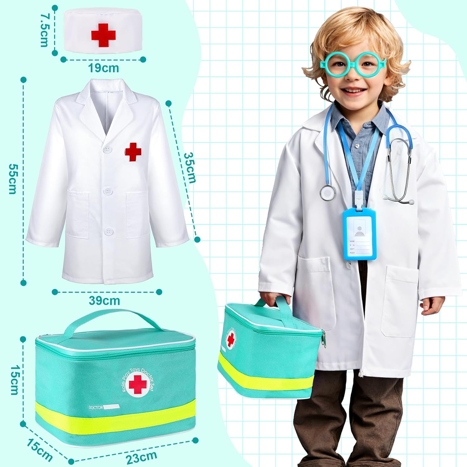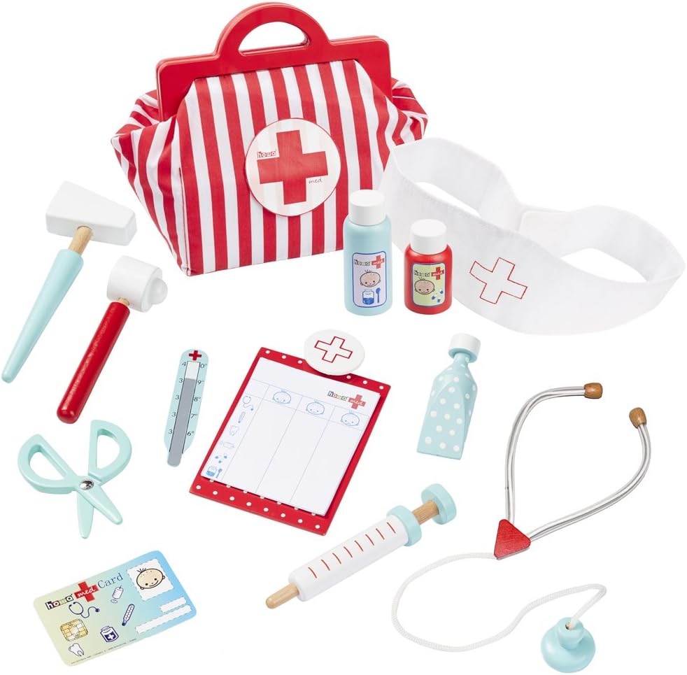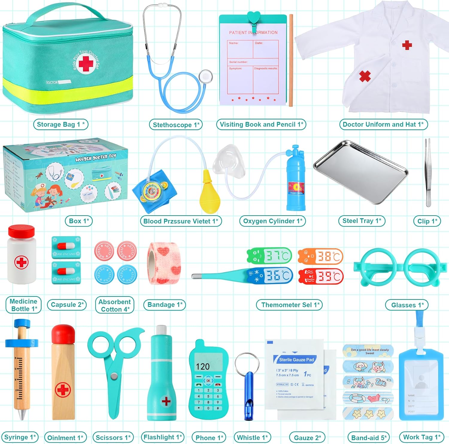 【Tutto ciò di cui ha bisogno il tuo piccolo dottore】Oltre 32 strumenti realistici! Il valigetta dottore bambini è completamente equipaggiato con: 1 * Borsa portaoggetti, 1 * Telefono, 1 * Termometro Sel, 1 * Misuratore di pressione del sangue, 1 * Siringa, 1 * Stetoscopio, 1 * Torcia elettrica, 1 * Unguento, 1 * Etichetta di lavoro, 1 * Flacone di medicinali, 1 * Uniforme e cappello da dottore, 1 * Forbici, 1 * Occhiali, 1 * Libro delle visite e matita, 1 * Bombola di ossigeno, 2 * Garza, 1 * Vassoio in acciaio, 2 * Capsule, 1 * Benda, 4 * Cotone assorbente, 1 * Fischietto, 5 * Cerotti, 1 * Clip, il tuo bambino si sentirà un vero dottore con questo set completo! 【Stimola la creatività e l'apprendimento attraverso il gioco】Con il valigetta dottore bambini, il tuo bambino può: ① Utilizzare lo stetoscopio per "ascoltare" i battiti cardiaci. ② Prendere la "temperatura" con il termometro. ③ "Curare" i pazienti con la siringa, le bende e i flaconi di medicinali. Questo set non solo intrattiene, ma insegna anche concetti medici di base e promuove l'empatia. 【Sicuro, durevole e progettato per i bambini】Realizzato con materiali di alta qualità e atossici, il valigetta dottore bambini è costruito per durare. I pezzi di legno sono lisci e senza schegge, mentre gli accessori sono robusti e sicuri per le manine dei più piccoli. I genitori possono rilassarsi sapendo che il loro bambino sta giocando con un giocattolo sicuro e affidabile. 【Tieni tutto organizzato con la borsa portaoggetti inclusa】Niente più pezzi persi! Il valigetta dottore bambini è dotato di una comoda borsa portaoggetti per tenere tutti i 32+ articoli ordinatamente organizzati. Insegna al tuo bambino la responsabilità incoraggiandolo a riporre tutto dopo il gioco: è una vittoria per genitori e bambini! 【Perfetto per fratelli o per i playdate: ore di divertimento condiviso!】Con così tanti strumenti e accessori, il valigetta dottore bambini è perfetto per il gioco di gruppo. I bambini possono fare a turno nel ruolo di dottore, infermiere o paziente, creando scenari infiniti come: ① Usare il vassoio in acciaio e le forbici per "l'intervento chirurgico". ② Fasciare le "ferite" con bende e garze. ③ Scrivere prescrizioni nel libro delle visite. È un modo fantastico per incoraggiare il lavoro di squadra e l'interazione sociale!