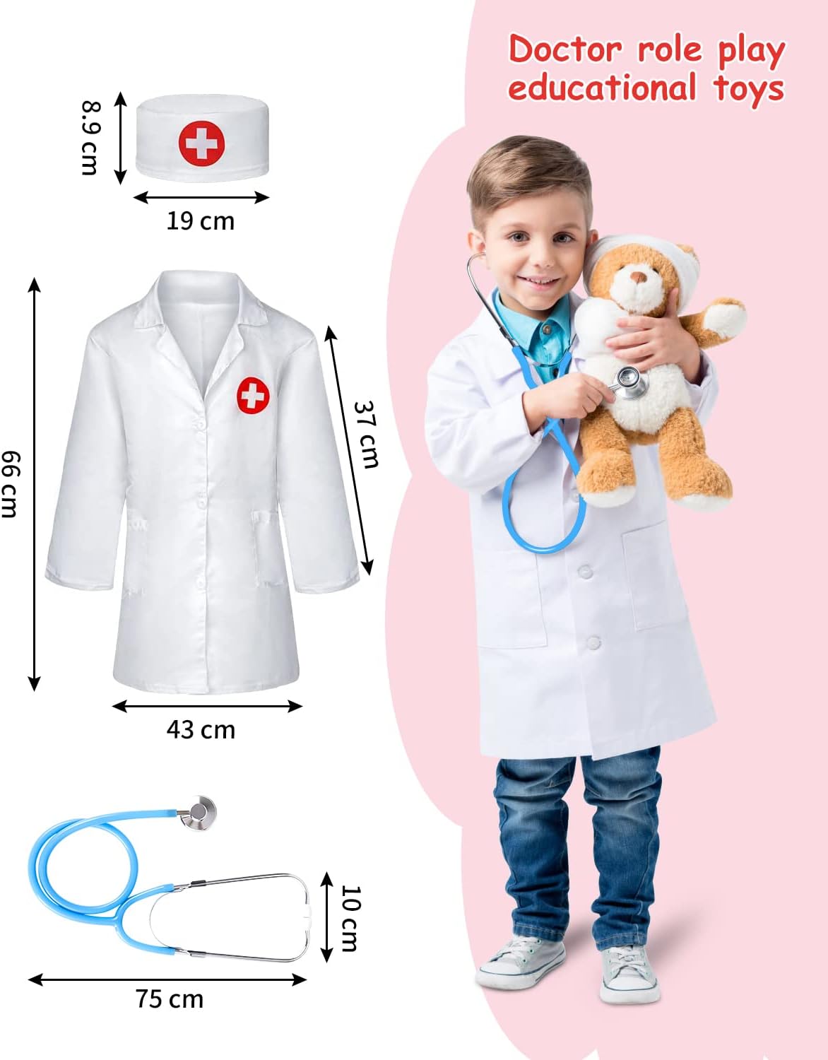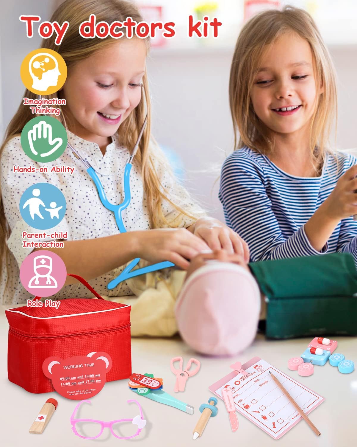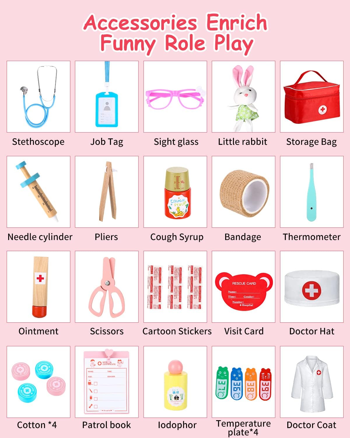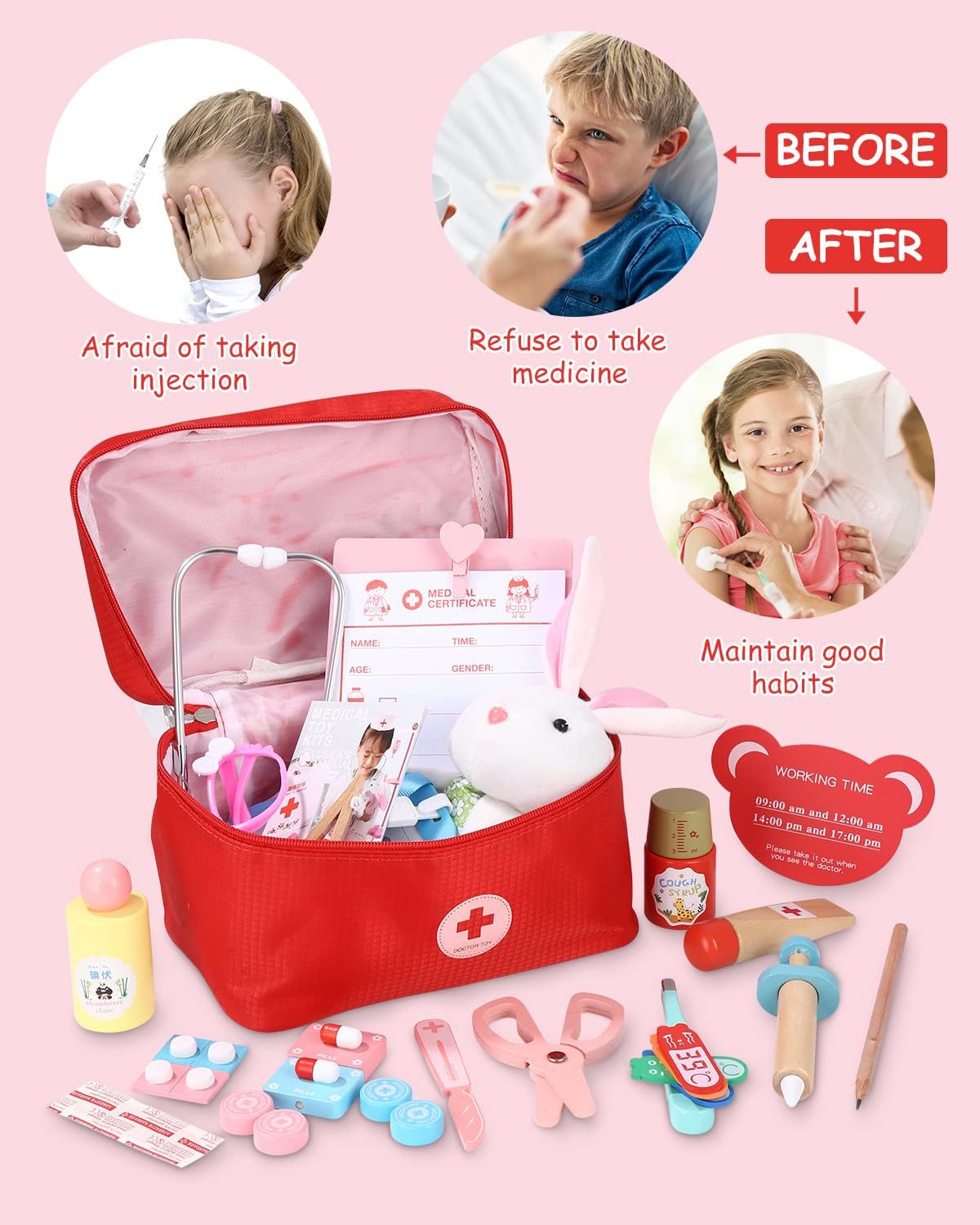 👩⚕️37 pezzi set medico per il gioco dei bambini con gioco di ruolo realistico per la cura dei pazienti per esaminare e trattare i pazienti. ✨Contiene vero stetoscopio, camice e cuffia da medico, siringa di legno, pinzette, capsule, forbici di legno, bambola coniglio, occhiali, termometro, benda e vari accessori realistici per la pulizia e il trattamento dei denti. 😃Non tossico e sicuro, ogni pezzo è dipinto con vernici atossiche e realizzato con risorse rinnovabili, il bordo liscio e morbido è sicuro per i bambini dai 3 anni in su, incoraggia l'immaginazione e le capacità di pensiero. ❤️Regalo per bambini dai 3 anni in su, può ridurre la sensazione di stress associata a una visita dal medico e incoraggia il gioco immaginativo, di cura e di compassione. 🚀JOFLVA progetta ogni giocattolo secondo i più alti standard di qualità per nutrire le menti e i cuori. Se non siete soddisfatti di uno dei nostri prodotti, contattateci e vi aiuteremo a risolvere immediatamente il problema.