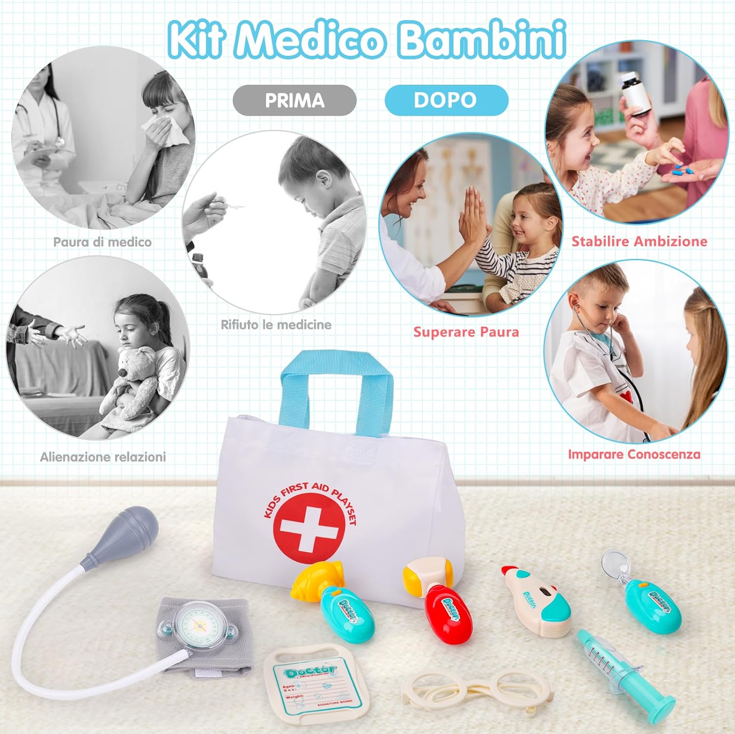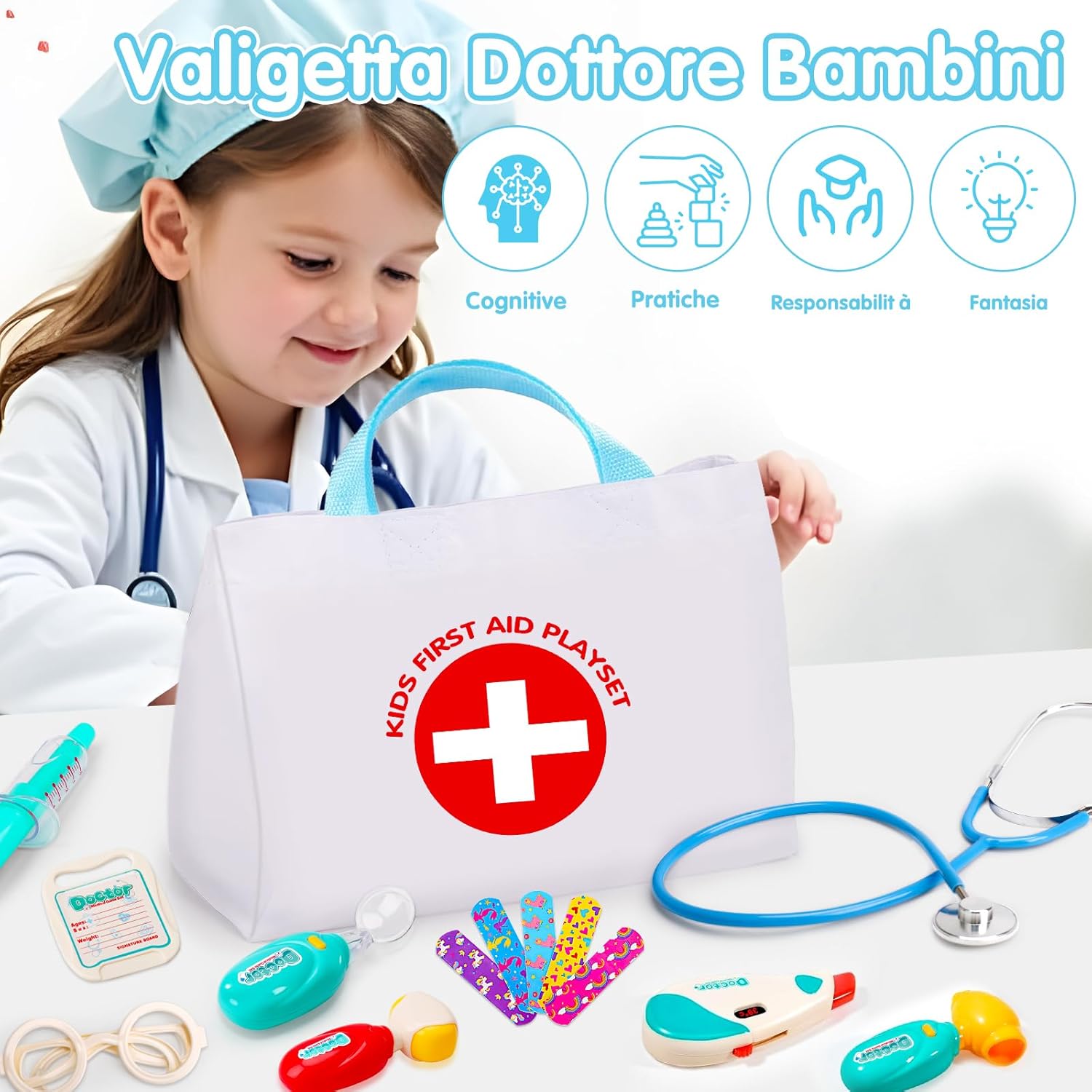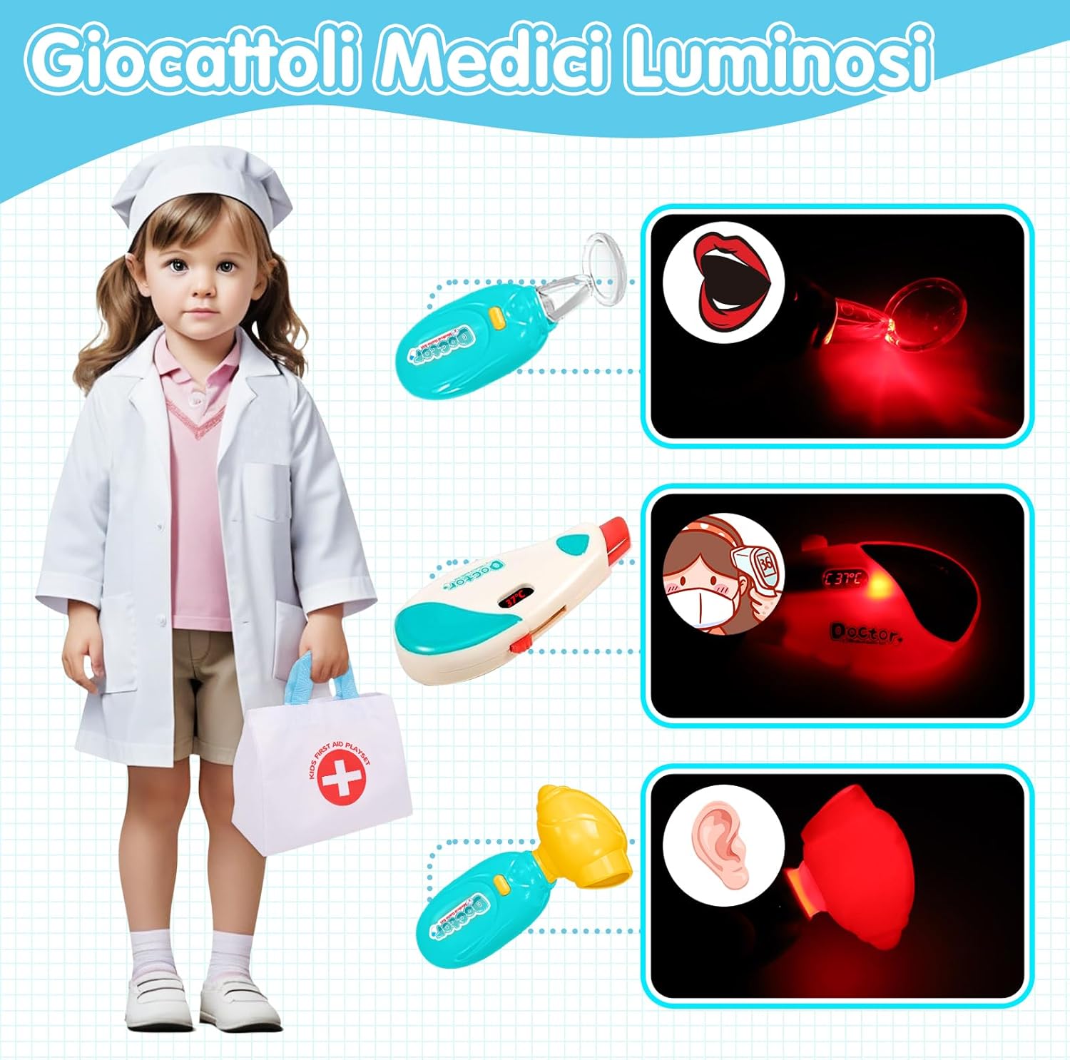 Valigetta Dottore Bambini Realistico: Lo stetoscopio permette di ascoltare il battito cardiaco, mentre lo specchietto dentale, l'otoscopio e il termometro si illuminano per un effetto ancora più realistico! Il nostro kit medico per bambini include anche una borsa di stoccaggio, occhiali decorativi, sfigmomanometro, siringa, martelletto riflessologico, cartellino e cerotti. I bambini potranno divertirsi con giochi di ruolo da dottore e imparare nozioni mediche. Giochi bambini 2 3 4 5 6 anni Sicurezza e Alta Qualità Valigetta Dottore Bambini: Il nostro kit dottoressa bambina è realizzato in materiali premium, senza bordi taglienti, ideale per stimolare il tatto e la fantasia in modo sicuro. I bambini potranno usare nostro kit dottore per curare bambole, animali domestici, amici o familiari, migliorando la coordinazione occhio-mano e sviluppando creatività e immaginazione. Regalo perfetto per bambina bambino 2 3 4 5 6 anni femmina maschio. Gioco bambina bambino 2 3 4 5 6 anni Giocattoli Educativi per Superare la Paura del Dottore: Oltre a essere un gioco di ruolo, questo set da medico gioco aiuta i bambini dai 2 agli 8 anni a sviluppare abilità sociali come comunicazione ed empatia, riducendo l'ansia legata alle visite mediche. Trasforma la paura del dottore in divertimento! Ideale dottore gioco per bambine e bambini. Kit gioco dottoressa bambina. Kit gioco dottore bambino. Valigetta dottore bambini. Valigetta dottoressa bambina Facile da Riporre e Portare con Borsa di Stoccaggio: Il set include una pratica borsa per riporre tutti gli accessori, comoda da trasportare grazie alla maniglia ergonomica. Perfetta per organizzare il gioco dopo l'uso e portare il kit ovunque, sia a casa che in viaggio. Giochi bambini bambina bambino 2 3 4 5 6 anni femmina maschio, kit dottoressa bambina, kit dottore bambino, valigetta dottore bambini, valigetta dottoressa bambina Regalo Bambina Bambino 2 3 4 5 6 anni: Progettato per manine piccole e facile da afferrare, questo set medico è un'ottima idea regalo per Natale, Halloween, compleanni, feste e altre occasioni. Offre un'esperienza di gioco realistico e divertente, perfetta per bambine e bambini dai 2 agli 8 anni. Kit medico bambini con stetoscopio giocattolo, kit dottore bambino, Set dottoressa bambina, Set dottore bambino, gioco dottore, kit medico giocattolo, giochi dottore infermiera
