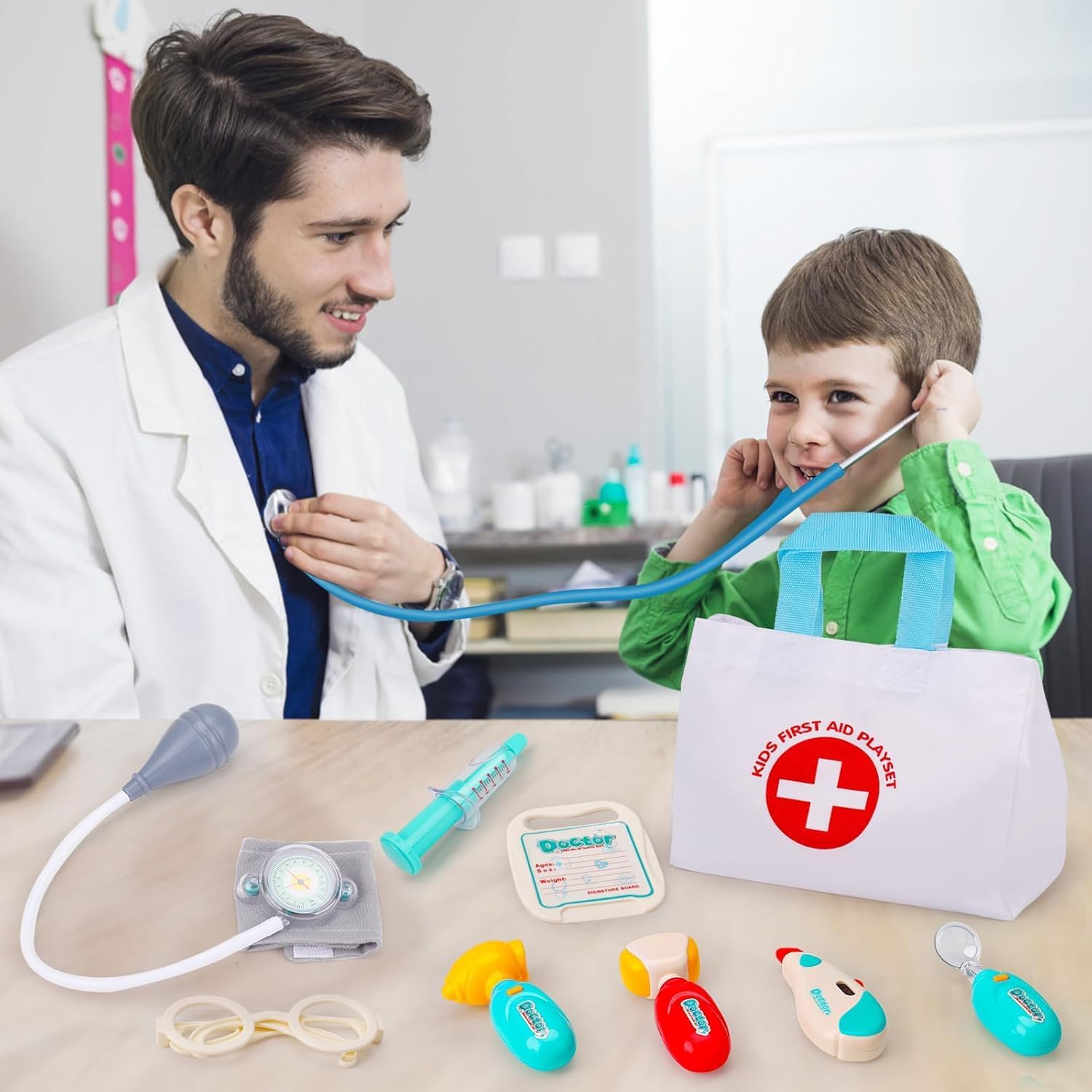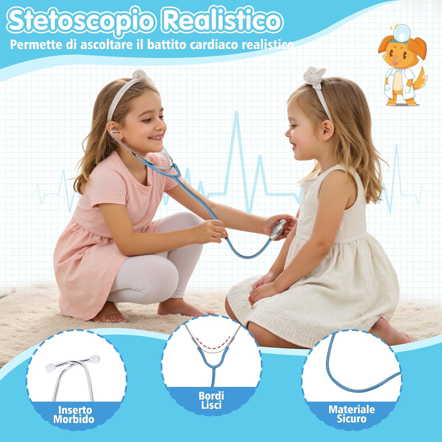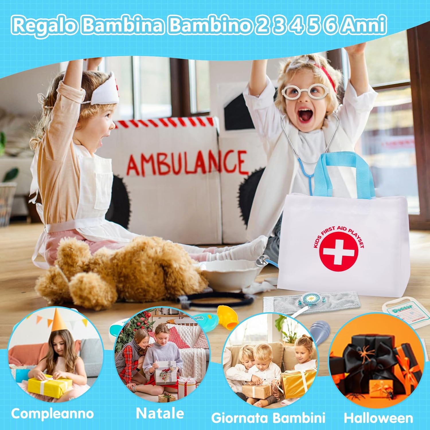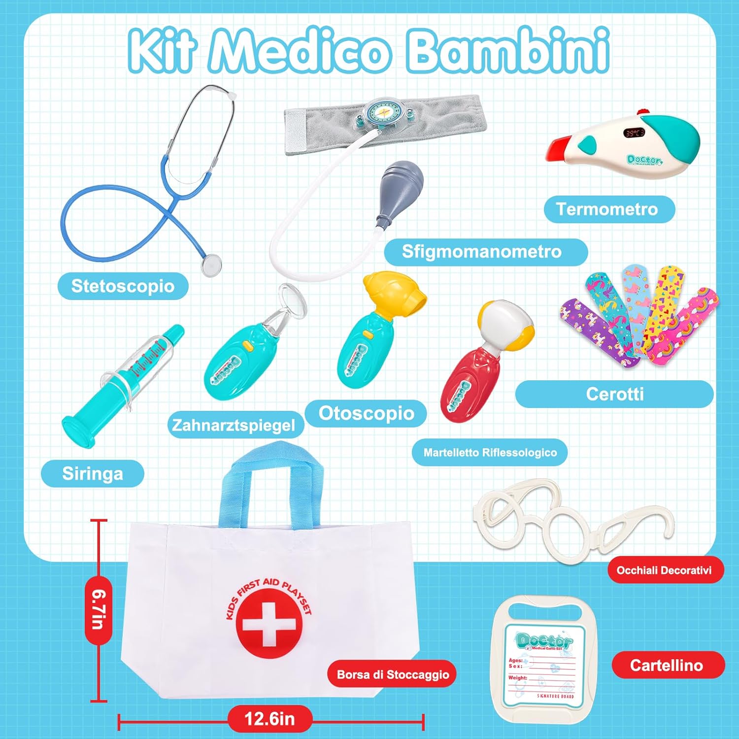 Valigetta Dottore Bambini Realistico: Lo stetoscopio permette di ascoltare il battito cardiaco, mentre lo specchietto dentale, l'otoscopio e il termometro si illuminano per un effetto ancora più realistico! Il nostro kit medico per bambini include anche una borsa di stoccaggio, occhiali decorativi, sfigmomanometro, siringa, martelletto riflessologico, cartellino e cerotti. I bambini potranno divertirsi con giochi di ruolo da dottore e imparare nozioni mediche. Giochi bambini 2 3 4 5 6 anni Sicurezza e Alta Qualità Valigetta Dottore Bambini: Il nostro kit dottoressa bambina è realizzato in materiali premium, senza bordi taglienti, ideale per stimolare il tatto e la fantasia in modo sicuro. I bambini potranno usare nostro kit dottore per curare bambole, animali domestici, amici o familiari, migliorando la coordinazione occhio-mano e sviluppando creatività e immaginazione. Regalo perfetto per bambina bambino 2 3 4 5 6 anni femmina maschio. Gioco bambina bambino 2 3 4 5 6 anni Giocattoli Educativi per Superare la Paura del Dottore: Oltre a essere un gioco di ruolo, questo set da medico gioco aiuta i bambini dai 2 agli 8 anni a sviluppare abilità sociali come comunicazione ed empatia, riducendo l'ansia legata alle visite mediche. Trasforma la paura del dottore in divertimento! Ideale dottore gioco per bambine e bambini. Kit gioco dottoressa bambina. Kit gioco dottore bambino. Valigetta dottore bambini. Valigetta dottoressa bambina Facile da Riporre e Portare con Borsa di Stoccaggio: Il set include una pratica borsa per riporre tutti gli accessori, comoda da trasportare grazie alla maniglia ergonomica. Perfetta per organizzare il gioco dopo l'uso e portare il kit ovunque, sia a casa che in viaggio. Giochi bambini bambina bambino 2 3 4 5 6 anni femmina maschio, kit dottoressa bambina, kit dottore bambino, valigetta dottore bambini, valigetta dottoressa bambina Regalo Bambina Bambino 2 3 4 5 6 anni: Progettato per manine piccole e facile da afferrare, questo set medico è un'ottima idea regalo per Natale, Halloween, compleanni, feste e altre occasioni. Offre un'esperienza di gioco realistico e divertente, perfetta per bambine e bambini dai 2 agli 8 anni. Kit medico bambini con stetoscopio giocattolo, kit dottore bambino, Set dottoressa bambina, Set dottore bambino, gioco dottore, kit medico giocattolo, giochi dottore infermiera