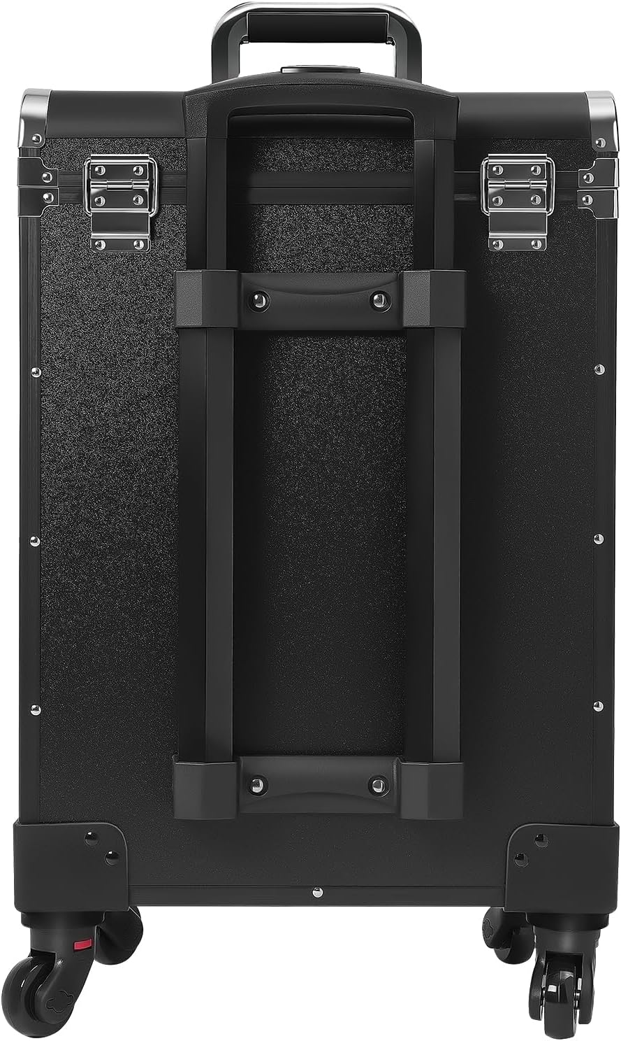 MATERIALI DI ALTA QUALITÀ: il telaio della valigetta per il trucco è rivestito con una lega di alluminio di alta qualità, che non arrugginisce e non sbiadisce facilmente. E la barra di trazione in alluminio più spessa rende la valigia più stabile e non la fa oscillare GRANDE CAPACITÀ: questa valigetta per il trucco ha 3 strati, lo strato superiore può contenere smalto o rossetto; i due cassetti inferiori possono contenere cosmetici a grandezza naturale e dispositivi di bellezza, come permanenti, manicure e dispositivi di terapia della luce ECCELLENTE PORTABILITÀ: la struttura rettangolare e il telaio in lega di alluminio conferiscono alla valigia un'eccellente capacità di carico (fino a 110,3 libbre). Puoi conservare tutti i tuoi capelli e gli strumenti di bellezza in modo sicuro FACILE DA SPOSTARE E TRASPORTO: le ruote universali sono facili da spostare e molto pratiche, soprattutto per saloni di bellezza e saloni di bellezza che hanno un sacco di strumenti e devono muoversi frequentemente SICURO & AFFIDABILE: le serrature in metallo della valigetta proteggono il contenuto in modo sicuro e il design con serratura garantisce sicurezza e privacy. Inoltre è dotato di un'asta telescopica (lunghezza massima: 32,7 pollici) e di una maniglia sulla parte superiore