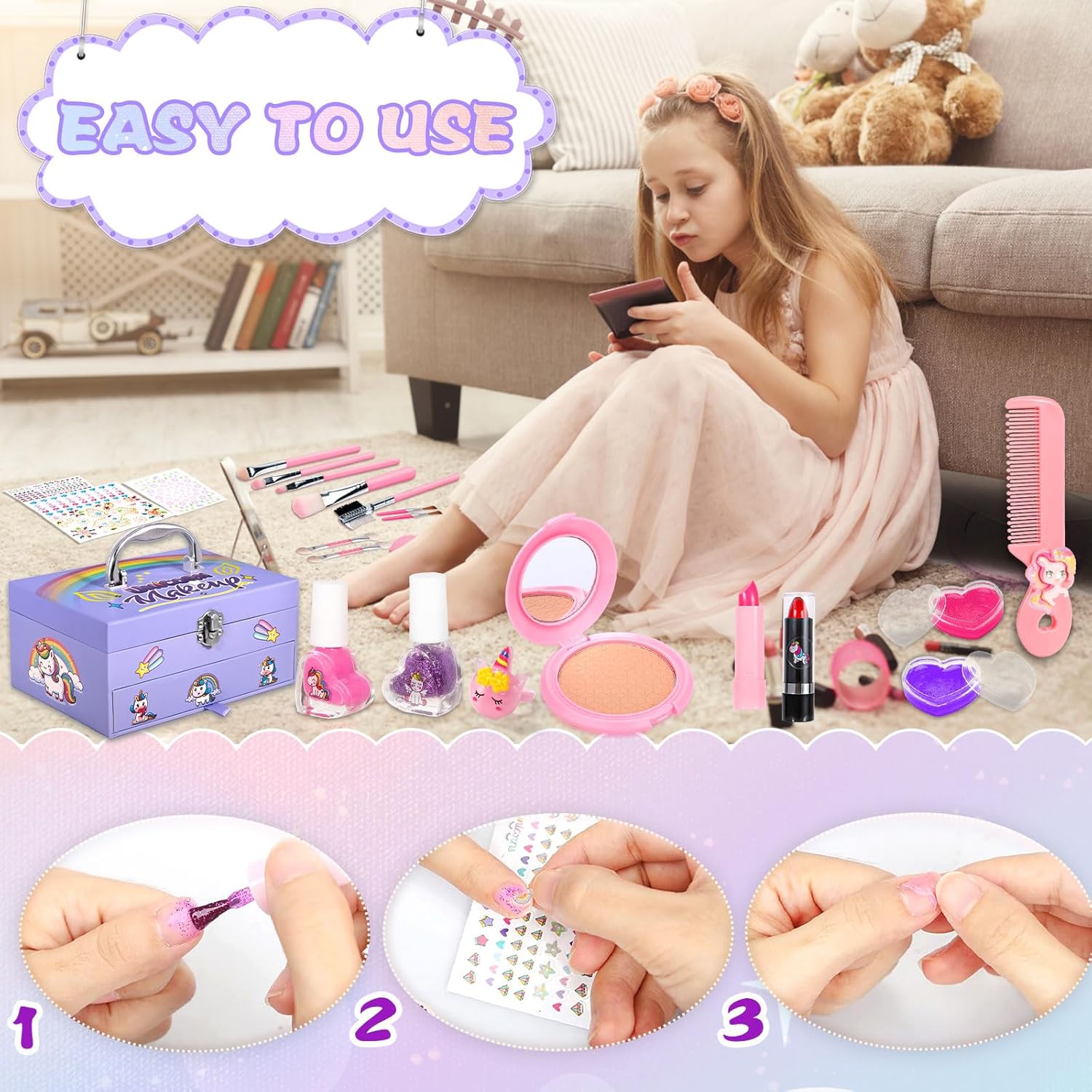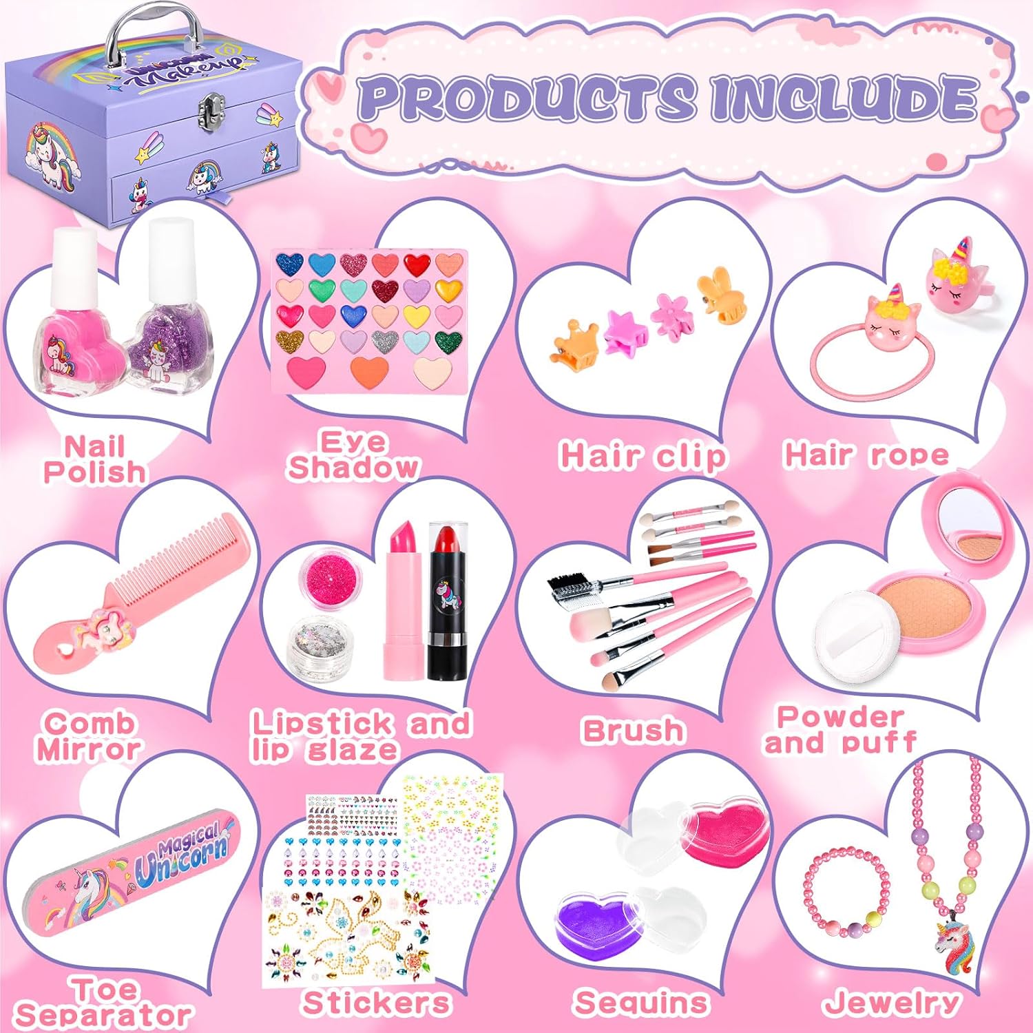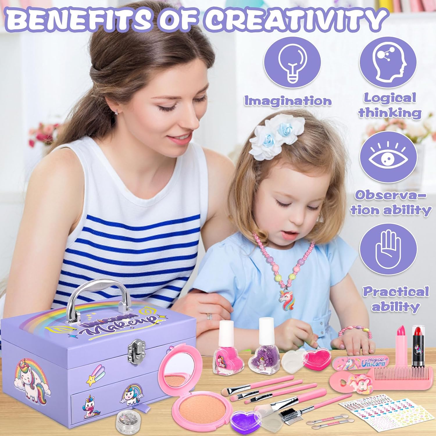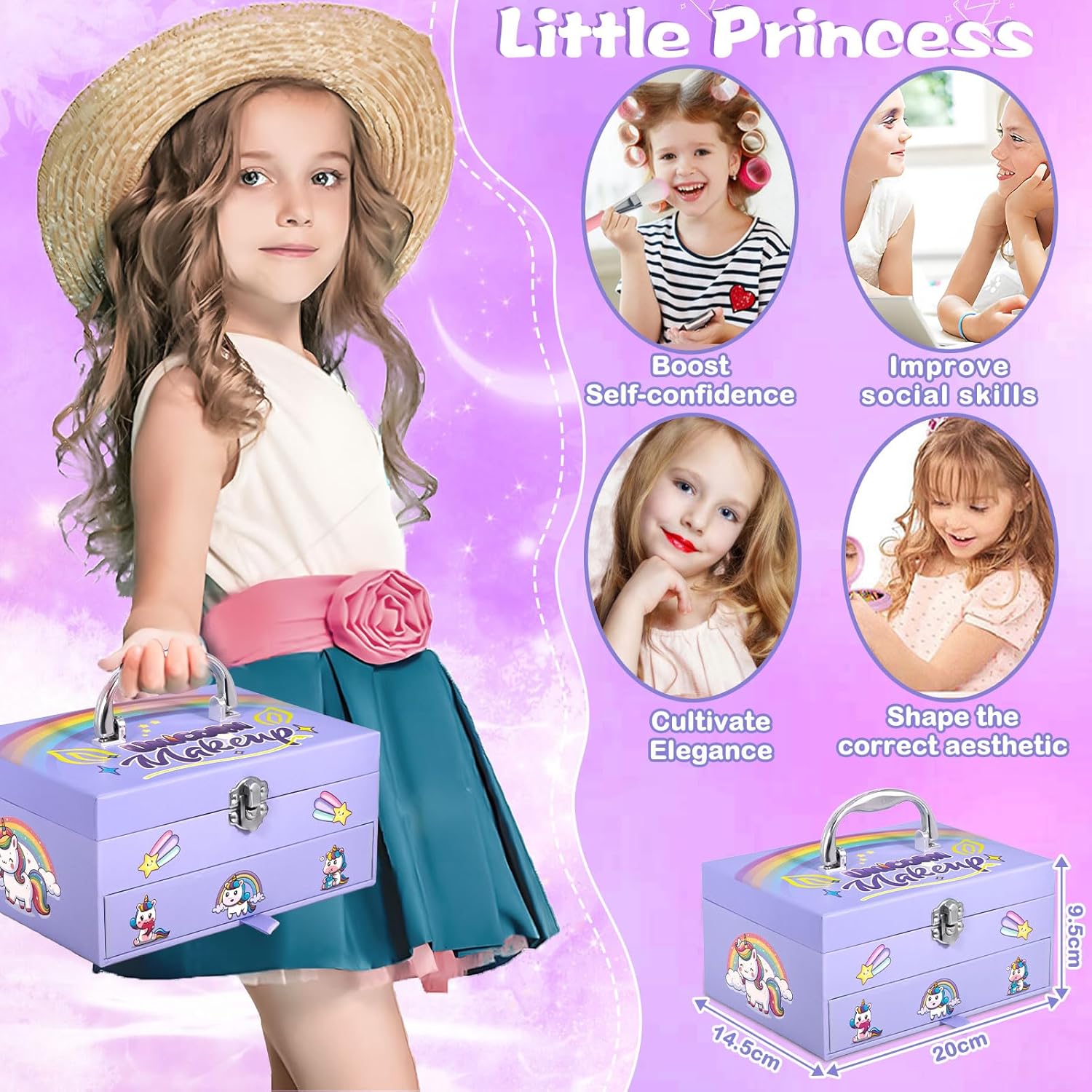 🌸Set trucco 68 pezzi per ragazze e bambini: set trucco per bambini per ragazze, set trucco 68 pezzi. 1 cipria compatta, 1 tavolozza di ombretti (24 colori), 3 fard in polvere, 2 rossetti, 2 lucidalabbra, 2 polvere glitter, 2 smalti per unghie, 5 adesivi per unghie per bambini, 9 pennelli per trucco, 1 matita per sopracciglia, 1 spugna per trucco, 1 separatore per dita, 1 lima per unghie, 1 pettine, 1 adesivo con strass, 1 braccialetti, 1 collane con unicorno, 1 elastico per capelli, 1 custodia per cosmetici unicorno 🌸Cosmetici per bambini lavabili e non tossici: set di trucchi per bambini per ragazze, il nostro set di trucchi per bambini è realizzato con materiali sicuri solubili in acqua. Il set trucco per bambini per ragazze può essere lavato via con acqua e sapone, non irrita e perfetto per la pelle dei bambini, trucco per neonati e bambine. Un gioco di ruolo sicuro per bambini con cui la tua piccola principessa potrà divertirsi per ore. Rimuovere con carta assorbente umida e poi lavare. 🌸Incredibile set trucco per bambini: custodia per il trucco per ragazze, questo set trucco per ragazze e bambini ha molti cassetti e scomparti con molti set trucco e pennelli per ragazze e bambini. I colori sono vibranti e brillanti, perfetti per stimolare la fantasia del tuo bambino. Il beauty case per ragazze contiene tutto ciò di cui una principessa ha bisogno, splendidamente confezionato in un incantevole astuccio per scoprire e soddisfare la sua curiosità e bellezza. 🌸Educativo e divertente: beauty case per bambini, questa borsa è dotata di manico per permettere alle bambine di portarla facilmente in macchina o in vacanza. Una ragazza può facilmente portare con sé la sua amata borsa per cosmetici ovunque. Il nostro set di giocattoli per il trucco lavabile contiene numerosi accessori che ispirano e incoraggiano la creatività, l'immaginazione, l'estetica e l'apprendimento del tuo bambino, offrendo allo stesso tempo un grande divertimento. 🌸Regalo ideale per ragazze: trucco per bambini per ragazze, tuo figlio sorriderà e sarà felice quando riceverai questo bellissimo set di trucco per ragazze. Acquista il set di trucchi per ragazze come regalo per la tua dolce principessa e insegnale. Questo è il regalo di compleanno, il regalo di Halloween, il regalo di Natale e il regalo perfetto per la festa dei bambini per ragazze di 3, 4, 5, 6, 7, 8 e 9 anni.
