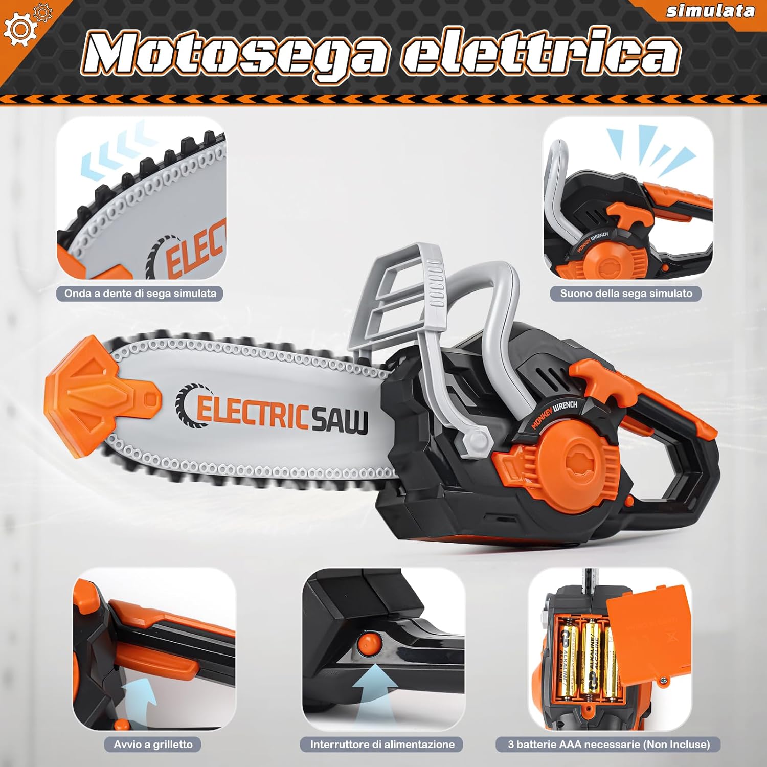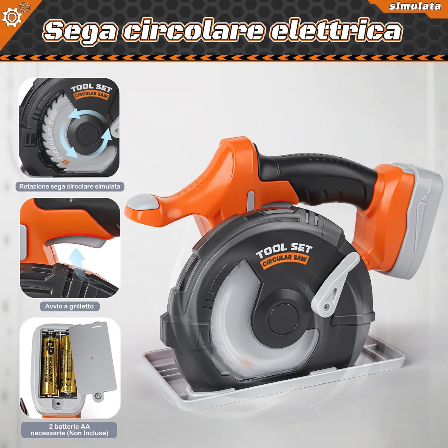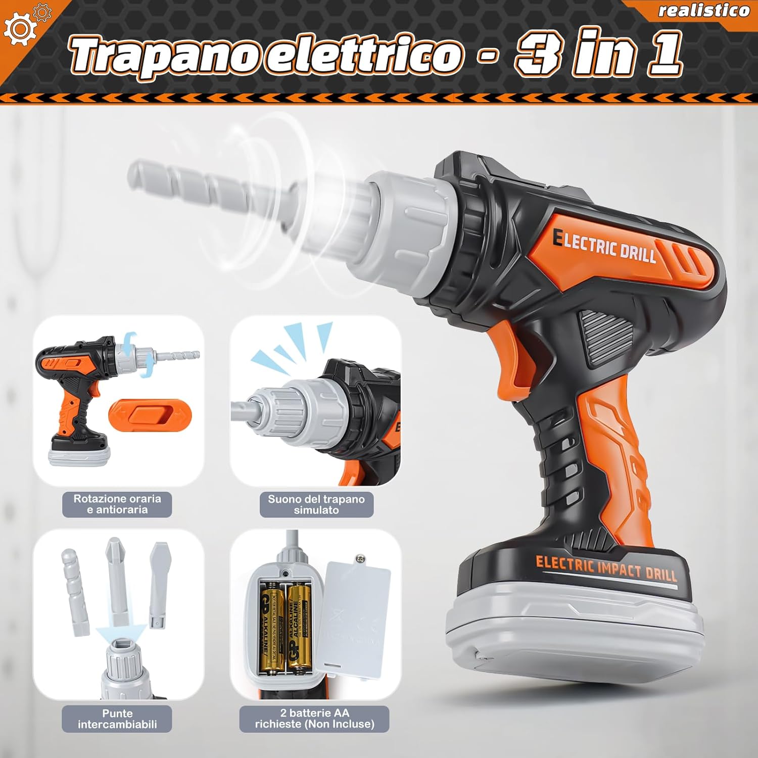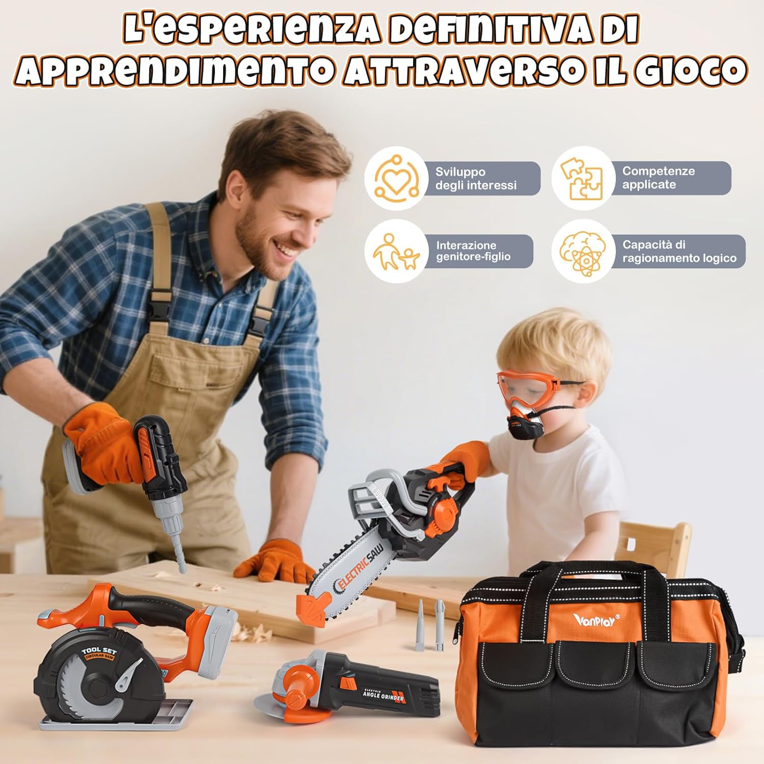 【Set completo di strumenti educativi per bambini, stimola la creatività】Questo set di giocattoli strumenti da lavoro Vanplay include un trapano simulato, una sega circolare, una sega alternativa e una levigatrice. Ideale per attività genitore-figlio o giochi collaborativi con gli amici, permette ai bambini di apprendere il funzionamento degli strumenti mentre sviluppano la creatività. 【Design realistico ed effetti sonori per un gioco immersivo】Gli accessori richiedono 9 batterie AA (non incluse). Una volta alimentati, gli strumenti simulano movimenti realistici con effetti sonori, offrendo un'esperienza coinvolgente che migliora la concentrazione durante il gioco. 【Materiali sicuri e durevoli per la crescita】Vanplay utilizza plastica ABS di alta qualità, garantendo sicurezza e robustezza. Progettato per resistere all'uso intensivo, accompagna lo sviluppo dei bambini con un'attenzione particolare ai dettagli. 【Borsa di storage pratica e portatile】La borsa inclusa permette ai bambini di riporre e trasportare facilmente gli strumenti, evitando la perdita dei pezzi e sviluppando il senso dell'organizzazione. Perfetta per giochi di ruolo in interno e esterno. 【Regalo ideale per i bambini】Confezionato in un'elegante scatola regalo, è perfetto per compleanni o feste. Consigliato dai 3 anni in su, favorisce i giochi di ruolo, migliora la coordinazione e stimola l'immaginazione.