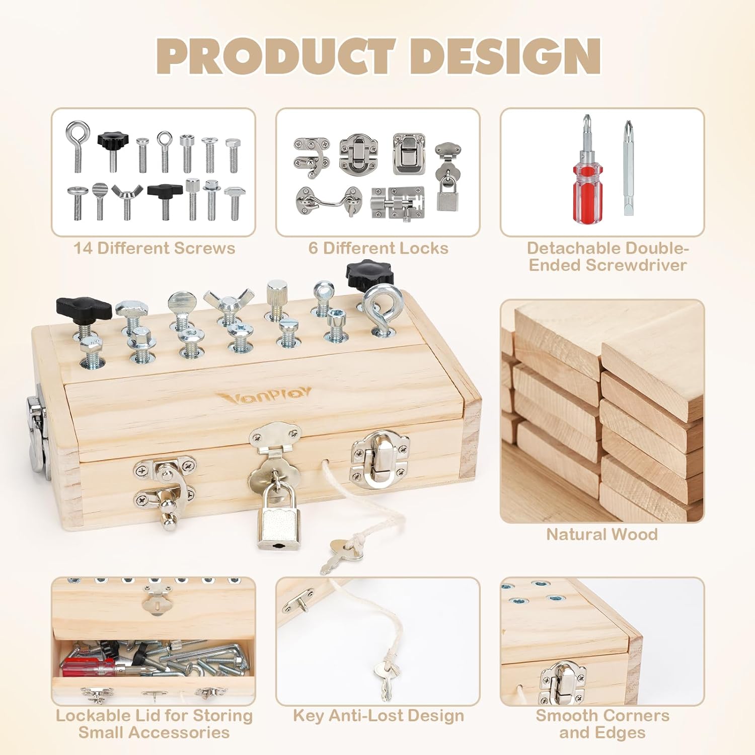 [Set di cacciaviti Montessori] Questo set di cacciaviti, sviluppato secondo i principi dei giocattoli Montessori, promuove la concentrazione, la coordinazione e l'indipendenza attraverso attività pratiche. [Giocattolo per le abilità motorie] Con 14 viti, 4 utensili e 6 blocchi, esercita a girare, torcere e allentare. Il set di cacciaviti Montessori promuove la destrezza delle dita e la coordinazione occhio-mano. [Giocattolo da viaggio per bambini piccoli] Tutti gli utensili e le viti possono essere conservati in una scatola giocattolo in legno Montessori con serratura, così i bambini possono portarli ovunque. Un giocattolo da viaggio ideale per i più piccoli su aerei, treni e auto. [Design in legno sicuro] Realizzato in legno naturale e liscio con bordi arrotondati e robuste parti in metallo per un gioco sicuro per bambini dai 3 anni in su. Tutti gli utensili hanno dimensioni adatte a mani piccole. [Ottimo regalo educativo] Il regalo perfetto per bambini e bambine di 3, 4, 5 e 6 anni per compleanni, vacanze o attività prescolari. Un modo giocoso e interattivo per insegnare competenze pratiche di vita fin dalla tenera età.