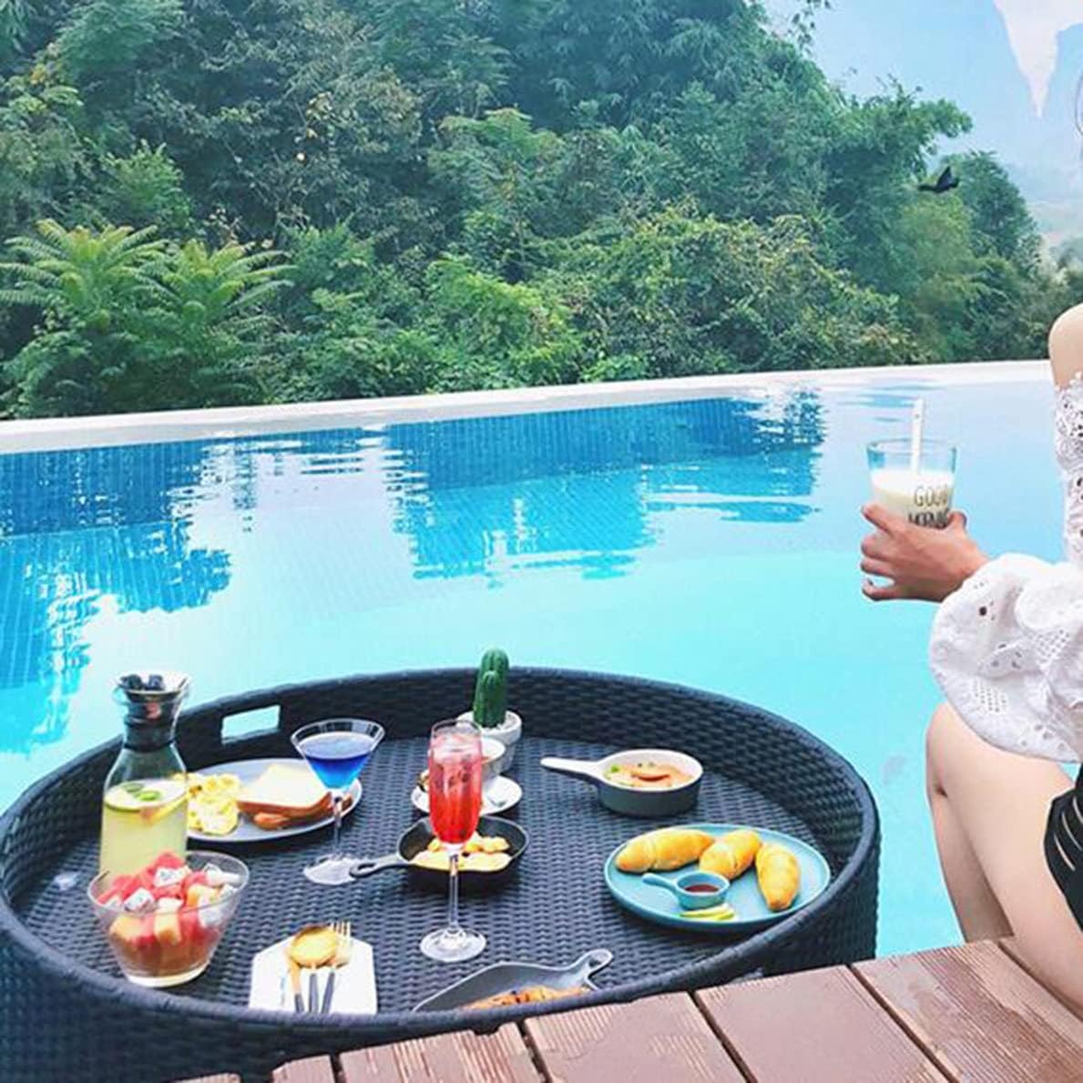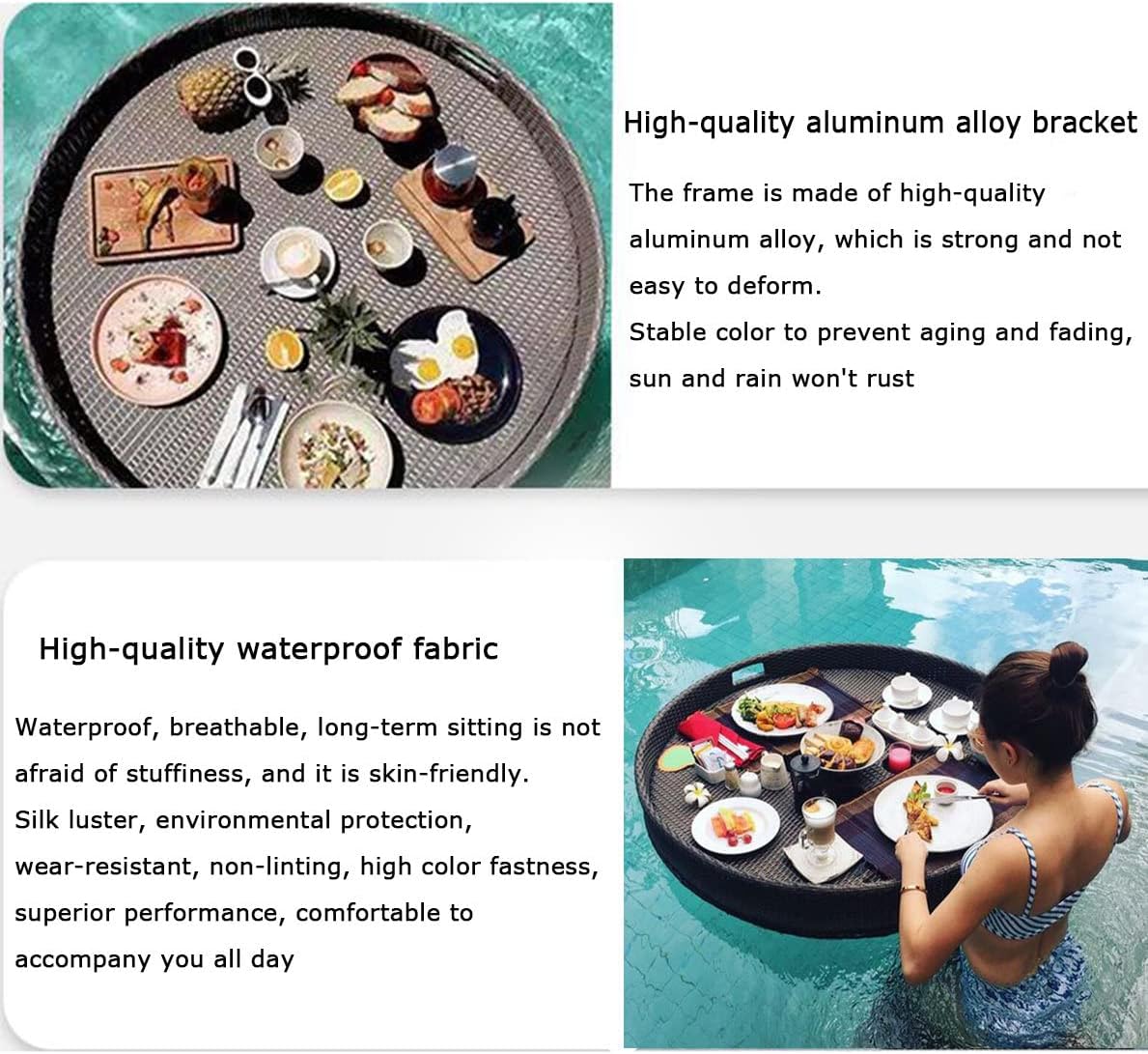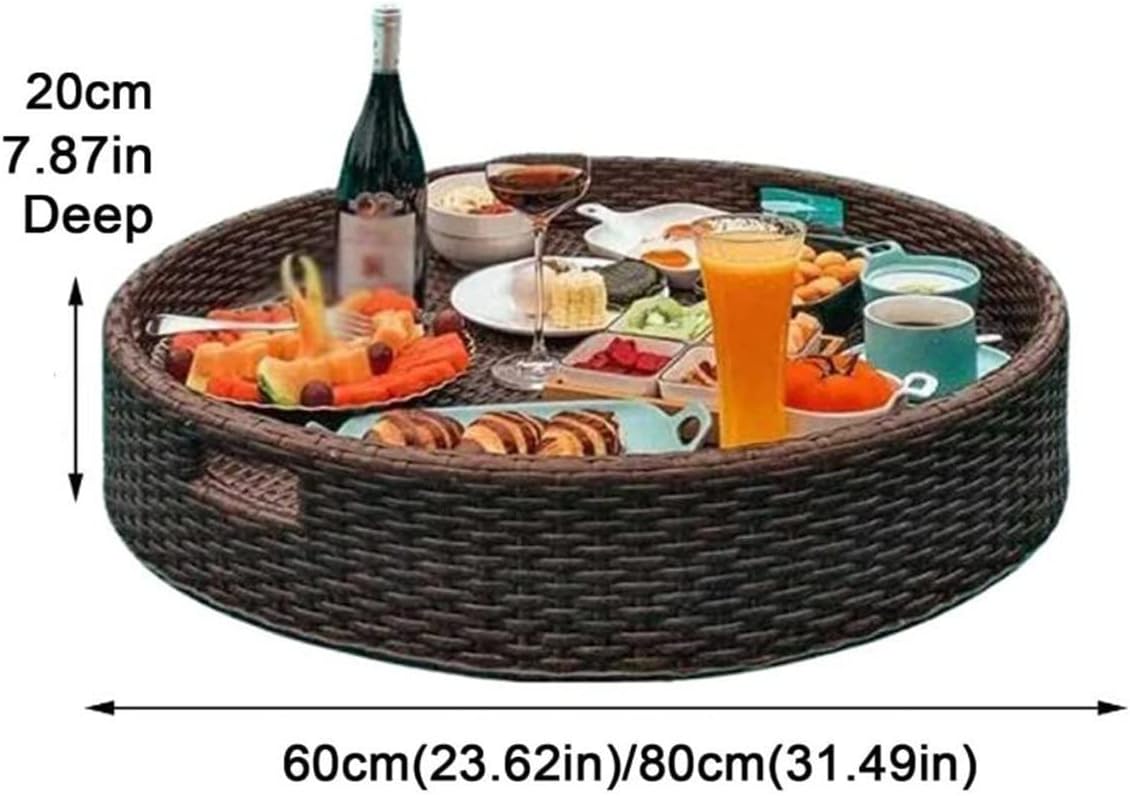 【Materiale】: Il vassoio intrecciato in rattan è realizzato in rattan ecologico intrecciato a mano + telaio in lega di alluminio + materiale di cotone galleggiante, che è ecologico. 【MULTIFUNZIONE】: Il vassoio in rattan intrecciato può essere utilizzato come vassoio per cibo/tè/bevande, vassoio decorativo per pouf, vassoio per poggiapiedi, vassoio per tavolino da caffè, cesto di frutta o vassoio per hostess. 【Vassoio galleggiante】: il telaio del vassoio galleggiante è realizzato in lega di alluminio, robusto e non facile da deformare, impermeabile e antiruggine, goditi la tua oasi in giardino mentre ti rilassi con la tua bevanda preferita senza preoccuparti che si ribalti. 【COMODO E SEMPLICE】: Un bicchiere da vino che non ha bisogno di galleggiare, o un galleggiante gonfiabile economico che non ha bisogno di un supporto, invece, aggiungi vassoi di formaggi e frutta, bevande, cibo, riviste, crema solare e altro ancora alla tua piscina per il divertimento dei tuoi ospiti. 【Qualità】: Le grandi sfere galleggianti del piatto da portata in rattan sono intrecciate a mano con fibre sintetiche e non si deteriorano al sole. Queste boe da spiaggia ecologiche sono rivestite con schiuma personalizzata per un galleggiamento e un supporto fluidi.