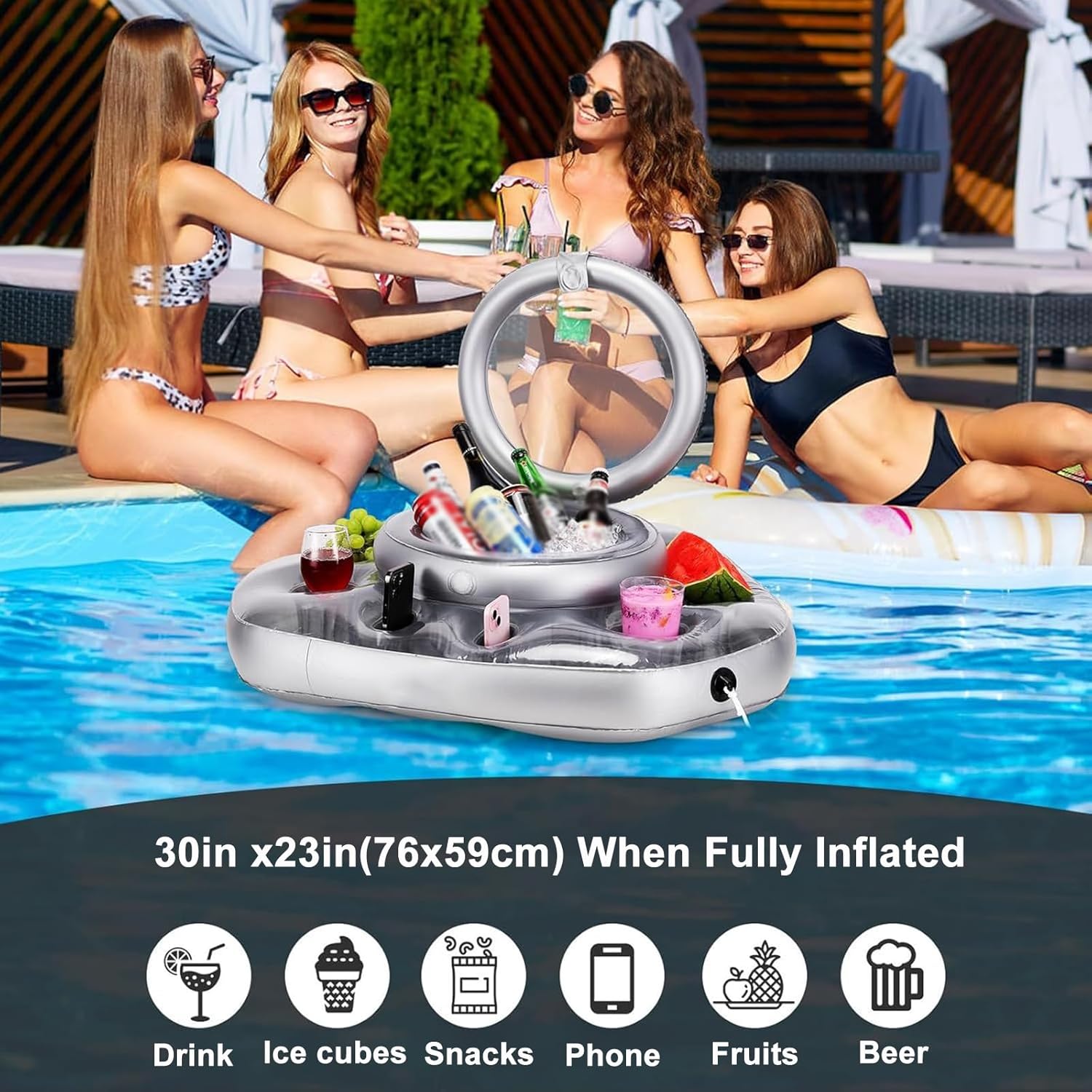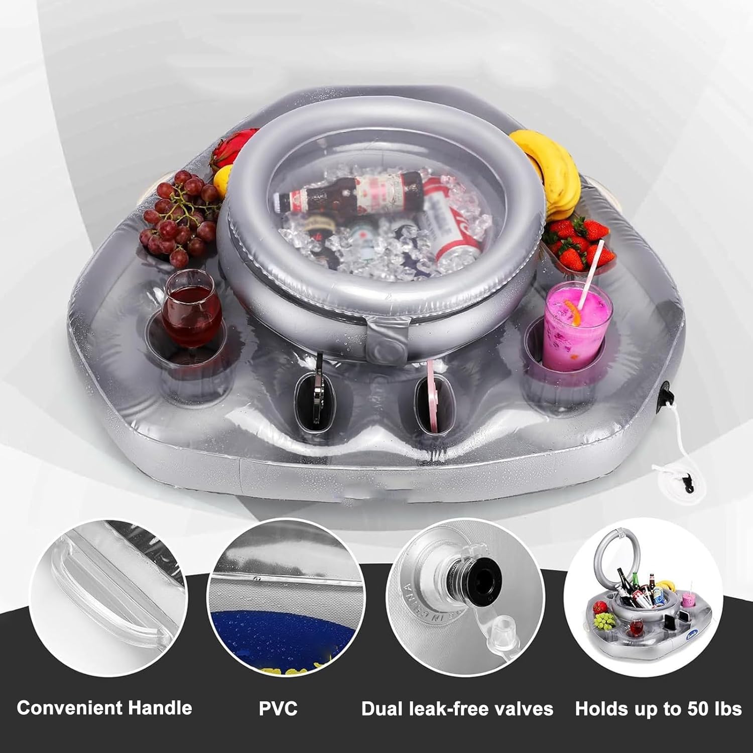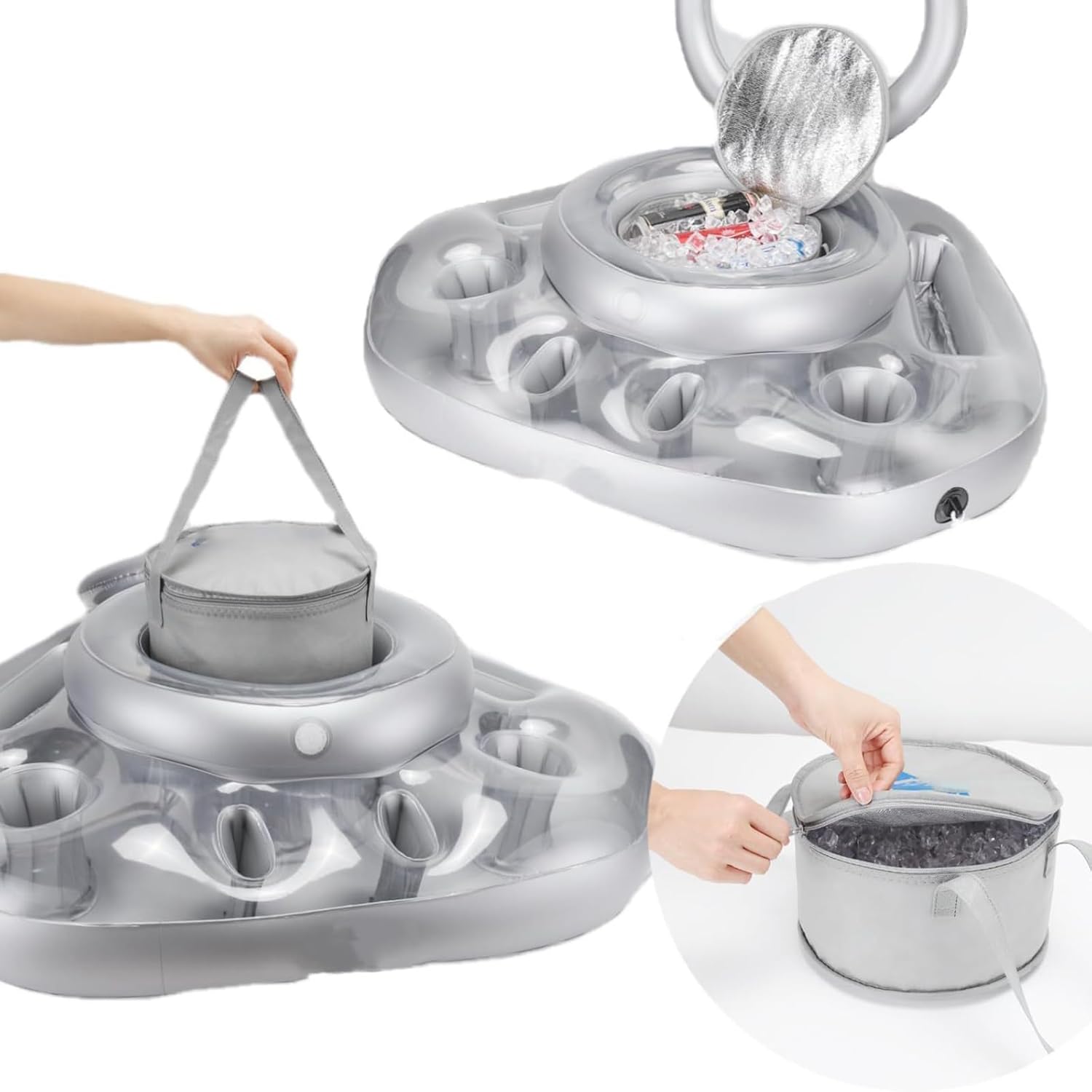 Porta bevande gonfiabile con una moderna finitura argento e pannelli semitrasparenti che gli conferiscono un aspetto elegante e pulito, aiutandoti a capire quando è il momento di rifornirlo Con una capienza generosa, questo refrigeratore galleggiante può contenere facilmente le tue bevande e snack preferiti, rendendolo il compagno perfetto per lunghe giornate in piscina, relax in spiaggia o gite in fiume Si gonfia e sgonfia in pochi minuti per un montaggio e uno stoccaggio senza sforzo. La sua struttura leggera lo rende facile da trasportare a feste, barbecue o qualsiasi avventura acquatica Fissa il tuo refrigeratore a lettini galleggianti, kayak o pontili utilizzando l'anello di sicurezza integrato, in modo che le tue bevande rimangano a portata di mano, anche quando sei alla deriva in mare aperto Non solo per le bevande: usalo per riporre altoparlanti impermeabili, creme solari o piccoli accessori da piscina, tenendo gli oggetti essenziali a portata di mano senza interrompere il divertimento