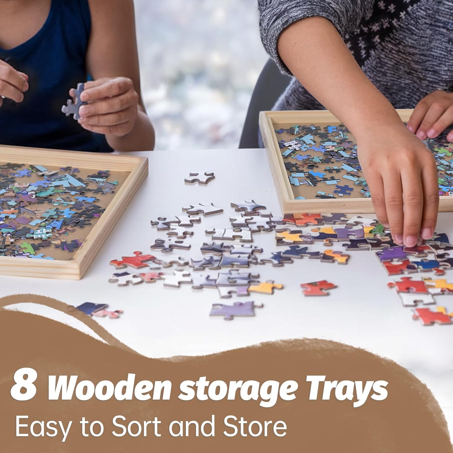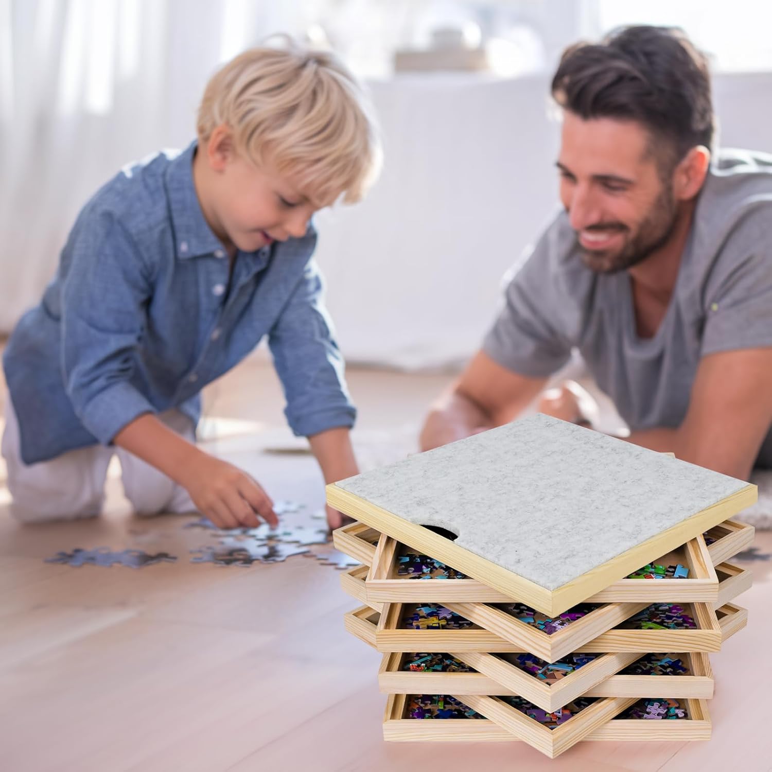 Durevole e leggero: realizzato in legno liscio di alta qualità per una facile maneggevolezza e un uso duraturo. Design multipezzo: include 8 vassoi impilabili per organizzare e separare le sezioni del puzzle in modo efficiente. Dimensioni universali: si adatta a puzzle da 1000 a 2000 pezzi (30 x 30 cm) per un'ampia compatibilità. Custodia protettiva – Mantiene i pezzi del puzzle al sicuro e privi di polvere quando non in uso. Salvaspazio: il design compatto e impilabile aiuta a mantenere uno spazio di lavoro ordinato mentre si sconcerta.