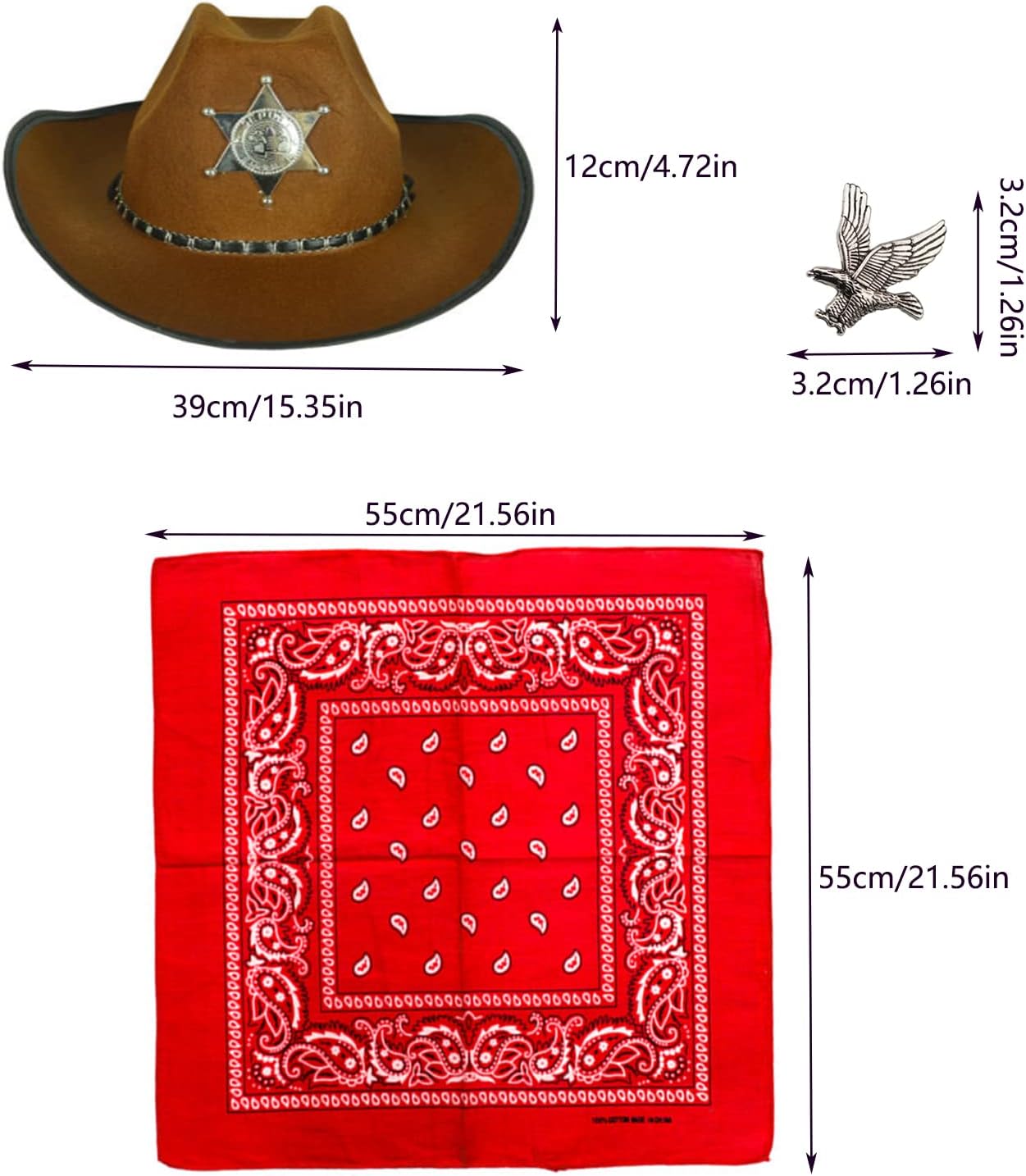 【Cowboy Suit】: Il pacchetto include 1x cappello da cowboy + 1x bandana + 1x spilla con aquila volante.Usa questo vestito per travestirti da cowboy. Qualsiasi festa è la benvenuta! 【Cappello da cowboy occidentale】: Poliestere e tela, finta pelle scamosciata di alta qualità, leggero e resistente per un uso confortevole. Design alla moda classico, tesa larga per protezione solare, traspirante, taglia unica 【Foulard hip hop】: Questo cappuccio retrò è realizzato al 100% in cotone per comfort e durata, fascia perfetta, bandana fazzoletto o pochette per completare il tuo look, queste bandane hanno design e motivi occidentali che le rendono eleganti e retrò. 【Spilla Aquila】: Spilla dal design vintage con aquila, un accessorio unico per qualsiasi costume; Qualità decente, materiale metallico, delicato falco svettante 【Decorazioni per feste perfette】: Perfette per feste a tema western, feste a tema cowboy, feste in costume, compleanni, Natale, Halloween e altro! Ottimo anche per regali, omaggi e decorazioni