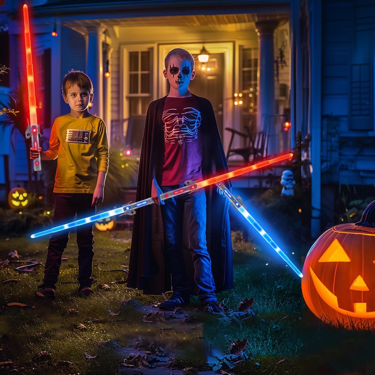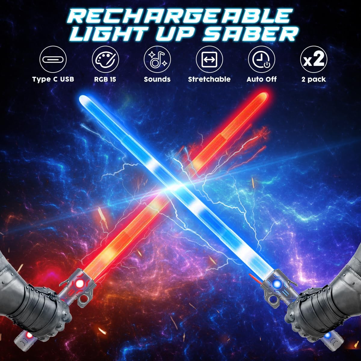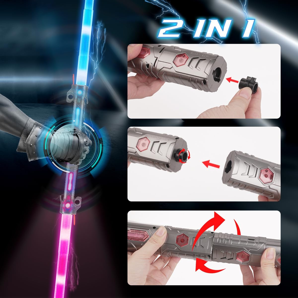 【Nuova Spada Luminosa Ricaricabile】Questa è una nuova spada luminosa a LED potenziata. A differenza delle solite spade luminose che richiedono l'uso di batterie, questa spada luminosa è dotata di una batteria ricaricabile integrata ad alta capacità, per cui quando si riceve la spada luminosa, basta accendere l'interruttore per attivare la spada luminosa. Nel frattempo, vi forniamo anche un cavo di ricarica USB, 1 ora di ricarica, 10 ore di utilizzo, in modo da poter godere del tempo di gioco. 【Spettacolo di Luci Colorate 15】La sciabola luminosa presenta 15 modalità di luce RGB con colori brillanti. Premere a lungo l'interruttore per attivare la spada luminosa, mentre il suono realistico dell'effetto vi circonderà sempre. Premere l'interruttore per cambiare il colore, quando la spada luminosa sembra scontrarsi,la luce LED della modalità sempre attiva lampeggerà per rendere la battaglia più interessante. Quando si desidera disattivare gli effetti sonori, fare doppio clic sul pulsante. 【Spada Leggera 2 in 1 Retrattile】Questo set contiene due spade luminose, ciascuna delle quali è retrattile e portatile, con manici facili da impugnare. Con un semplice gesto, le spade leggere si espandono facilmente da 10,5 pollici allo stato retratto a 30 pollici, e con il connettore, le due spade leggere possono essere trasformate in una spada lunga 60 pollici, perfetta per vari scenari di gioco, rendendoti il guerriero più cool che difende il mondo intero. 【Sicuro e Duraturo】L'impugnatura della spada luminosa ha un aspetto metallico argentato e la spada è realizzata in ABS di alta qualità, ha una superficie liscia e una struttura e robusta per garantire che non si rompa e sia resistente anche durante le attività di gioco più intense. La spada luminosa può ridurre il tempo che i bambini trascorrono sui dispositivi elettronici, utilizzare la loro immaginazione illimitata e creare meravigliosi giochi di combattimento con la famiglia e gli amici. 【Set di Spade luminose di Valore Superiore】Le spade luminose a LED sono perfette per feste a tema guerriero, feste in costume di Halloween, regali di compleanno, regali di Natale e altro ancora! I bambini possono vestire i panni di Darth Vader, Luke Skywalker o di altri personaggi preferiti dei film e delle serie televisive per un emozionante gioco di ruolo e godersi l'infinito divertimento offerto dalla spada luminosa. La spada laser VATOS sarà il regalo più apprezzato dai bambini!