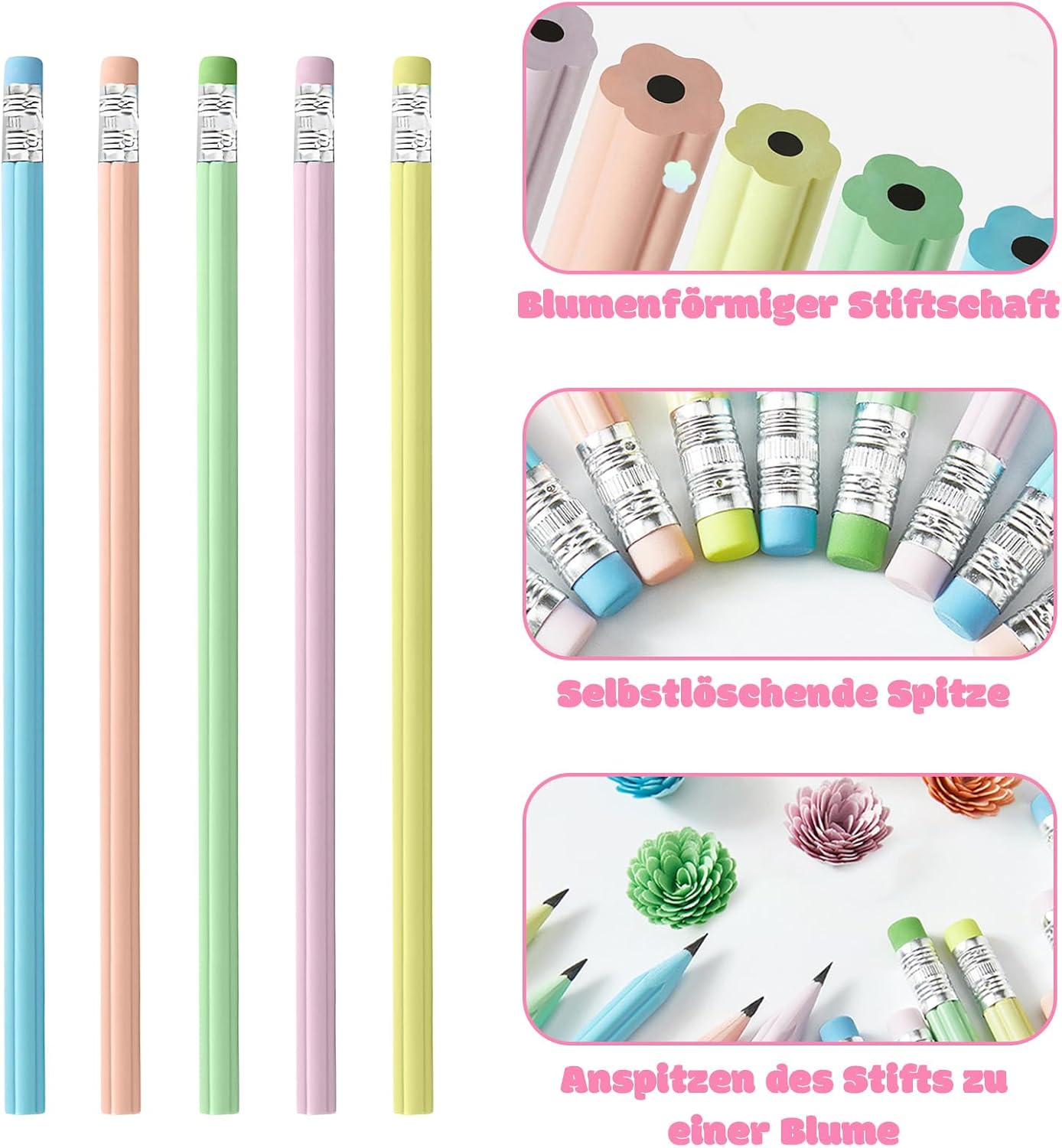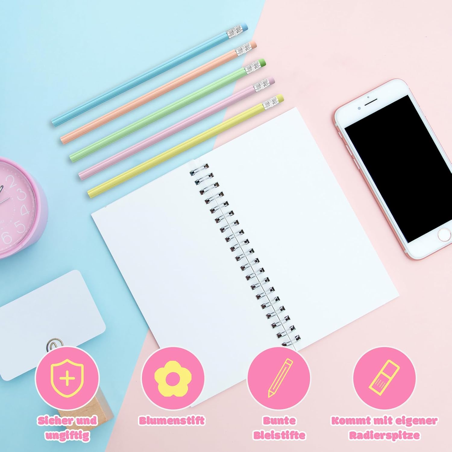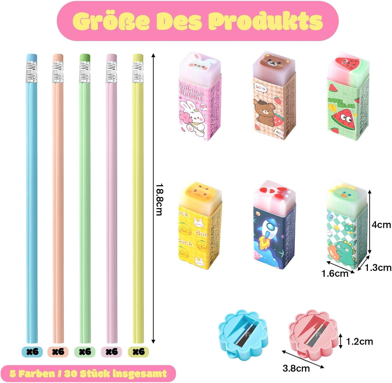 Set completo: contiene tutto per bambini creativi: 30 matite colorate in 5 colori vivaci (6 matite ciascuna), 6 adorabili gomme per cancellare animali con diversi motivi (orso, anatra, dinosauro, coniglio, razzo e anguria), 2 pratici temperamatite blu e rosa. Perfetto per scuola, compiti e progetti creativi. Qualità premium: realizzato con materiali atossici di alta qualità. Le penne hanno una mina infrangibile per una scrittura uniforme e confortevole. Le gomme extra morbide rimuovono facilmente i tratti di matita senza danneggiare la carta. I temperamatite sono stabili e durevoli. Pratico imballaggio: con dimensioni compatte di 27 × 20 × 2,2 cm e un peso leggero di soli 190 g, il set è ideale per il trasporto in zaini o zaini. La confezione chiara consente una facile conservazione. Valore pedagogico: stimola la creatività e le capacità motorie nei bambini. I diversi colori stimolano la pittura, mentre le simpatiche gomme a forma di animale rendono l'apprendimento giocoso. Ideale per bambini in età prescolare e elementare. Regalo perfetto: ideale come regalo per l'inizio della scuola, una sorpresa di compleanno o come regalino per feste per bambini. La presentazione accattivante rende il set un regalo speciale che entusiasmerà ogni bambino.