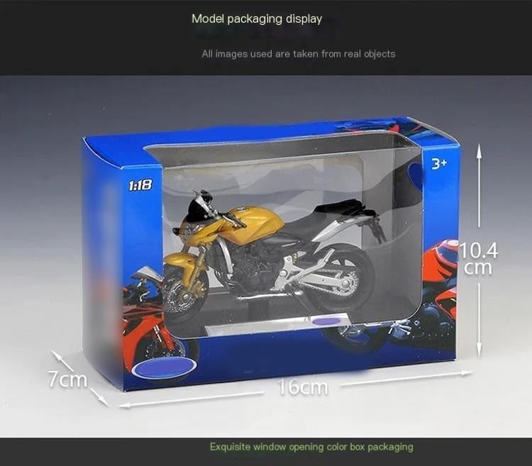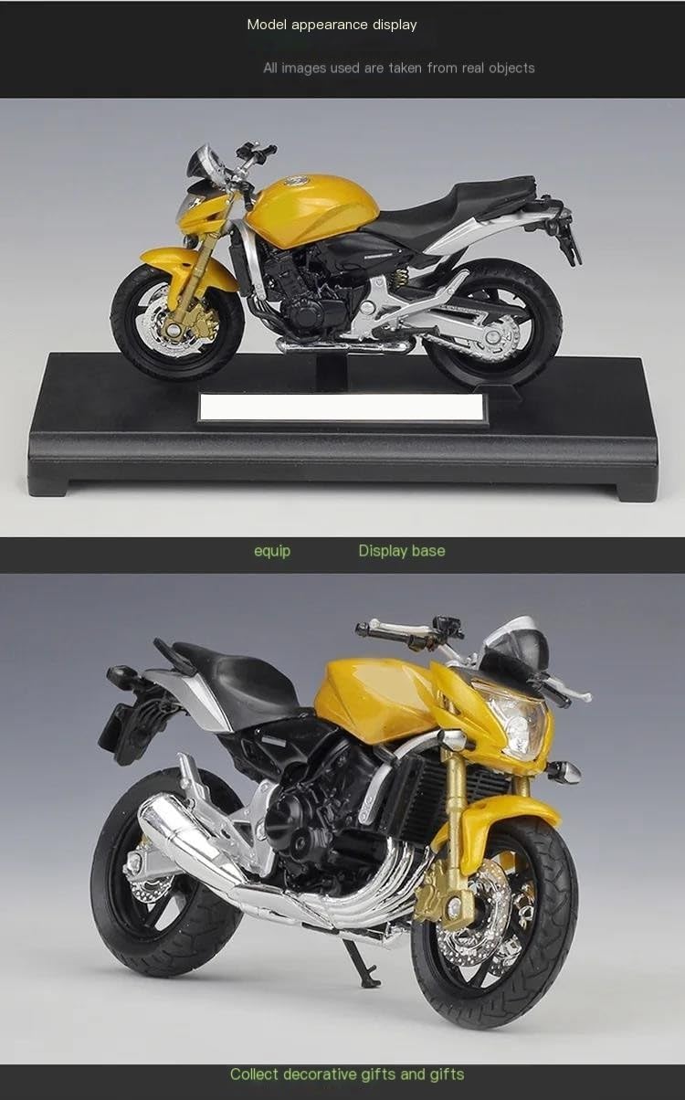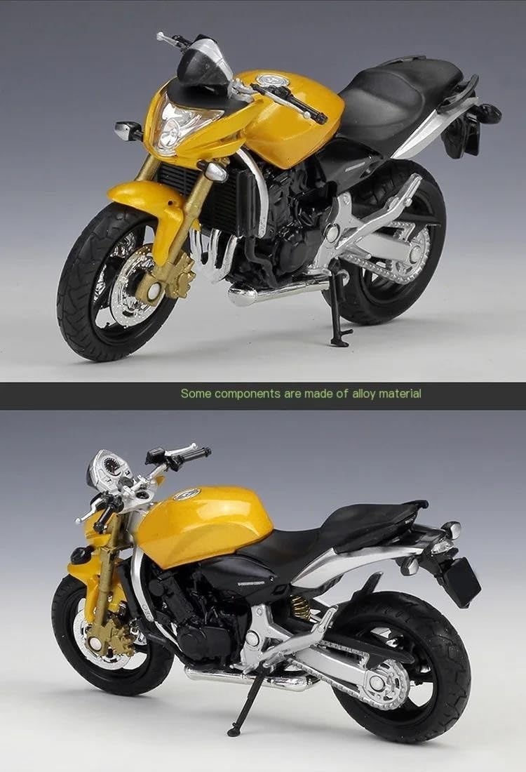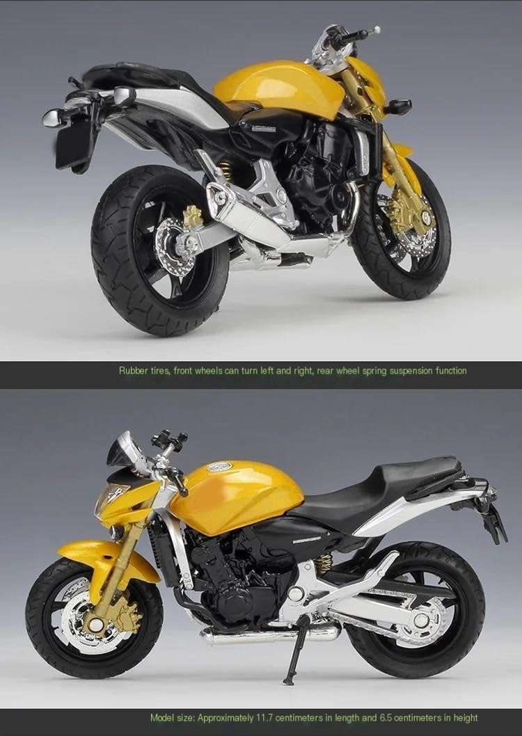 Modellini di motociclette giocattolo in scala 1:18, parti squisite progettate secondo le proporzioni originali dell'auto, cruscotto, pedali del freno e dell'acceleratore sono progettati per essere realistici e precisi. la modalità di simulazione della motocicletta è piena di personalità, così bella. Ottima per la collezione e l'arredamento dell'ufficio domestico. Modello di motocicletta per Hornet Realizzato in resistente lega di zinco, è resistente alle cadute e all'usura, garantendo la durevolezza del modello e la sua lunga conservazione. La finitura della vernice è uniformemente liscia, con colori vivaci e duraturi che resistono allo sbiadimento e alle scheggiature, garantendo un aspetto costantemente brillante.