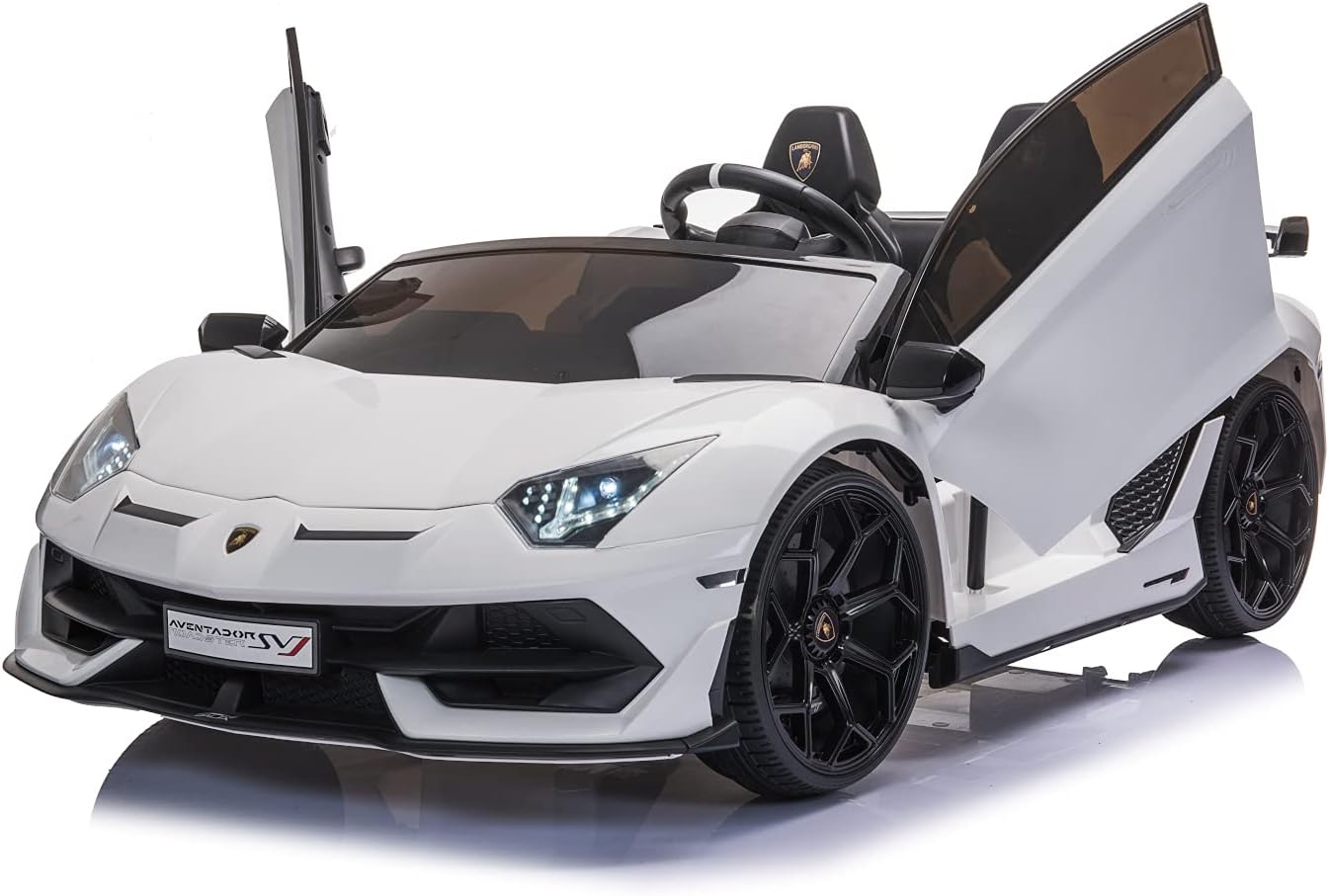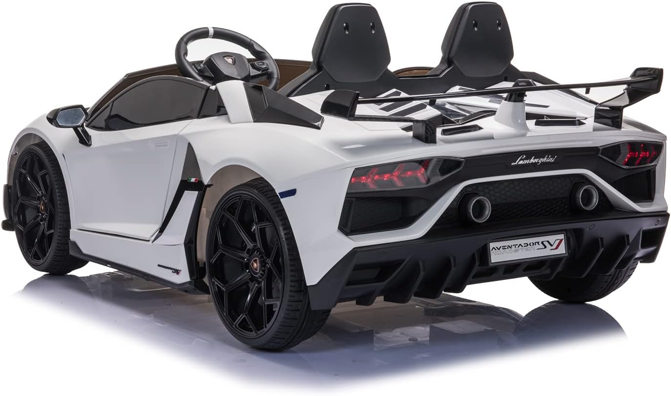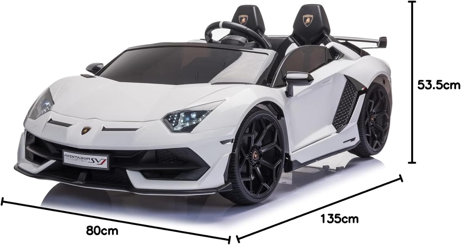 PNEUMATICI EVA | SEDILE IN PELLE | LICENZA DI LAMBORGHINI | 2 POSTI Porte a battente con ammortizzatore, fari anteriori e posteriori, telecomando da 2,4 GHz, 2 motori Con porte MP3, USB e scheda SD, volante multifunzione con effetti musicali, 3 livelli di velocità Porte apribili | Fino a 6 km/h veloce | Cintura di sicurezza | Soft Start | Ammortizzatore 2 motori elettrici da 35 W, batteria 12 V7A, portata: circa 40 kg. Dimensioni (lunghezza x larghezza x altezza): 135 x 80 x 53,5 cm