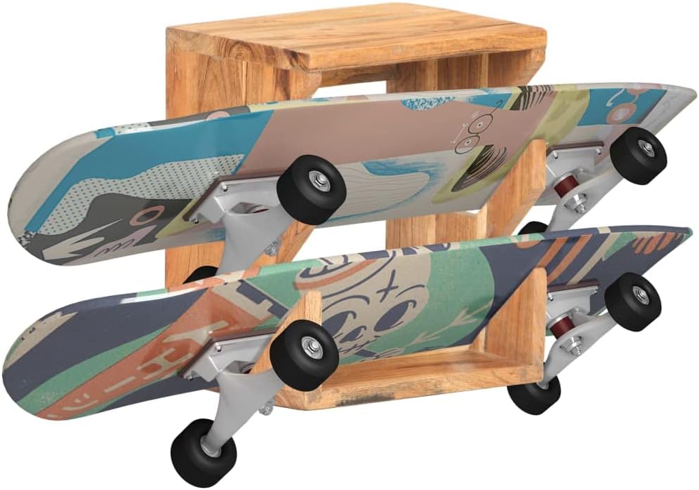Materiale: legno di acacia massiccio con finitura naturale Dimensioni: 25 x 20 x 30 cm (L x P x A) Capace per 2 skateboard Montaggio richiesto: no.