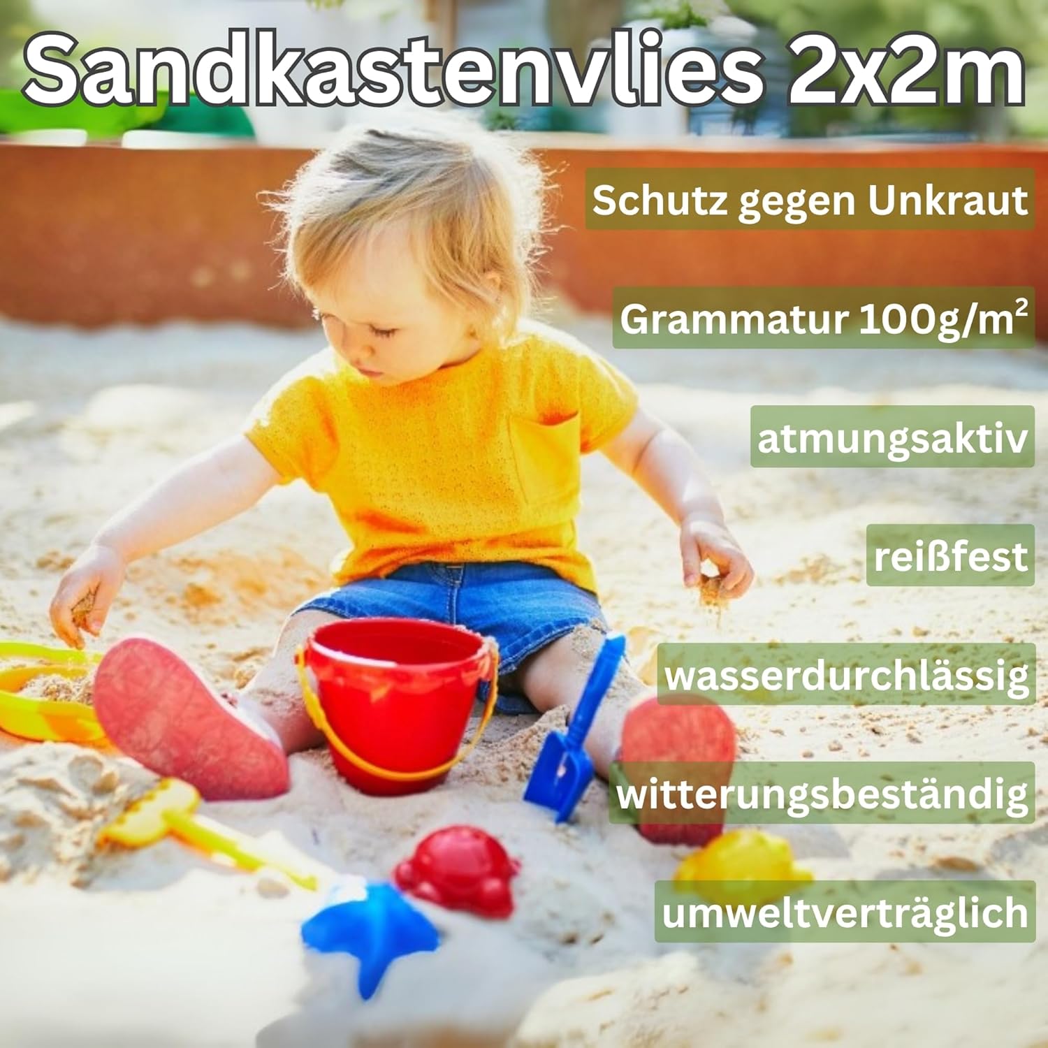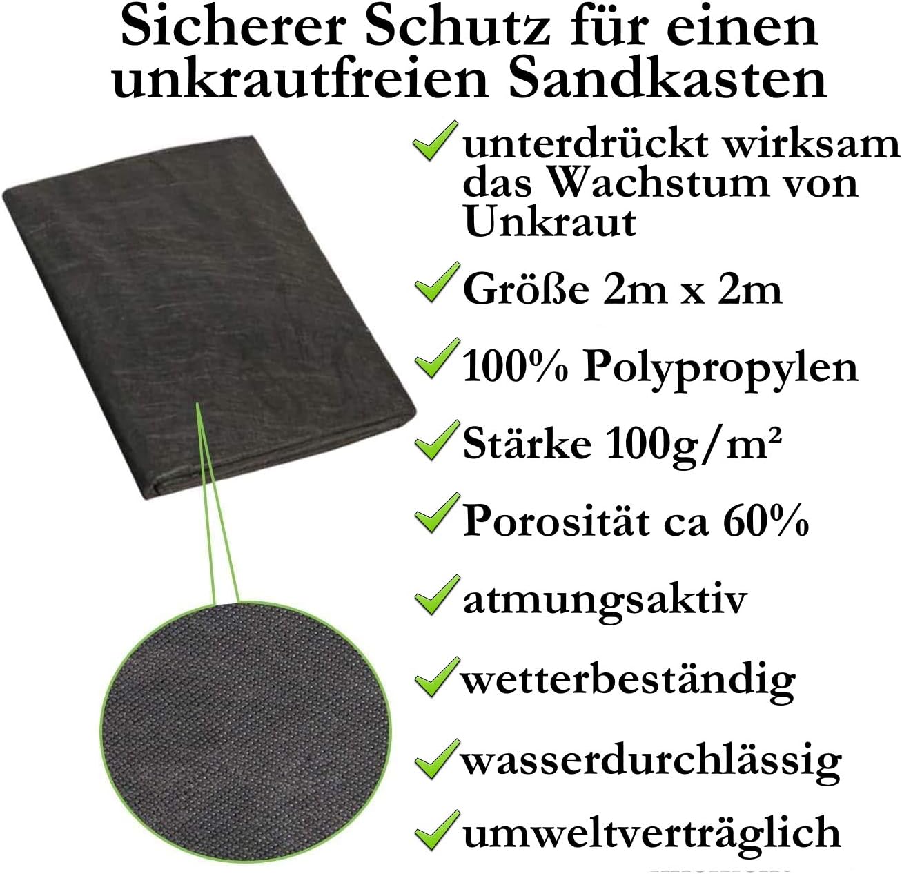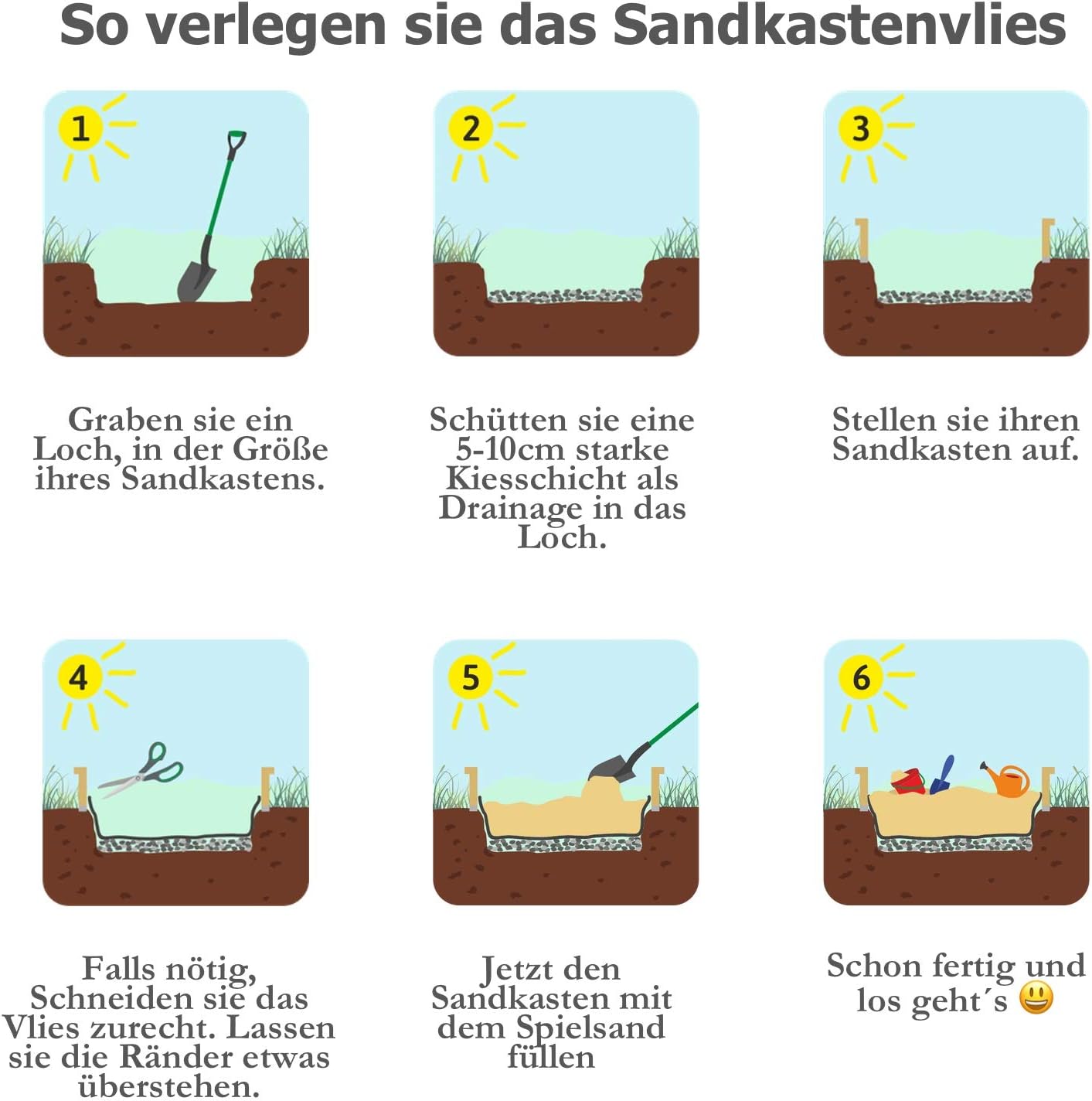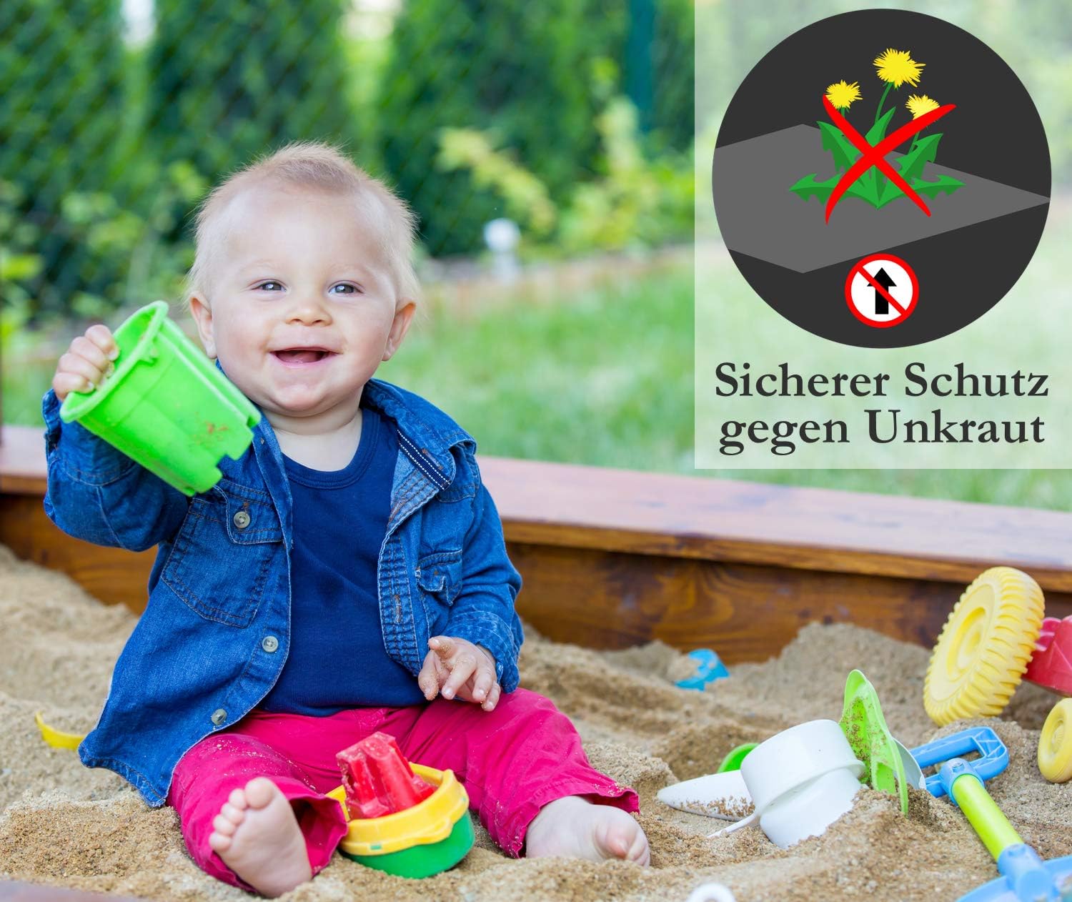 Sottofondo perfetto per la sabbiera: proteggi la sabbiera dei tuoi bambini con la nostra vela da terra ecologica dalle erbacce e dai rettili del suolo. Qualità eccezionale: il nostro sottofondo per sabbiera è permeabile all'acqua, resistente agli strappi e agli agenti atmosferici. L'acqua piovana può defluire senza problemi e il tessuto non tessuto offre una protezione sicura contro le erbacce. Facile da lavorare: posiziona la colata di erbacce nella sabbiera, quindi riempila semplicemente con sabbia da gioco. Puoi facilmente tagliare il vello a misura con le forbici in modo che si adatti anche a piccole sabbiere. Rivenditore tedesco: Siamo un'azienda tedesca. Puoi trovare i nostri prodotti in lana d'erba sotto il marchio KRONLY. Fornitura: Tessuto non tessuto antistrappo per sabbiera 2 x 2 m. Materiale 100% polipropilene con un peso di 100 g/m².