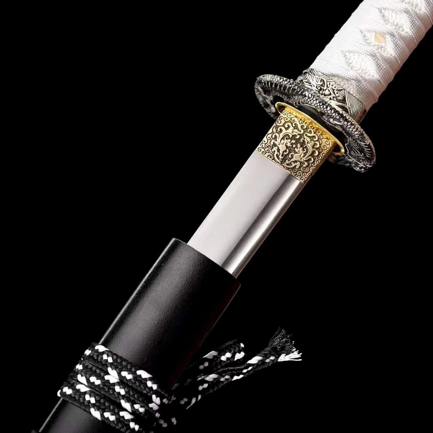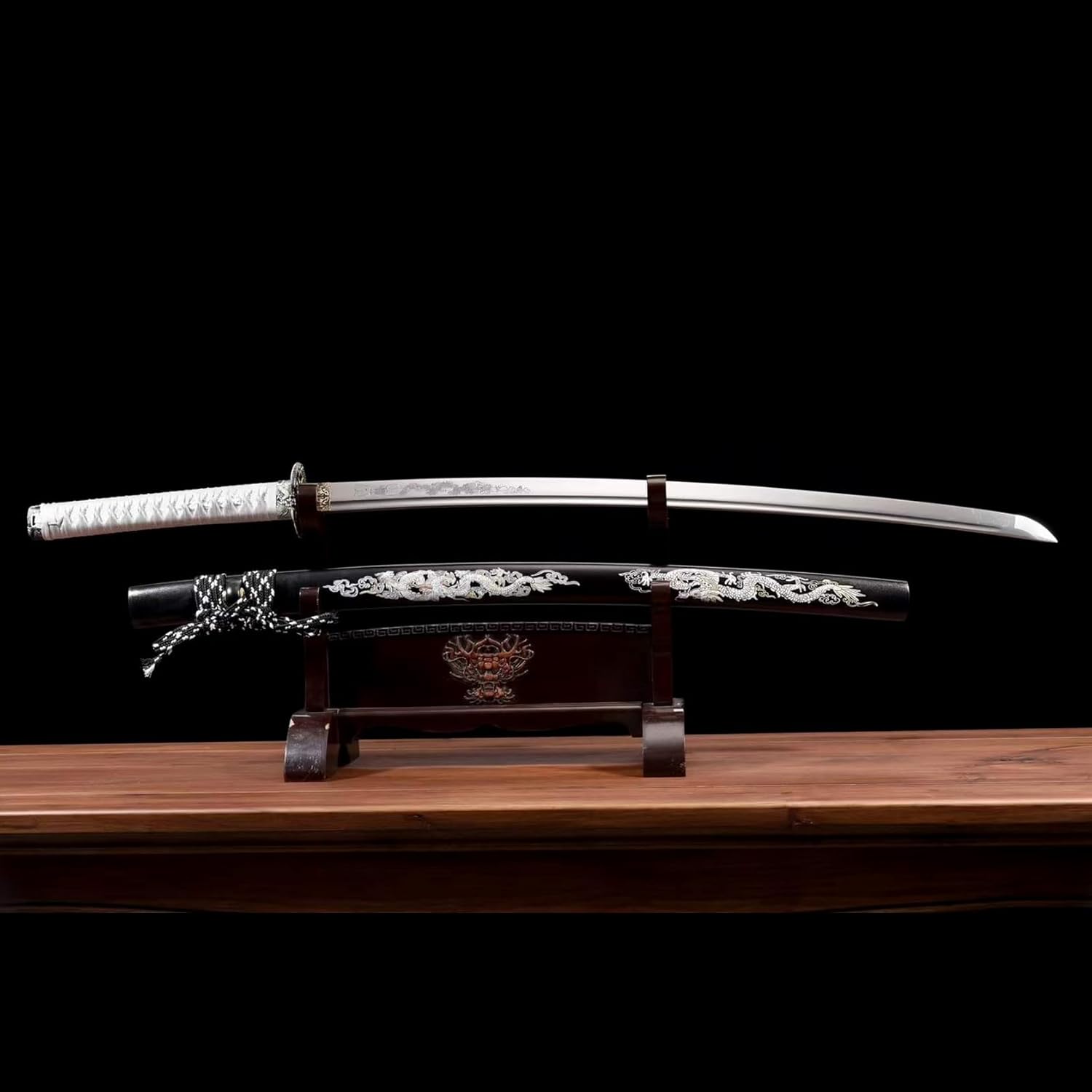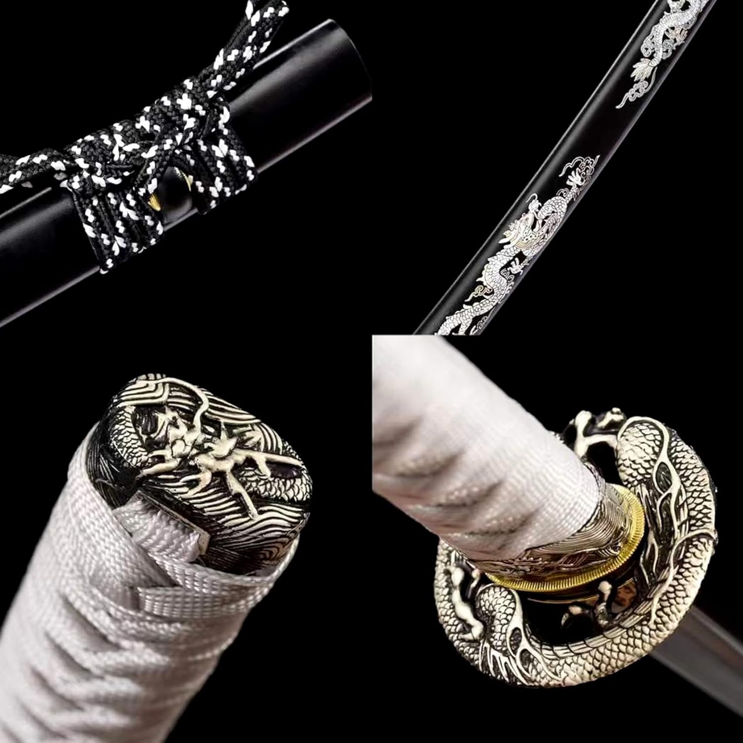 ▶ Produzione della lama: questa spada da samurai è accuratamente forgiata in acciaio al manganese di alta qualità. Ha una buona tenacità e un'elevata durezza. Può essere piegato all'angolo retto senza deformazioni e la durezza arriva fino a 60°. La lama presenta un design con scanalatura del sangue e un processo di incisione, che contribuisce all'aspetto elegante. ▶ Artigianato tradizionale: le spade Katana sono realizzate a mano da abili artigiani utilizzando le tradizionali tecniche del fabbro. Dalla selezione dei materiali alla forgiatura, dall'affilatura alla tempra, ogni fase viene accuratamente lucidata dagli artigiani per garantire che ogni spada sia un'opera d'arte unica. ▶ Proporzioni perfette: la lunghezza totale della katana è di 103 cm, la lunghezza della lama è di 71 cm, la lunghezza del manico è di 26 cm, la larghezza della lama è di 3,2 cm e lo spessore della lama è di 0,7 cm. Le dimensioni moderate garantiscono un buon controllo e utilizzo. La forma è bella e le linee sono morbide, il che mette in risalto perfettamente il fascino unico della katana. ▶ Decorazione squisita: il paramano è realizzato in lega di zinco con intagli pregiati. Il design della maniglia avvolta in corda di cotone non solo impedisce lo scivolamento e assorbe il sudore, ma consente anche all'utente di avere una buona presa durante l'uso. L'esterno del fodero in legno è spruzzato con vernice nera e dipinto con un realistico motivo a drago! ▶ Ampia gamma di usi: sia come regalo, oggetto da collezione, pezzo da esposizione o per giochi di ruolo o esercizi di kendo, questa katana si adatta perfettamente alle diverse esigenze. Combina funzionalità pratica con valore artistico, rendendolo la scelta ideale per ogni appassionato di arti marziali e collezionista di spade.