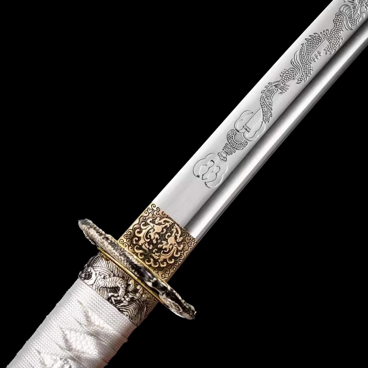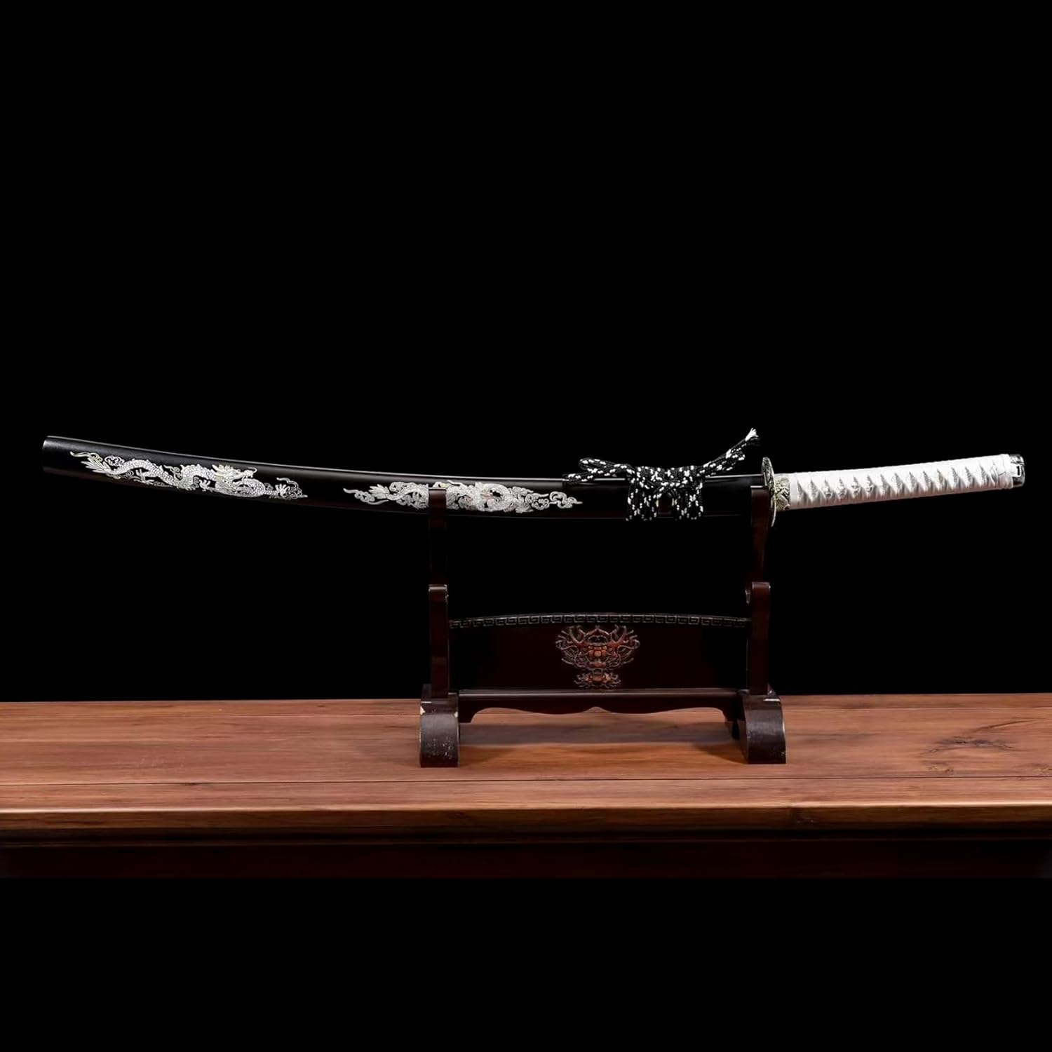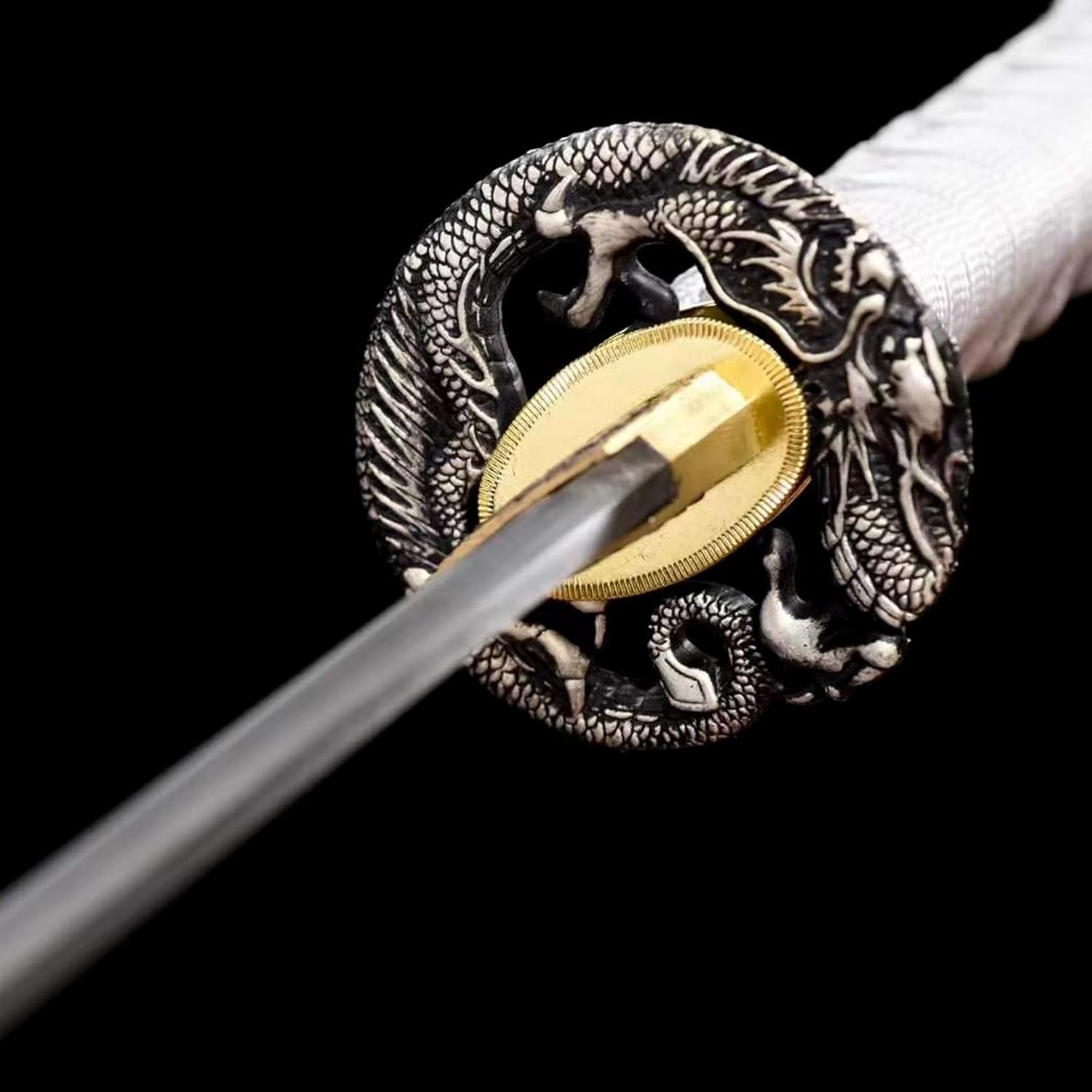 ▶ Produzione della lama: questa spada da samurai è accuratamente forgiata in acciaio al manganese di alta qualità. Ha una buona tenacità e un'elevata durezza. Può essere piegato all'angolo retto senza deformazioni e la durezza arriva fino a 60°. La lama presenta un design con scanalatura del sangue e un processo di incisione, che contribuisce all'aspetto elegante. ▶ Artigianato tradizionale: le spade Katana sono realizzate a mano da abili artigiani utilizzando le tradizionali tecniche del fabbro. Dalla selezione dei materiali alla forgiatura, dall'affilatura alla tempra, ogni fase viene accuratamente lucidata dagli artigiani per garantire che ogni spada sia un'opera d'arte unica. ▶ Proporzioni perfette: la lunghezza totale della katana è di 103 cm, la lunghezza della lama è di 71 cm, la lunghezza del manico è di 26 cm, la larghezza della lama è di 3,2 cm e lo spessore della lama è di 0,7 cm. Le dimensioni moderate garantiscono un buon controllo e utilizzo. La forma è bella e le linee sono morbide, il che mette in risalto perfettamente il fascino unico della katana. ▶ Decorazione squisita: il paramano è realizzato in lega di zinco con intagli pregiati. Il design della maniglia avvolta in corda di cotone non solo impedisce lo scivolamento e assorbe il sudore, ma consente anche all'utente di avere una buona presa durante l'uso. L'esterno del fodero in legno è spruzzato con vernice nera e dipinto con un realistico motivo a drago! ▶ Ampia gamma di usi: sia come regalo, oggetto da collezione, pezzo da esposizione o per giochi di ruolo o esercizi di kendo, questa katana si adatta perfettamente alle diverse esigenze. Combina funzionalità pratica con valore artistico, rendendolo la scelta ideale per ogni appassionato di arti marziali e collezionista di spade.