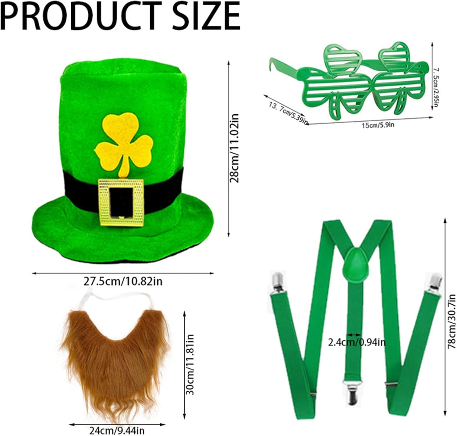Adatto per festival irlandesi, feste a tema e sfilate, il che lo rende un complemento indispensabile per qualsiasi guardaroba festivo. Con questo accessorio per feste distinguersi dalla folla e godere l'atmosfera festiva. Un must per tutti coloro che vogliono aggiungere un tocco di autenticità alla propria festa. Festeggia la festa irlandese con stile con il costume che cattura le essenze della tradizione irlandese. Perfetto per chi ama la cultura irlandese e vuole immergersi nella celebrazione del festival. Questo set, realizzato in tessuto e materiali plastici, ha un comfort distintivo e una durata assicurata per un utilizzo.