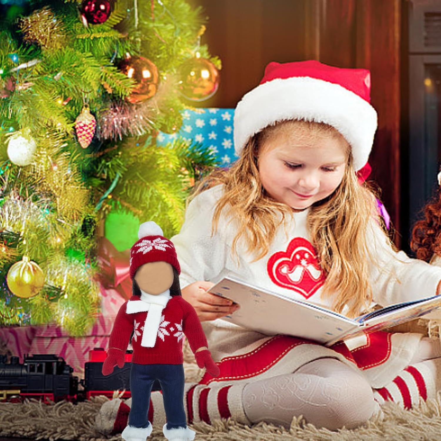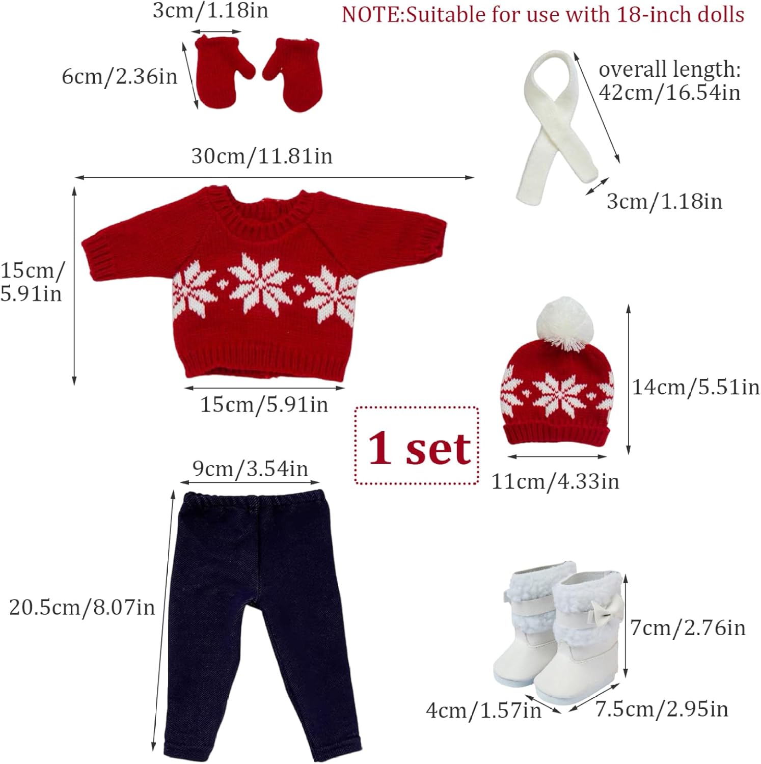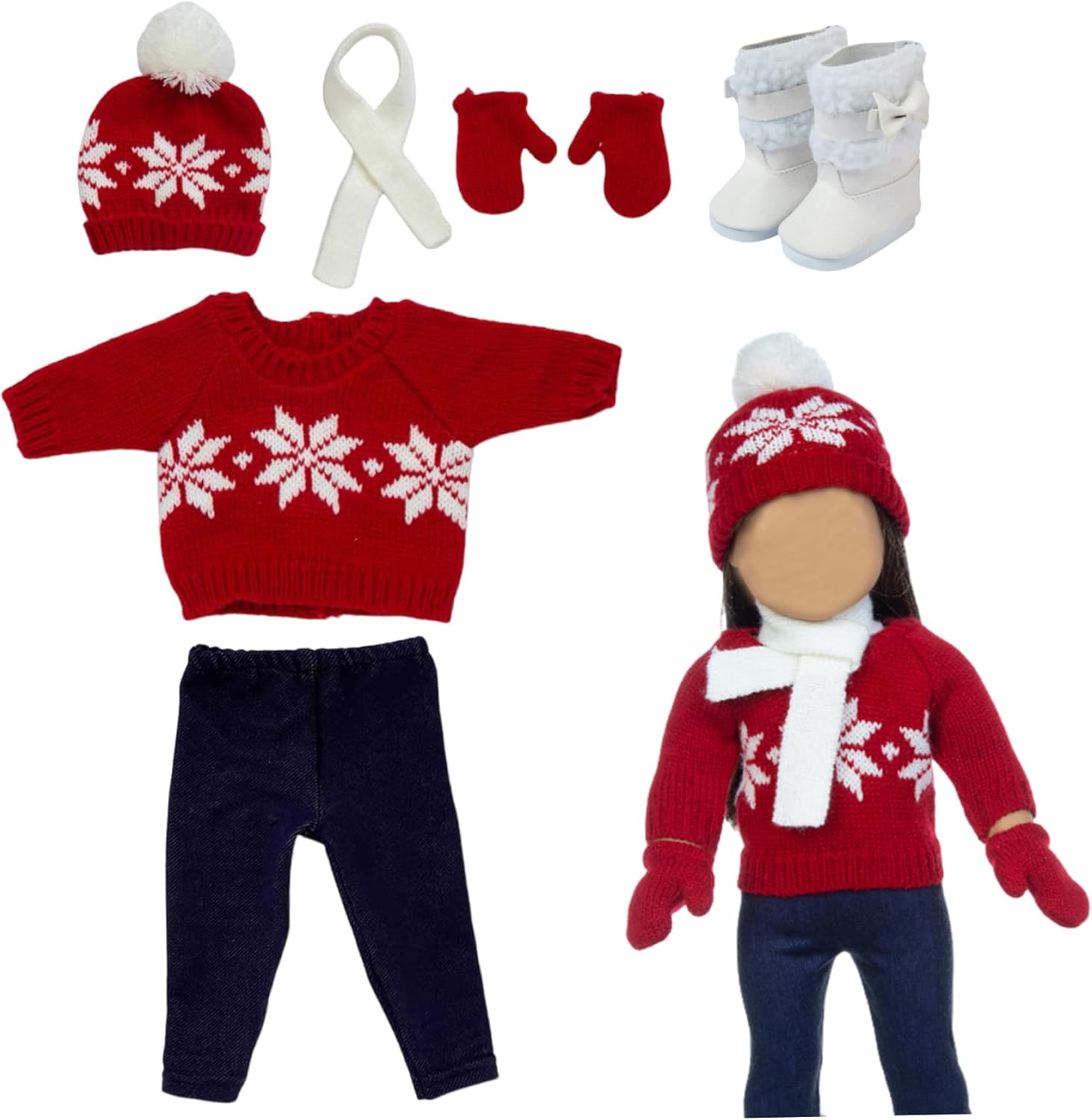 Natale unico: i vestiti per bambole natalizie per bambole da 18 pollici sono il regalo perfetto per ogni appassionato di bambole..Che tratti di un bambino o di un collezionista adulto, questi outfit sono la scelta ideale per diffondere l'allegria natalizia. Materiali di alta qualità: realizzati con tessuti di alta qualità, il maglione, la sciarpa, i guanti, il cappello e i pantaloni vantano una deliziosa morbidezza delicata al tatto..Le scarpe sono una miscela di pelle e peluche, garantendo longevità e resistenza all'usura..questi vestiti per bambole da 18 pollici sono costruiti per durare utilizzando materiali che non sono dannosi per i bambini con cui giocare. Design a tema natalizio: questi vestiti per bambole da 18 pollici sono disponibili nella classica combinazione di colori natalizi, design rosso e bianco, hanno un bell'aspetto e una forma carina;.Ci sono motivi a fiocchi di neve sui vestiti e sui cappelli, che aggiungono dolcezza alla tua bambola;.Rendi la tua bambola più carina e bella Completo natalizio: il nostro set di vestiti per bambole di Natale, un delizioso completo che include 1 maglione, 1 sciarpa, 1 cappello, 1 paio di pantaloni, 1 paio di guanti e 1 paio di scarpe, tutti perfettamente progettati per adornare bambole da 18 pollici..Questi affascinanti pezzi presentano motivi squisiti e incantevoli colori natalizi, assicurando che la tua bambola brillerà e catturerà l'attenzione di tutti. Facile da indossare: vestire la tua bambola per Natale non è mai stato così facile!.Il nostro set natalizio per bambole presenta design facili da usare, come cinture elastiche, così i bambini possono indossarle e toglierle facilmente dalle loro bambole..Dì addio al fastidio dei piccoli bottoni o delle chiusure complicate!