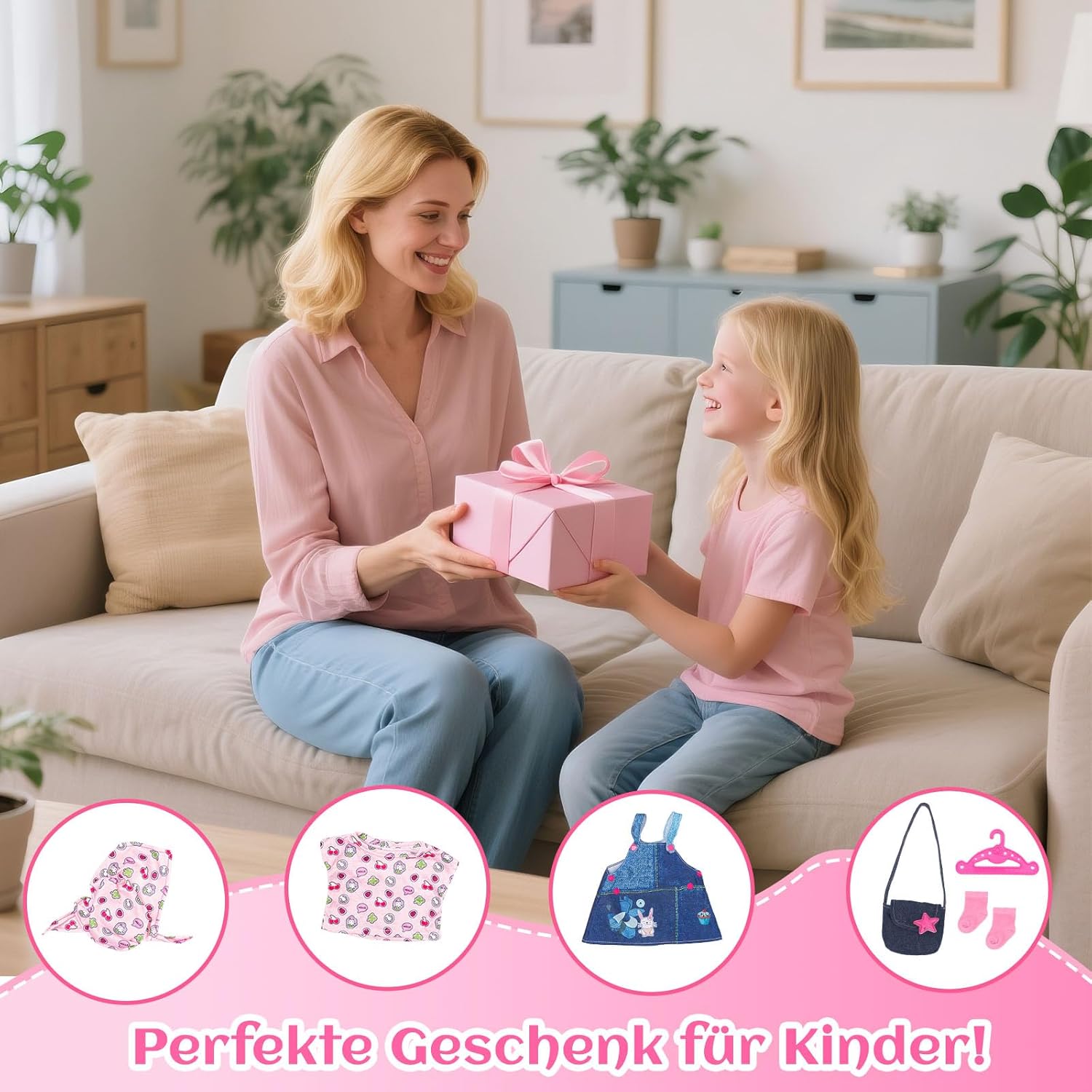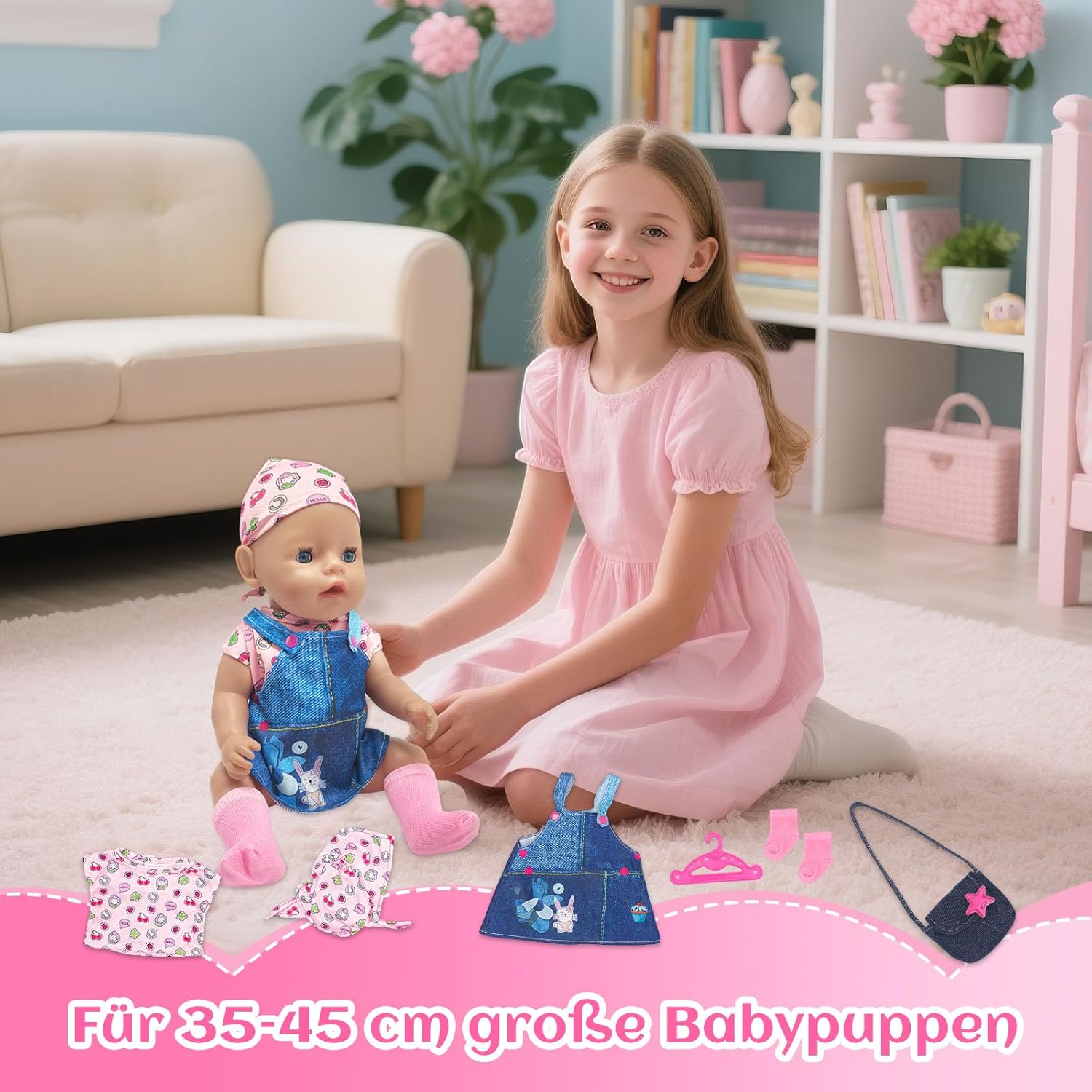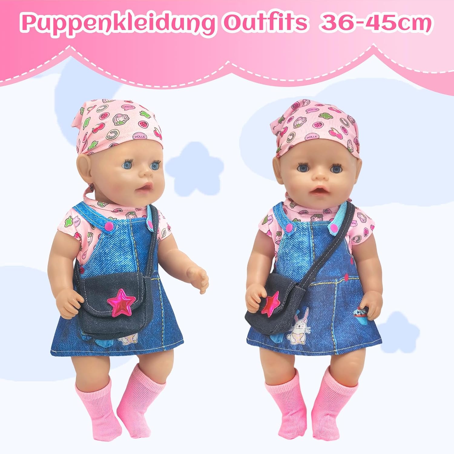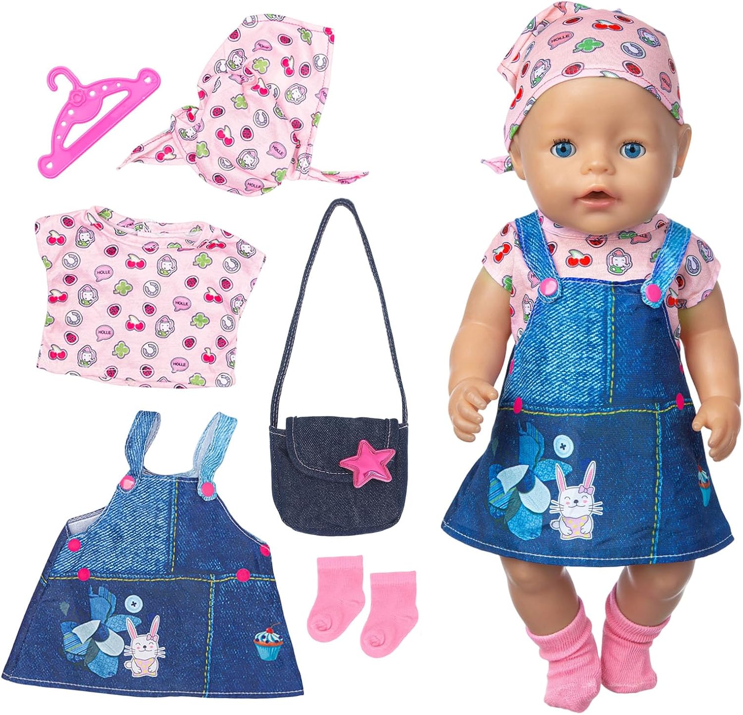 Set di vestiti per bambola: elegante set con pettorina blu, maglietta rosa e foulard abbinato, una borsa a tracolla in jeans, calzini rosa e un appendiabiti rosa per bambole realistica e moderna. Design carino con attenzione ai dettagli: la parte superiore rosa con simpatico motivo a cartoni animati e la borsa a tracolla alla moda rendono ogni bambola una vera attrazione. Materiali morbidi e di alta qualità: piacevole al tatto, finemente lavorato, facile da pulire e durevole, per un divertimento senza fine. Facile da pulire e resistente: i materiali lavabili garantiscono un piacere duraturo. Adatto per bambole da 35 a 43 cm, ideale per giocare quotidianamente e giochi di ruolo. Stimola la creatività e l'autosufficienza: i bambini imparano a vestire le loro bambole in modo giocoso, migliorando le capacità motorie e l'immaginazione. Idea regalo per bambine: per compleanno, Natale o come piccola ricompensa, questo set realizzato con amore garantisce sempre gli occhi luminosi dei bambini.