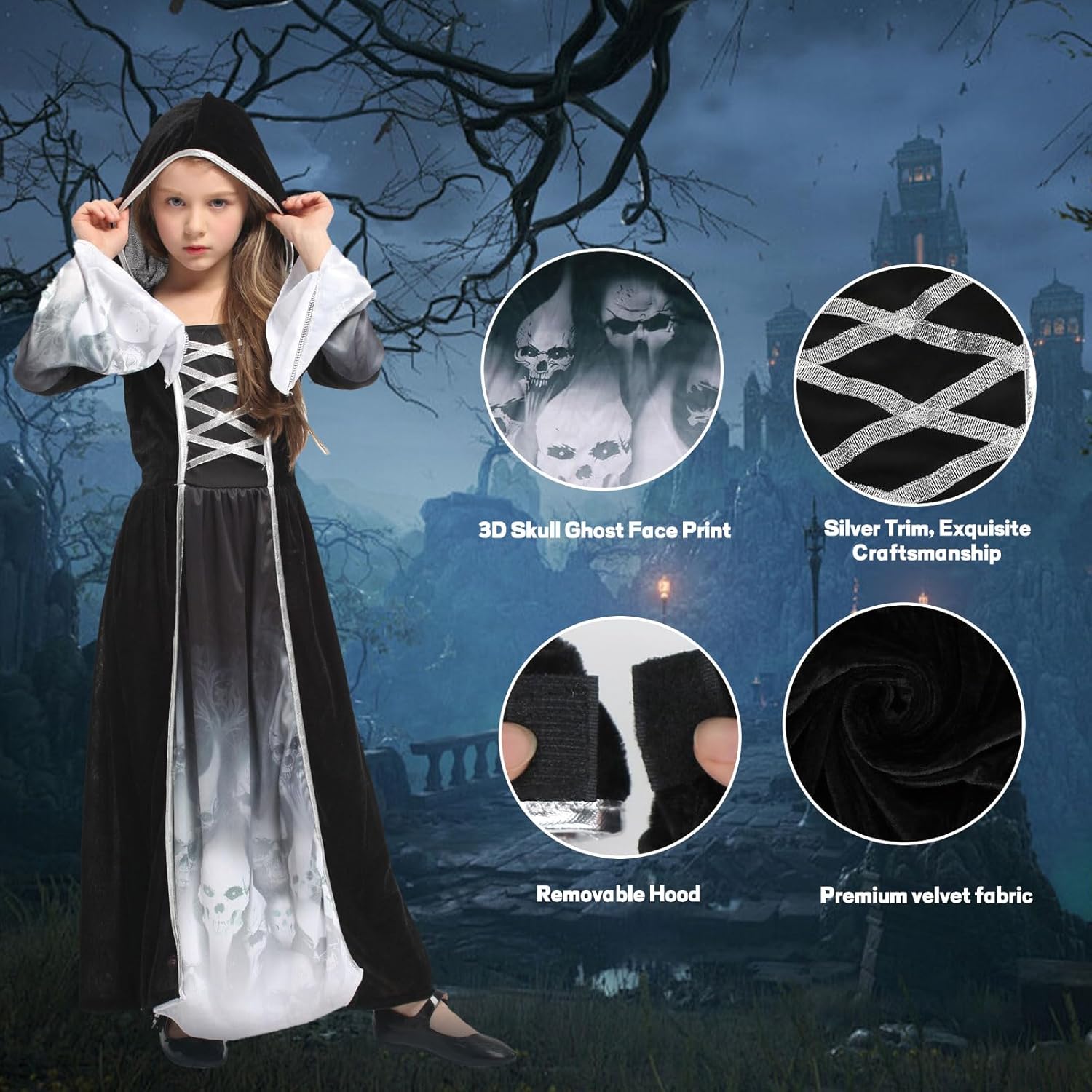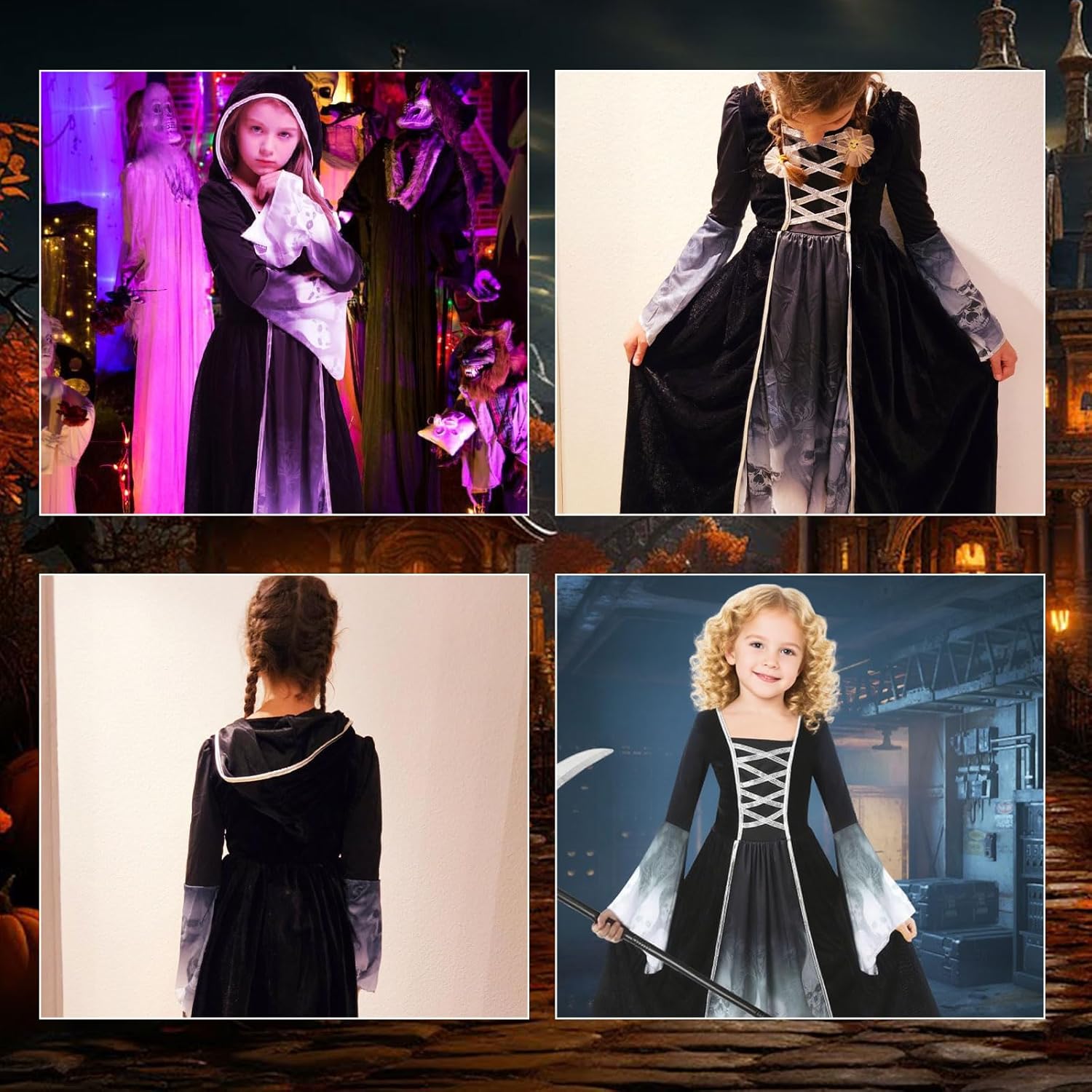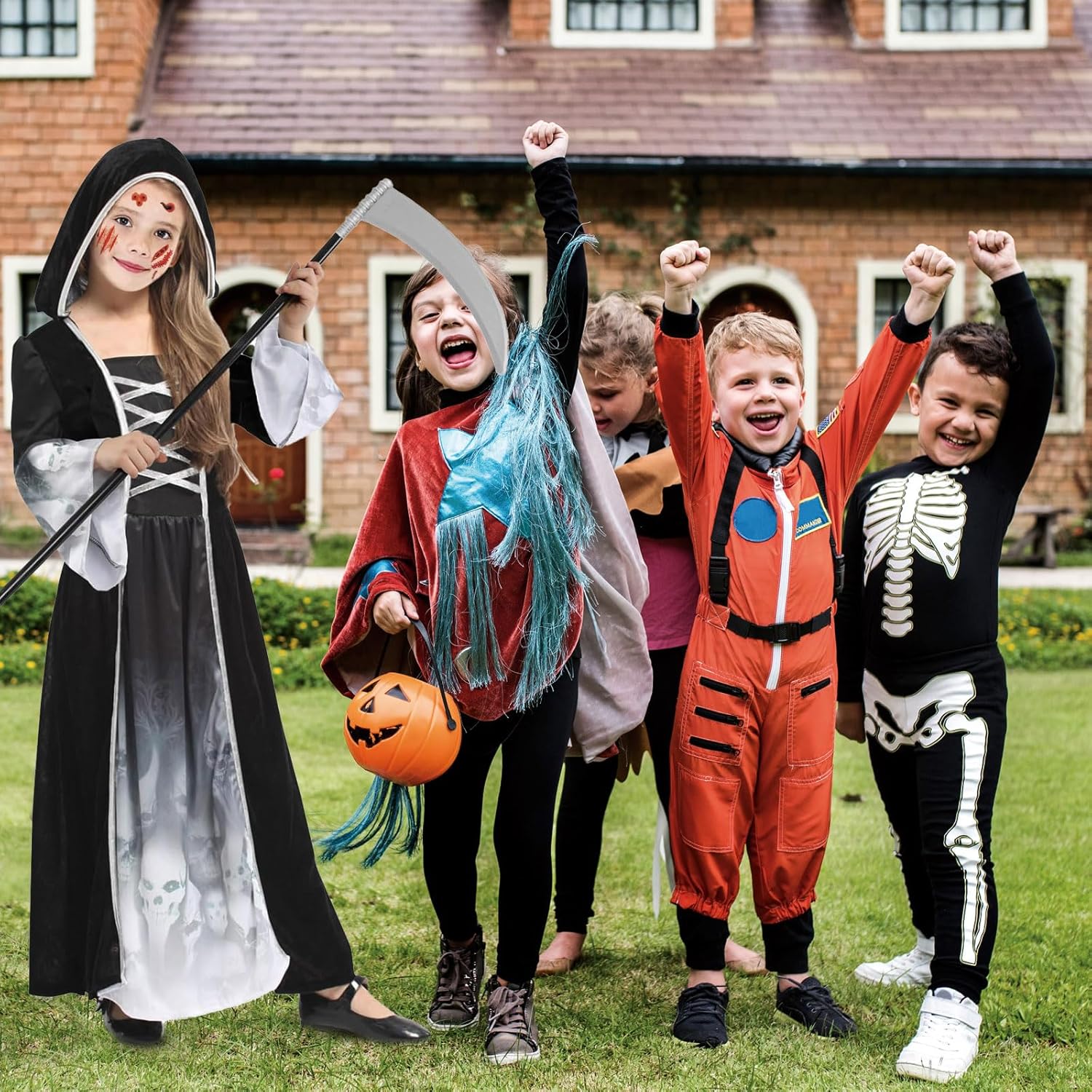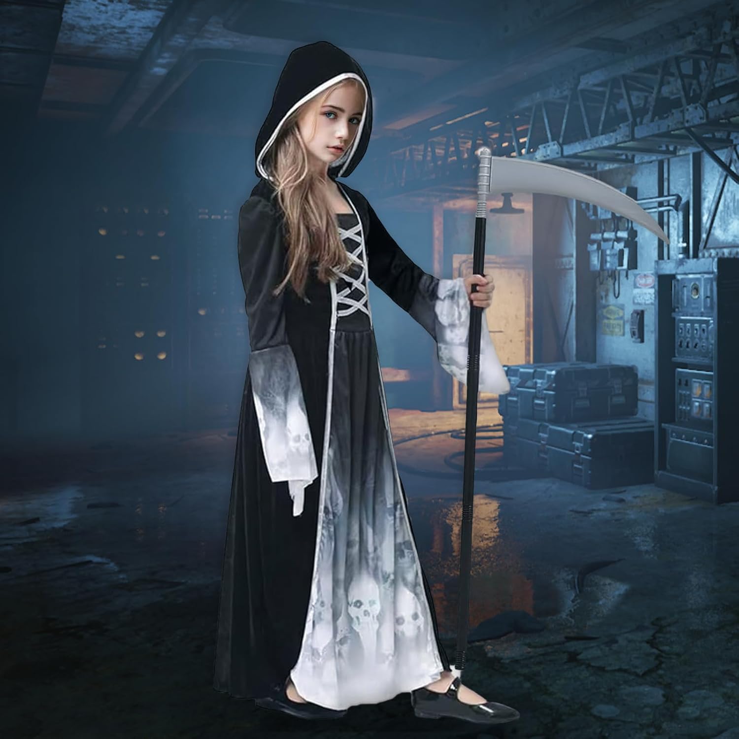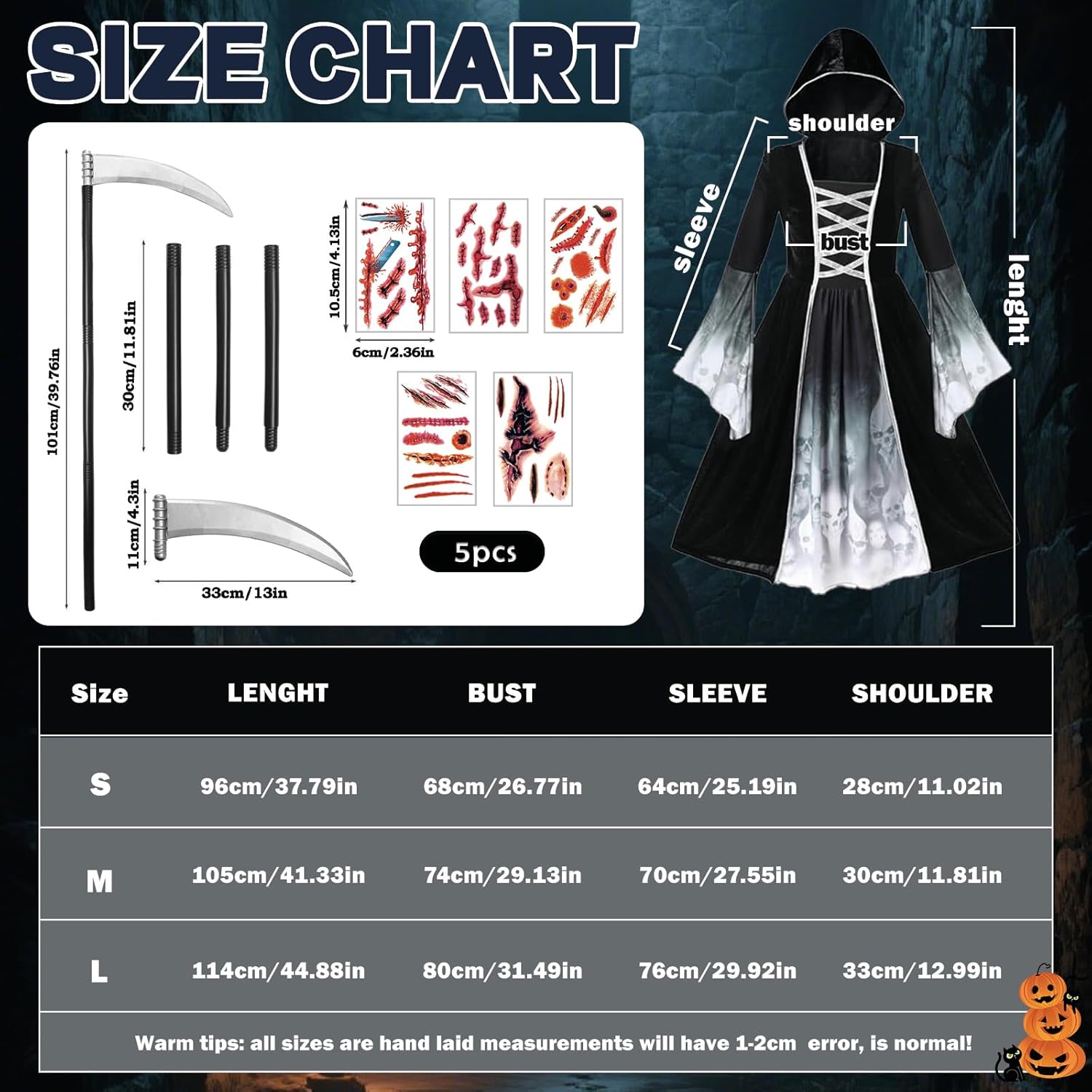 Tolles Halloween Kostüm für Mädchen. In der Größe S passt es perfekt einer 8 jährigen. Es fühlt sich gut von der Qualität an. Das Design ist edel gestaltet. Die Mütze lässt sich praktisch mit Klett abnehmen oder dransteckecken. Es sind tolle gruselige Halloween Tattoos dabei. Die Sense ist sehr leicht und lässt sich somit super als Accessoires mitnehmen.