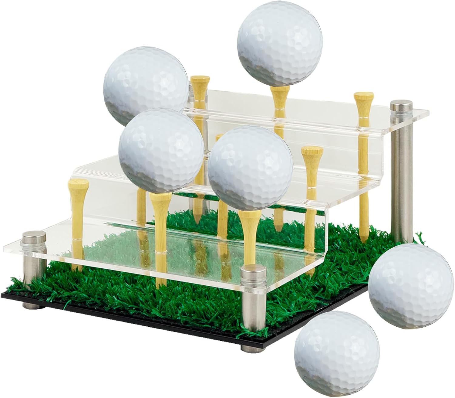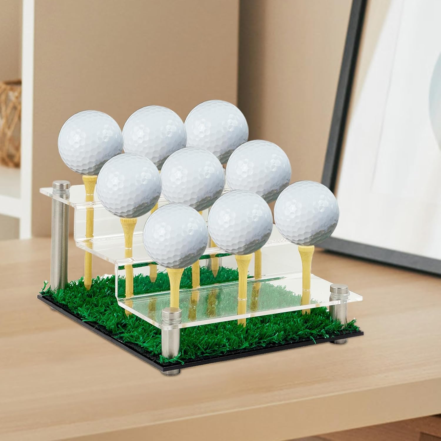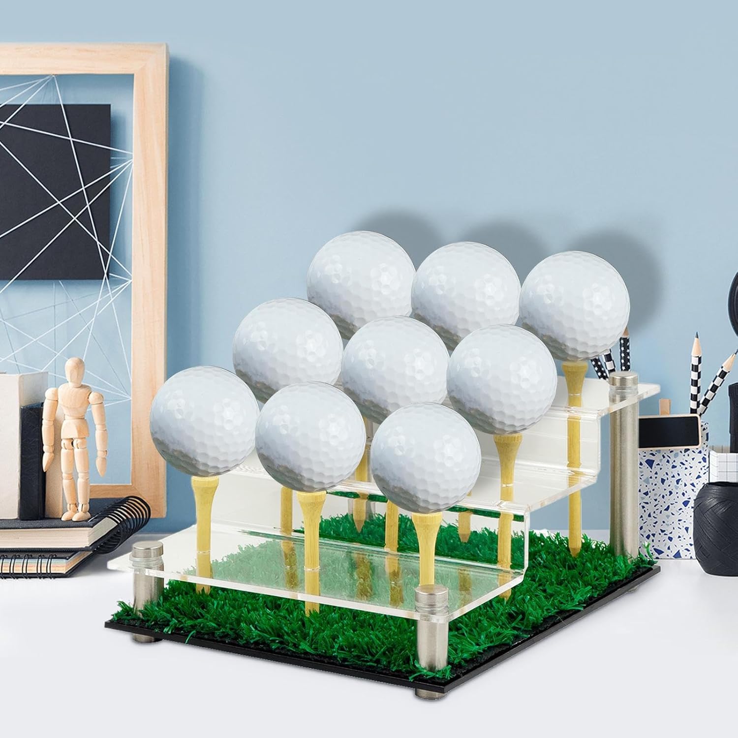 Organizer compatto per palline: appositamente progettato per i collezionisti, il design ottimizzato per il posto con capacità di 9 palline, perfetto per riporre in modo ordinato ed elegante gli accessori da golf Funzione di presentazione sfalsata: il design organizzatore a più livelli con supporto integrato per la palla consente angoli di visualizzazione ottimizzati e allo stesso tempo riporre gli utensili da golf Ottima presentazione: realizzata in acrilico di alta qualità, questa vetrina garantisce una visione cristallina delle vostre palline da golf, le mantiene al sicuro e rimane trasparente grazie alla resistenza all'ingiallimento. Vetrina per pallina da golf: combina il design del golf con terreno erboso naturale. La cornice trasparente completa le decorazioni verde e mostra le vostre palline da golf in modo attraente. Multiuso: un raffinato accessorio per il soggiorno e una soluzione versatile di presentazione, aggiunge funzionalità alla tua casa. Mostra le tue palline da golf come un pezzo da collezione eccezionale in qualsiasi studio o area salotto e funge da elegante accessorio per mostrare la tua collezione di palline.