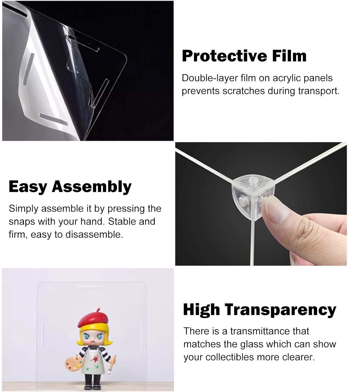 【Scatola espositiva in acrilico trasparente】 Realizzata in acrilico di alta qualità, la copertura antipolvere offre una visione chiara a 360°. La vetrina in acrilico è più leggera e più sicura del vetro. Mantenere la raccolta priva di polvere, ridurre la luce solare e i raggi ultravioletti e ridurre il rischio di danni al contenuto. 【Adatto a vari oggetti da collezione】 La nostra vetrina in acrilico protegge e mette in mostra figurine, modelli, case in miniatura, premi, bambole, giocattoli, automobili, gioielli, oggetti da collezione, palle da baseball, ricordi di nozze, fiori e altro ancora. Perfetto per l'esposizione in soggiorno, ufficio, negozio al dettaglio, ecc. 【Pellicola protettiva antigraffio】 La pellicola a doppio strato su pannelli acrilici previene i graffi durante il trasporto. Si prega di notare che è necessario rimuovere la pellicola protettiva prima dell'installazione. 【Assemblaggio facile e veloce】 Grazie al design a scatto, i contenitori trasparenti sono molto facili da montare senza colla. Puoi costruire tu stesso una scatola di plastica in 5 minuti. Infine, posiziona i tuoi oggetti da collezione e il tetto installato è coperto sulla base in legno. 【Come scegliere la dimensione】 Misura prima la lunghezza, la larghezza e l'altezza della tua collezione e aggiungi almeno 3-5 cm (1-2 pollici) a questa cifra quando scegli una vetrina. Per personalizzazioni speciali contattateci