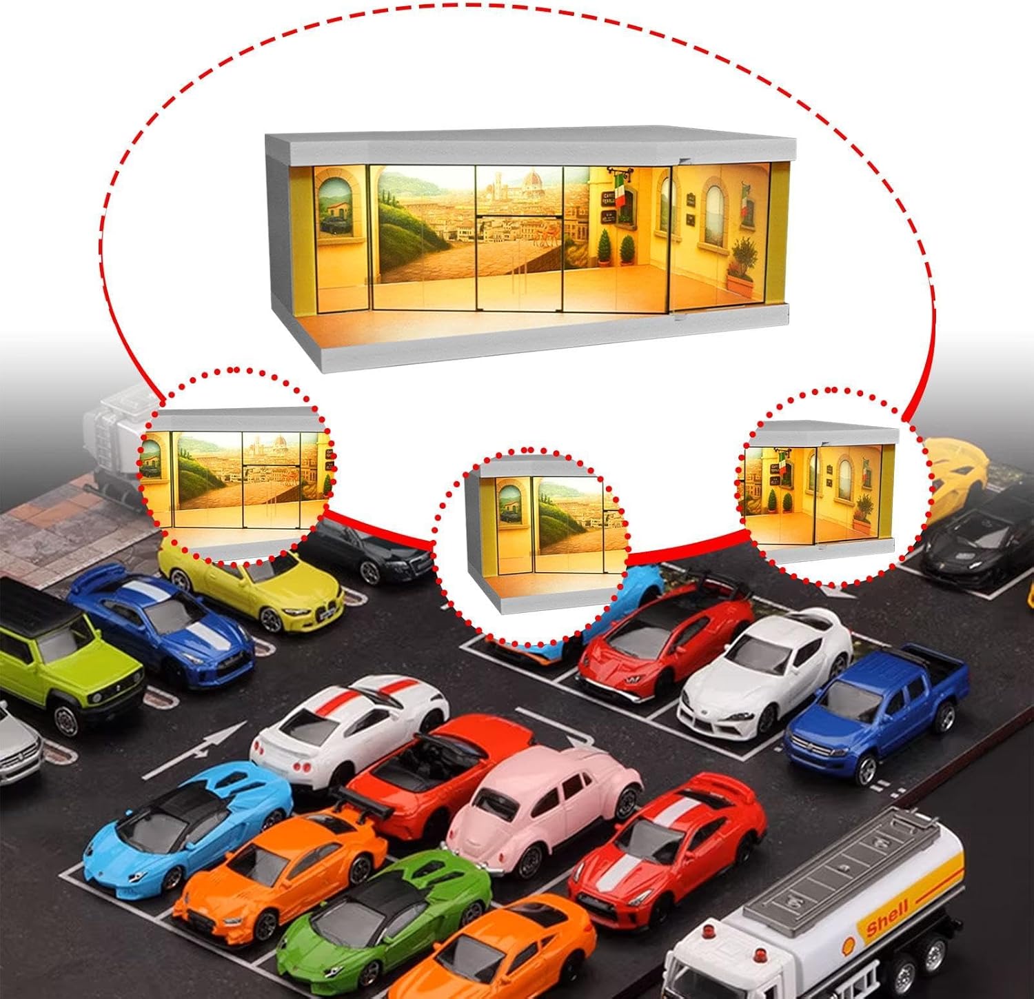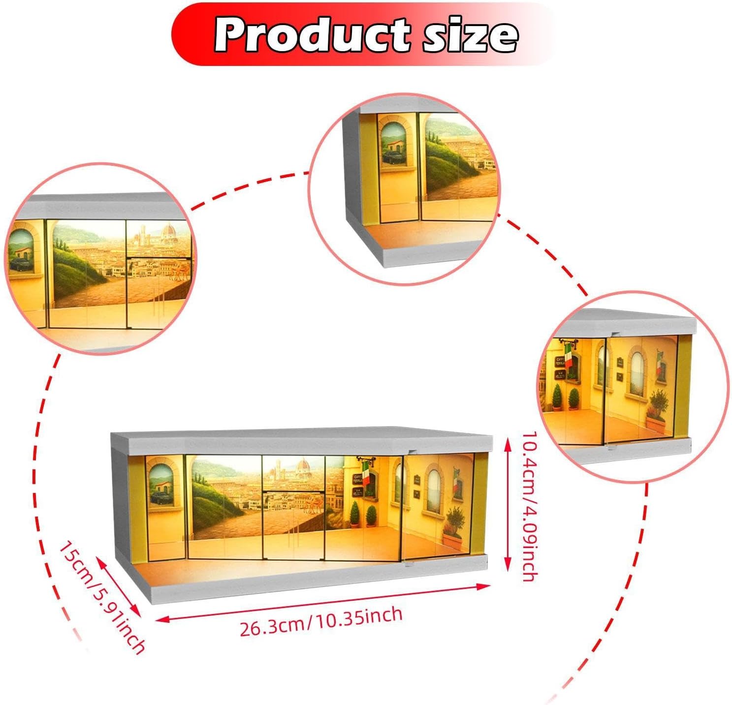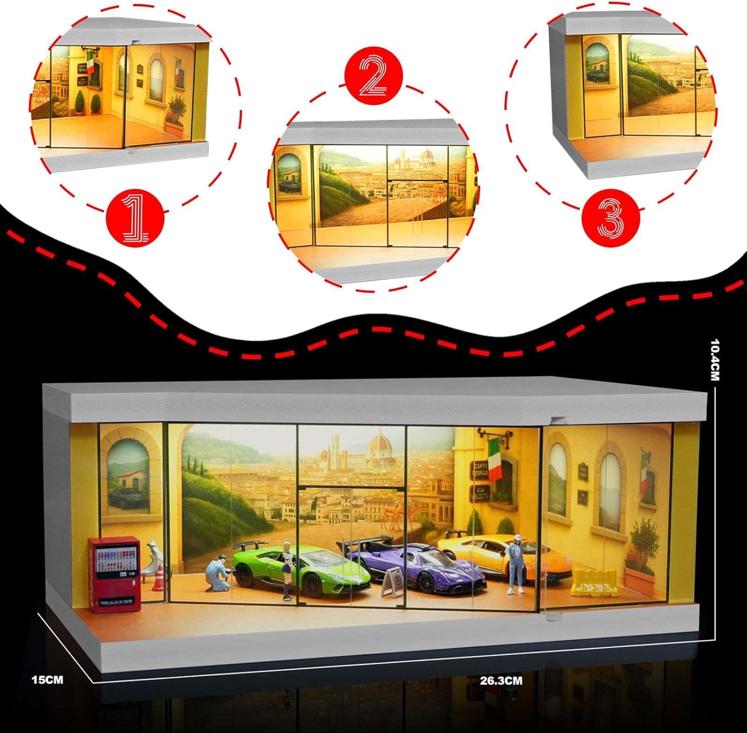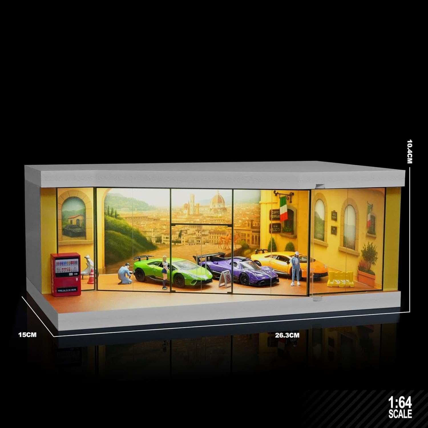 【Conservazione per 】: la vetrina per modellini di auto è adatta per conservare ed esporre modelli di auto in scala 1/64, proteggendo i tuoi modelli da polvere e danni 【Ottimo regalo】: la custodia per organizzare le è un'ottima scelta come regalo da collezione per appassionati e i collezionisti di modellini di auto, ideale per riporre, esporre, decorare, ecc., circa 26,3 cm x 15 cm x 10,4 cm / 10,35 pollici x 5,91 pollici x 4,09 pollici 【Decorazione per la casa】: la vetrina per modellini di auto in miniatura è un grazioso ornamento da scrivania, un decoro micro-paesaggio e un oggetto di scena per foto, adatto per casa, ufficio, negozio, ecc. 【Materiale premium】: la scatola di visualizzazione della scena in miniatura è realizzata in materiale PP, resina e fibra di legno di alta qualità, robusto, non facile da rompere e garantisce un lungo periodo di utilizzo 【Scenario in miniatura】: Diorama in miniatura realistico di una strada cittadina in , che offre un'atmosfera speciale per esporre i tuoi oggetti da collezione. Luce integrata, presa USB, interruttore di controllo per illuminare.