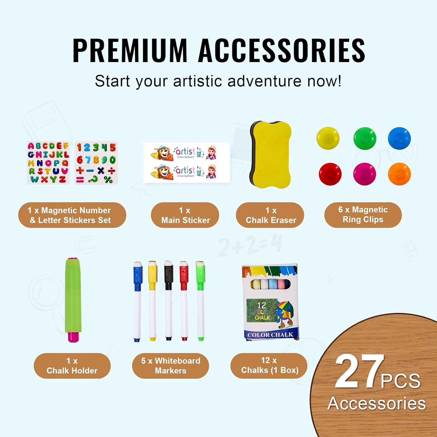 Due opzioni di pittura: questo cavalletto artistico per bambini è una lavagna e una lavagna bianca, tutto in uno! Il tuo bambino può tuffarsi nello scarabocchio, nella scrittura o nel disegno, rendendo ogni momento creativo pieno di divertimento e soddisfazione. Inoltre, con la sua rotazione a 360°, il tuo piccolo può creare da qualsiasi angolazione. Altezza regolabile: con due impostazioni di altezza (32,3 pollici/820 mm e 42,5 pollici/1080 mm), questo cavalletto da disegno per bambini cresce con il tuo bambino, rendendolo perfetto per le età 3+. Basta impostarlo all'altezza giusta e sono tutti pronti per un'esperienza di disegno comoda e piacevole. Set tutto in uno: abbiamo riempito questo cavalletto per bambini con tutto ciò di cui hanno bisogno! Viene fornito con 1 set di adesivi magnetici con numeri e lettere, 1 adesivo principale, 1 cancellino per gesso, 6 clip ad anello magnetiche, 1 porta gesso, 5 pennarelli per lavagna bianca e 12 gessetti: tutto pronto per farli tuffare nel loro prossimo capolavoro. Arte in movimento: con una tavola rimovibile, questo cavalletto per bambini piccoli consente al tuo bambino di disegnare ovunque! Togli la tavola e lascia che diventi creativo a tavola, sul divano, sul pavimento o anche all'aperto. È leggero e facile da trasportare, così il tuo piccolo artista può divertirsi a creare arte ovunque si trovi. Regalo perfetto per la crescita creativa: fai un regalo che è più di un semplice divertimento. Questo cavalletto da disegno per bambini aiuta i bambini a sviluppare capacità motorie fini, creatività, immaginazione e capacità di risoluzione dei problemi. È un ottimo modo per supportare la loro crescita e al contempo tenerli intrattenuti!