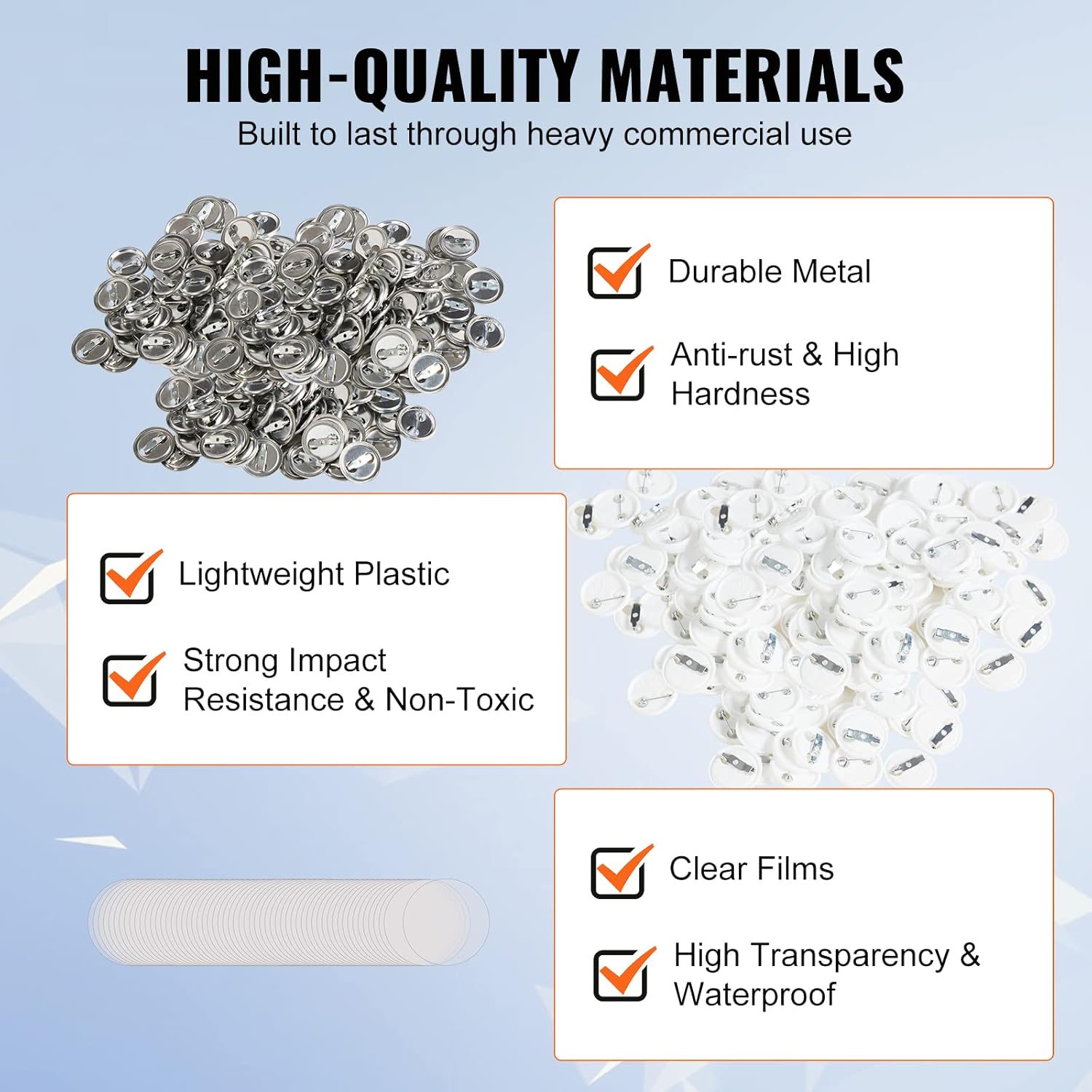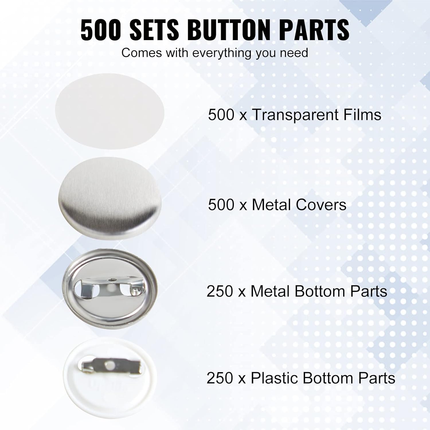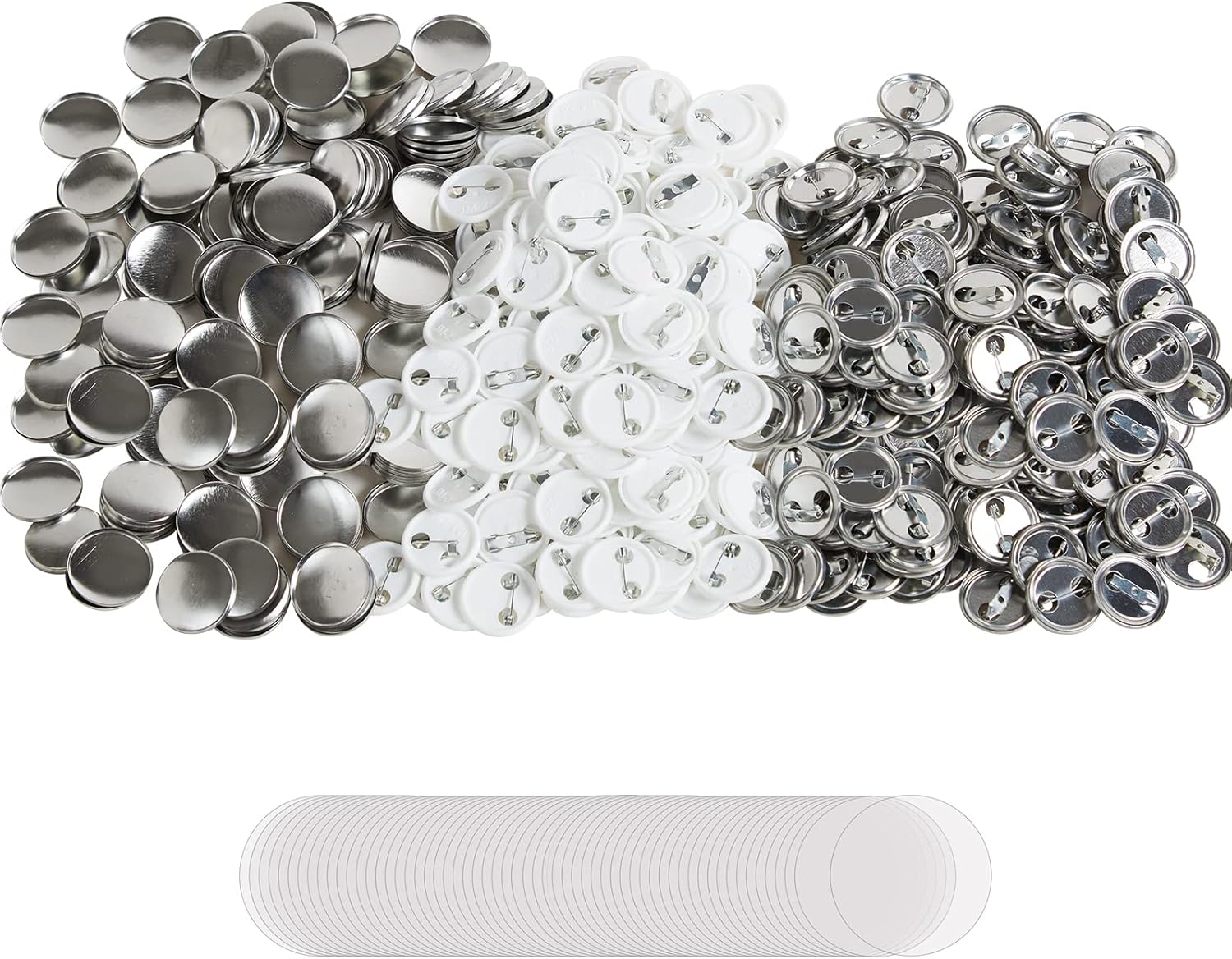 Accessori Completi per Creazione: includono 500 pezzi di bottoni badge per realizzare spille personalizzate, inclusi 500 pezzi di pellicole trasparenti, 500 pezzi di coperture in metallo, 250 pezzi di parti inferiori in metallo, 250 pezzi di parti inferiori in plastica. Le diverse parti inferiori in metallo e plastica soddisfano le diverse esigenze. Perfettamente Applicabile: le parti dei bottoni per i produttori di bottoni sono adatte per la maggior parte delle macchine per bottoni da 25 mm sul mercato. Qualsiasi macchina primaria per la creazione di spilli da 25 mm può utilizzare le forniture per la creazione di bottoni. Design con Dettagli: la pellicola ad alta trasparenza assicura che il badge sia lucido. Osservando chiaramente l'aspetto del modello. La copertura in metallo e la parte inferiore in metallo garantiscono durata e prestazioni eccellenti. La parte inferiore in plastica non è facile da arrugginire. Tutto è per la comodità di permetterti di realizzare bottoni personalizzati perfetti. Ideale per Fai-da-te: le parti del badge dei bottoni sono perfette per creale piccoli oggetti di memoria per gli amici. È possibile utilizzare la pressa per spille per badge per realizzare vari bellissimi badge. È anche eccellente per spille, cravatte, portachiavi, apribottiglie, ecc. Facile da usare: il processo operativo è semplice. Ci vuole solo poco tempo per creare un badge lucido. La solida struttura renderà il viaggio per la creazione di badge più sicuro e conveniente. Preparati per iniziare a creare!
