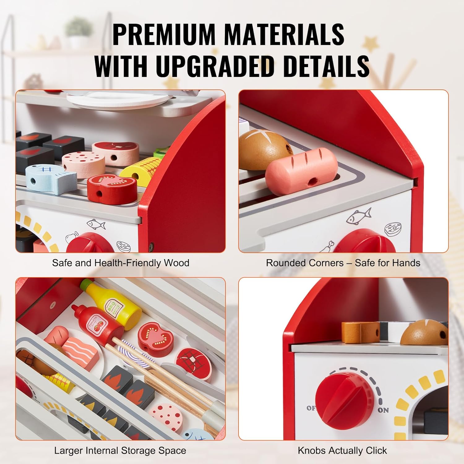 Fun Grill Playset: scatena l'immaginazione del tuo piccolo chef con il nostro playset con griglia da barbecue in legno da banco! È l'aggiunta definitiva alla sua cucina giocattolo, dove può creare magie culinarie insieme ad altri giocattoli da cucina. Infilza gli ingredienti, mettili sulla griglia, accendi la stufa con un clic, cospargi di spezie, gira gli ingredienti con le pinze e servi il divertimento per amici e familiari. È un'avventura culinaria che scatena gioia e creatività! Set da gioco per grigliate da 26 pezzi: questo realistico set da gioco per grigliate per bambini piccoli include tutto ciò di cui i bambini hanno bisogno per ore di gioco fantasioso. Include carne simulata come maiale, manzo, pesce, coscia di pollo e verdure come peperone verde, pomodoro, mais e cipolla. I bambini possono mescolare e abbinare il cibo e gli accessori giocattolo per creare le proprie avventure alla griglia, potenziando la loro creatività e le loro capacità di smistamento. Potenzia le capacità cognitive: il nostro set da gioco per barbecue per bambini aiuta i bambini a migliorare la coordinazione occhio-mano, a imparare a grigliare e a riconoscere cibi diversi. Abbinando verdure e carne simulate, i bambini possono imparare a nutrirsi in modo equilibrato. Possono giocare in modo indipendente o con gli amici. Materiali sicuri e durevoli: realizzato con materiali di alta qualità, il nostro set da gioco per grigliate per bambini è liscio, senza sbavature, privo di BPA e approvato tramite test di sicurezza. È un fantastico regalo di compleanno per bambini dai 3 ai 5 anni ed è perfetto per giocare all'aperto. Facile da montare e riporre: montare questo set di griglia da gioco è un gioco da ragazzi e tutti i pezzi si inseriscono ordinatamente all'interno della griglia, quindi non c'è bisogno di ulteriore spazio di archiviazione.