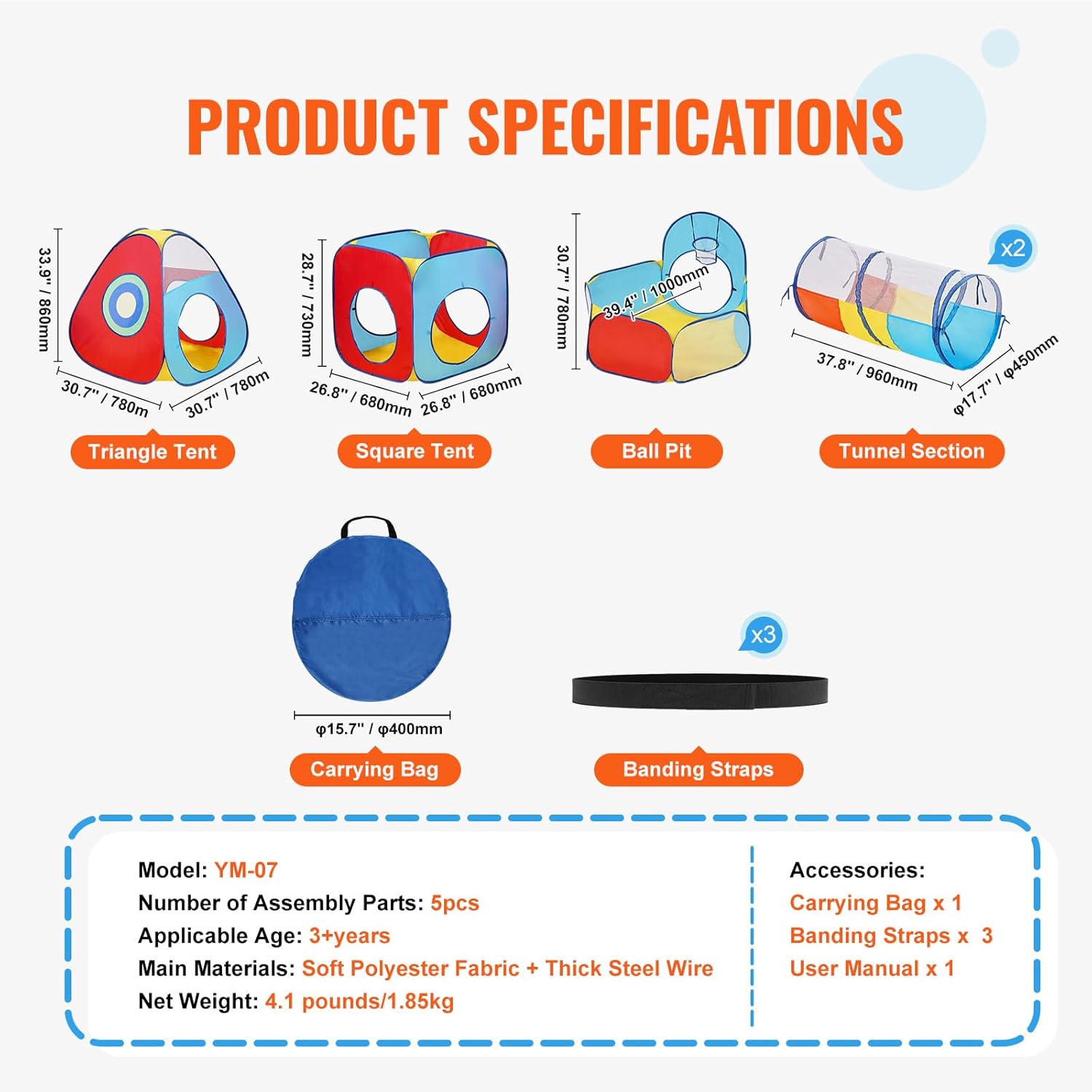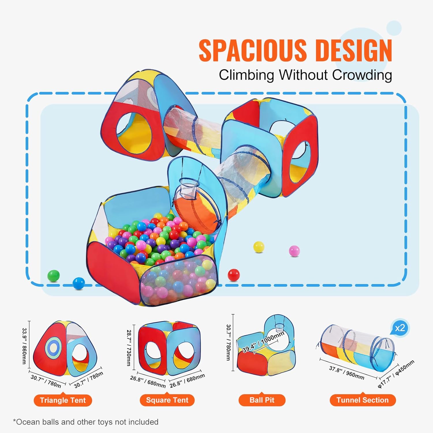 Materiale sicuro e confortevole: il tunnel della tenda è realizzato in morbido tessuto di poliestere e robusto supporto in filo di acciaio, garantendo un ambiente di gioco confortevole e sicuro per i bambini. Il materiale è resistente agli strappi ed è conforme agli standard CPSIA, rendendo sicuro il gioco dei bambini all'interno. Spaziosa area di arrampicata: questo tunnel per tenda è composto da 5 segmenti, con un diametro del tunnel di φ17,7''/450 mm e un ingresso spazioso adatto a bambini di varie dimensioni. Consigliato per i bambini di più di 3 anni, potranno arrampicarsi e giocare all'interno e posizionare anche giocattoli come palloni (da fornire a parte). Immaginazione scintillante: i colori vivaci e luminosi sono progettati per catturare l'attenzione dei bambini e accendere la loro immaginazione. Con un design a 5 sezioni, i bambini possono organizzare e giocare liberamente, sia che si tratti di inseguire, gattonare o giocare a nascondino all'interno del tunnel della tenda. Leggero e facile da riporre: il tunnel della tenda è leggero e può essere rapidamente ripiegato dopo l'uso. Viene fornito con cinghie di fissaggio e una comoda maniglia per il trasporto per riporlo e trasportarlo facilmente. Perfetto compagno di gioco per bambini: questo tunnel per tenda può essere utilizzato all'interno o in cortile ed è ottimo per le feste dei bambini, creando uno spazio di intrattenimento per i bambini.