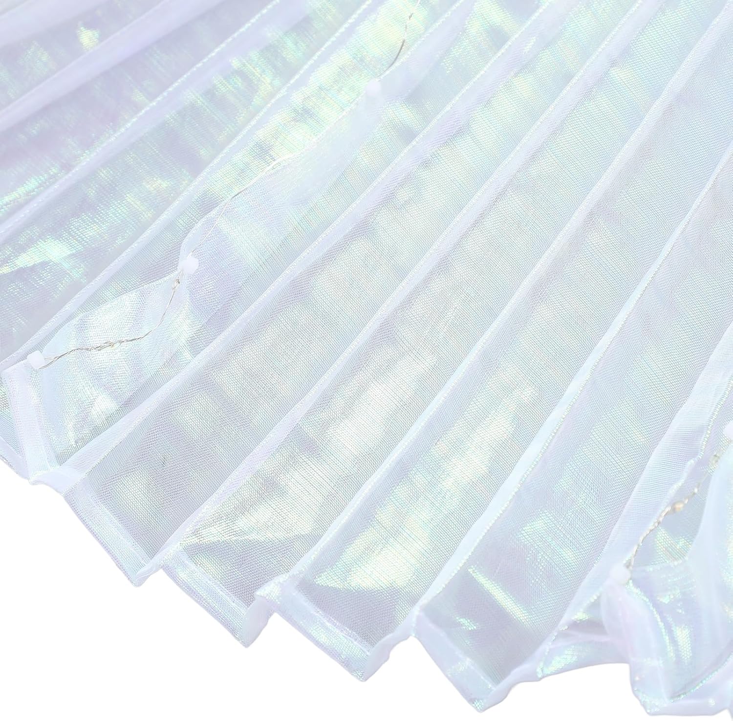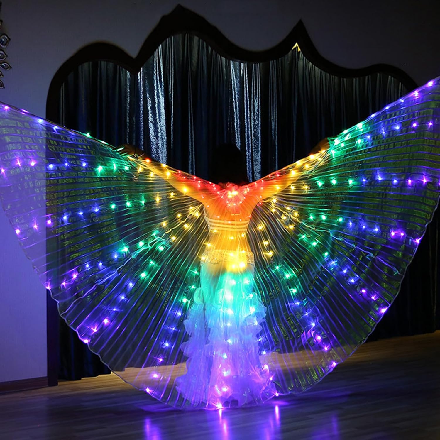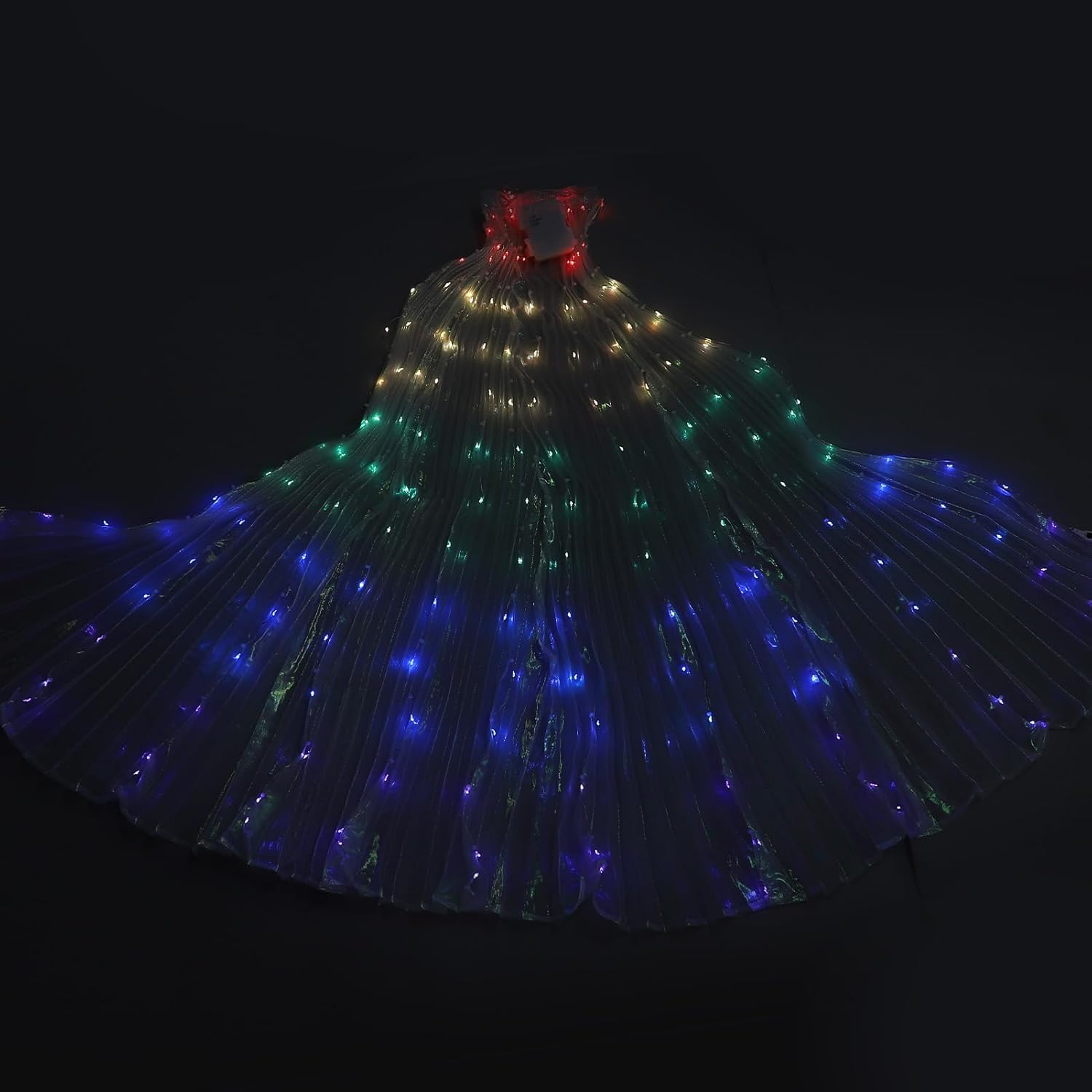 LED ad alta luminosità: questa ala luminosa adotta LED ad alta luminosità, supporta modalità di luce costante e lampeggiamento veloce, aggiungendo effetti decorativi alla performance sul palco e attirando l'attenzione del pubblico. Buone prestazioni: con una lavorazione squisita, questo abbigliamento ad ala luminosa non ha punti di saldatura, con elevata flessibilità, basso consumo energetico, facile manutenzione e lunga durata. Flessibile: questa ala LED è dotata di un collo autoadesivo facile da indossare e da togliere, supporta un'estensione a 360 gradi, può essere sollevata sopra la testa, facendoti brillare di più in mezzo alla folla. Alimentato a batteria: questo abbigliamento ad ala luminosa è alimentato da 3 batterie AA (non incluse), che lo rendono comodo da usare sempre e ovunque senza la necessità di collegare un cavo elettrico. Scene applicabili: questo costume ad ala LED è molto adatto per danza del ventre, spettacoli teatrali, feste, oggetti di scena da bar, fotografia interna ed esterna, cosplay e altre scene.