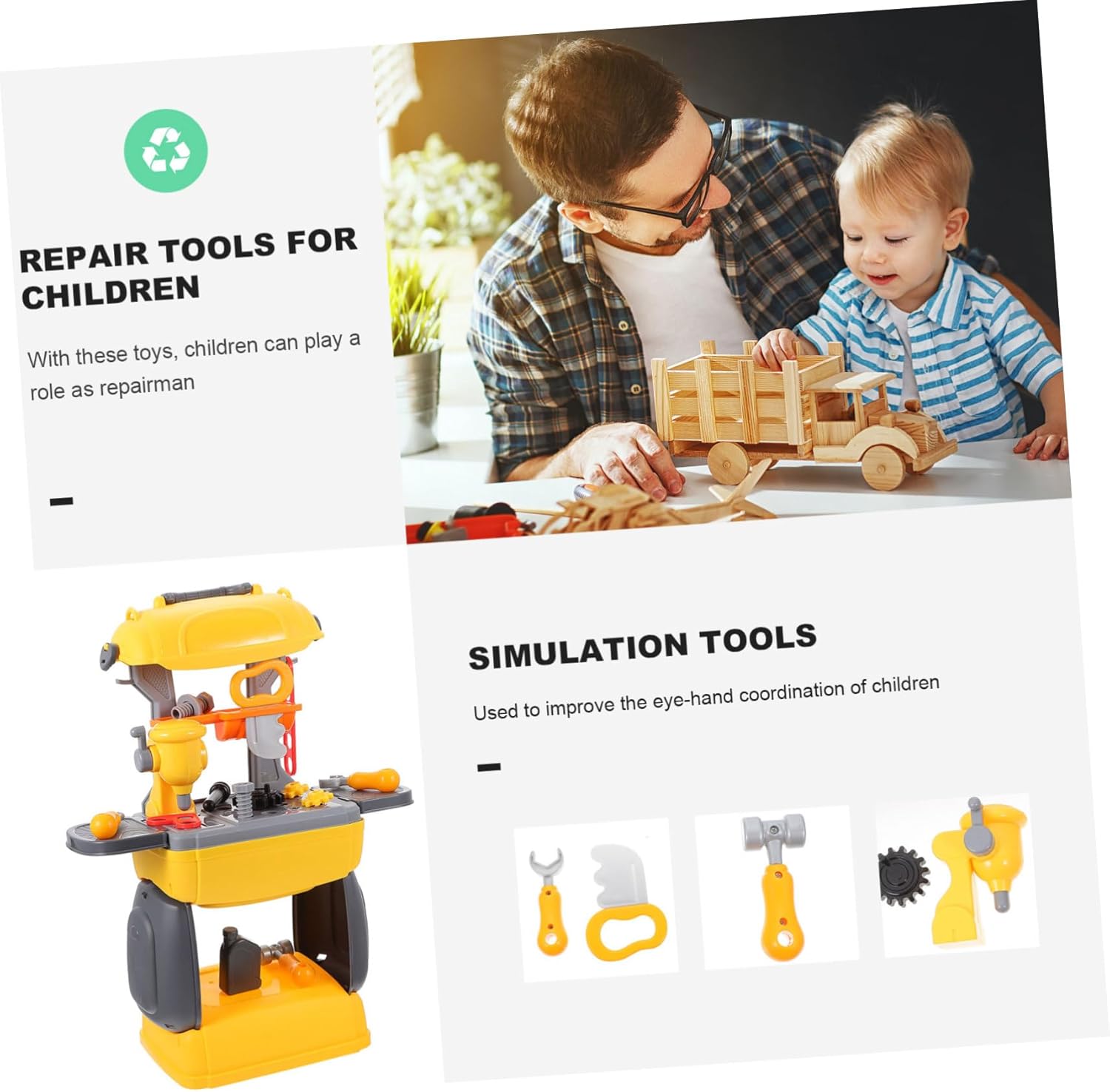Educativo – un educativo per il vostro bambino, adatto anche per l'interazione genitore-bambino, partito, cognitivo Strumenti di riparazione deformabili: una vasta gamma di accessori per utensili può migliorare le capacità cognitive e la creatività dei bambini. Strumenti di riparazione Gioco di ruolo: può promuovere la creatività e l'immaginazione del bambino e stimolarlo a dare libero sfogo alla sua natura Accessorio per casetta da gioco: il design attento e accurato consente al bambino di conservare e riparare gli accessori dopo averlo Cognitivo: modelli di simulazione vivaci e luminosi possono attirare l'attenzione dei bambini e renderli più divertenti. giocattolo portatile per ingegneria