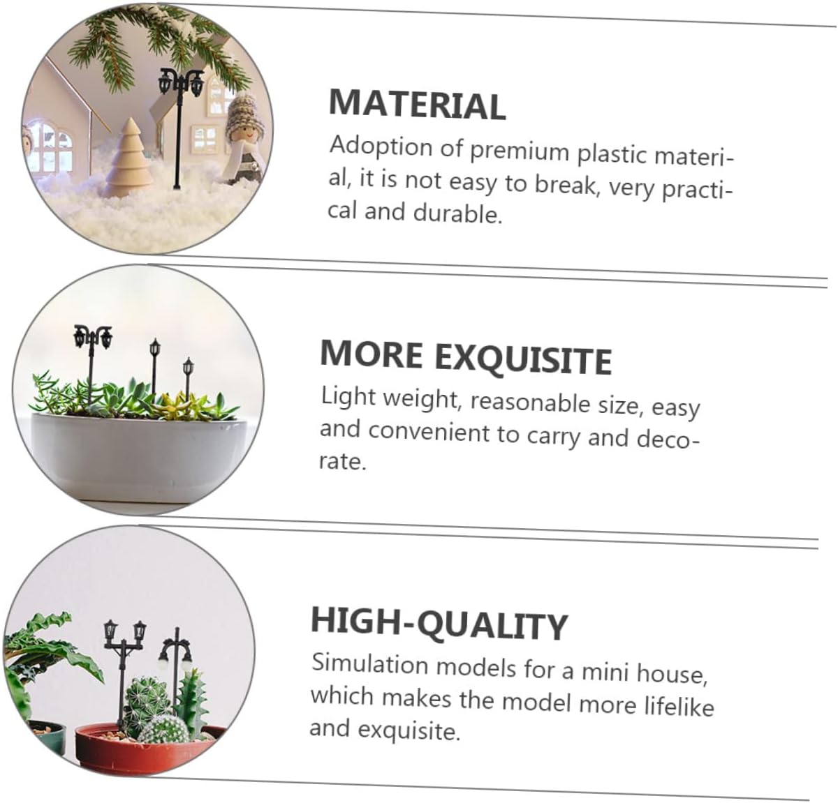 Lampione in miniatura: le caratteristiche di lavorazione delicata e la forma speciale lo rendono molto realistico, un importante accessorio per la mini casa e lo rendono più attraente e reale, mini lampione. Mini trenini: questo articolo è ben progettato e realizzato per offrirti il miglior mini-decorazione per il percorso del giardino e il lampione per la casa. Modello di lampione: modelli di simulazione per una mini casa, che rendono il modello più realistico e squisito, lampada da giardino in miniatura. Lampione stradale in miniatura: progettato appositamente per la decorazione per rendere la tua casa più calda e delicata, mini lampada da città. Treno in miniatura: l'artigianato raffinato lo fa sembrare un lampione stradale per lungo tempo, mini lampioni.