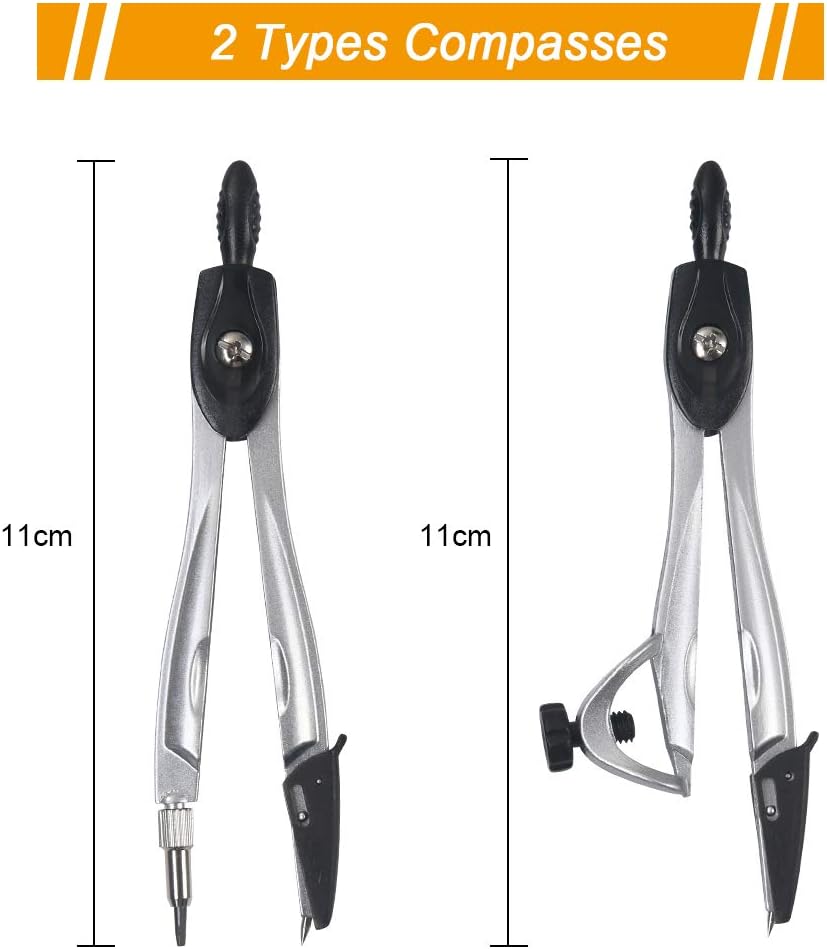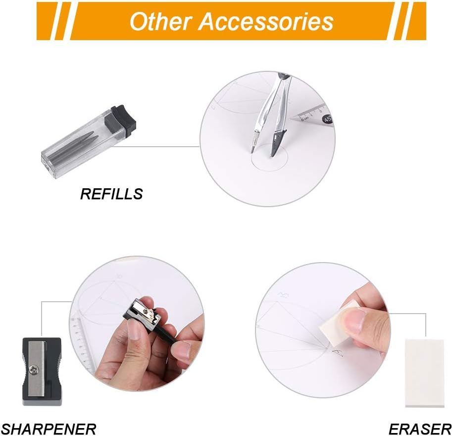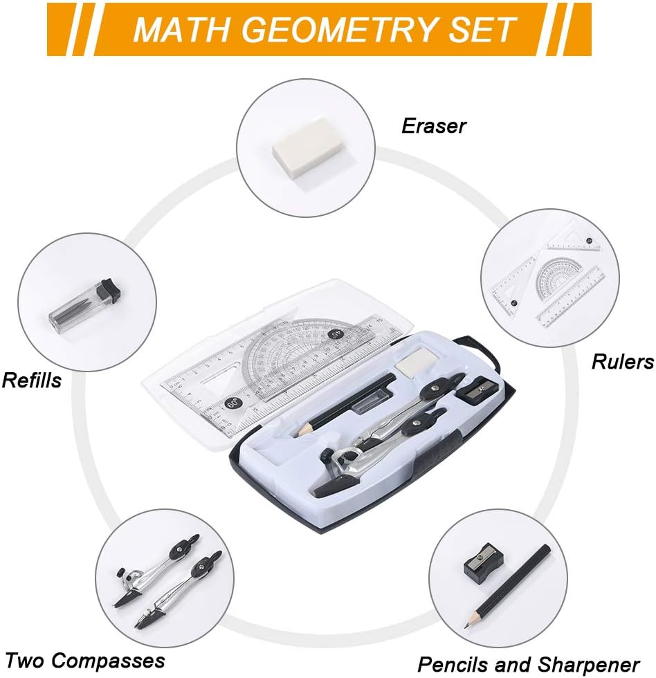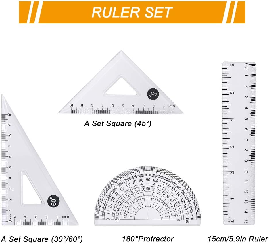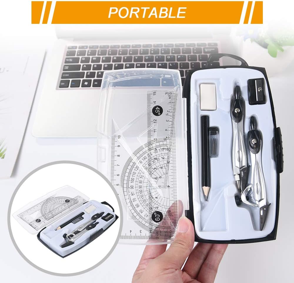 📐Strumenti completi: 10 pezzi inclusi: 2 * bussola, 1 * goniometro, 1 * quadrato (30 ° / 60 °), 1 * quadrato (45 °), 1 * righello, 1 * nucleo della penna della bussola, 1 * gomma , 1 * matita, 1 * temperamatite. Questo set è adatto a persone diverse. 📏 Bussola matematica: la bussola della scuola si disegna fino a un cerchio di 10 pollici di diametro. 2 diversi tipi di bussole da disegno possono soddisfare le tue diverse esigenze. Puoi scegliere liberamente di utilizzare direttamente il nucleo della bussola o la matita. 📐 Righelli e goniometro: il set di righelli è realizzato in plastica trasparente per una facile misurazione. Il righello da 15 cm, i quadrati a 45 ° e 60 ° e il goniometro a 180 ° sono realizzati con materiali di alta qualità per una facile identificazione insieme alle graduazioni CM e metriche. 📝 Adatto per l'esame: 1 matita, 1 gomma, 1 temperamatite. La matita presenta una scrittura fluida e una lunga durata. La gomma è perfetta per cancellare rapidamente grandi aree. Questo set di astucci è la scelta perfetta per gli studenti. 📏 Ampia applicazione: la maggior parte degli strumenti geometrici sono confezionati in una scatola trasparente, che è facile da trasportare e riporre. Questo set è lo strumento essenziale per l'apprendimento della matematica per gli studenti e il regalo perfetto per la maggior parte delle fasi di insegnanti, ingegneri, designer, artisti, ecc.