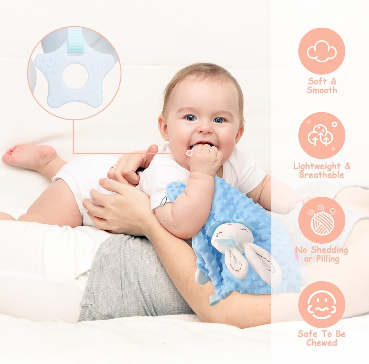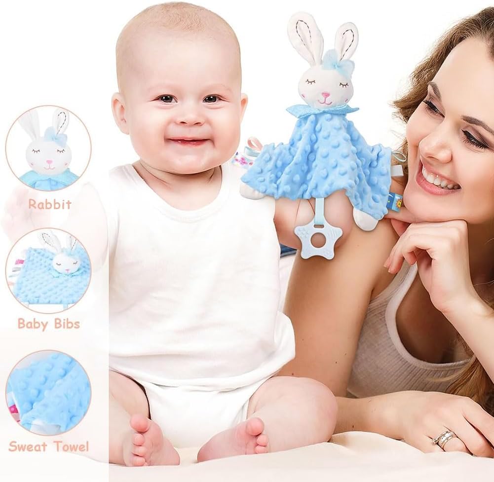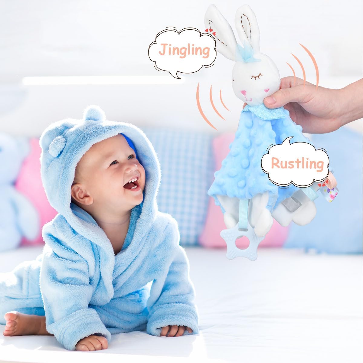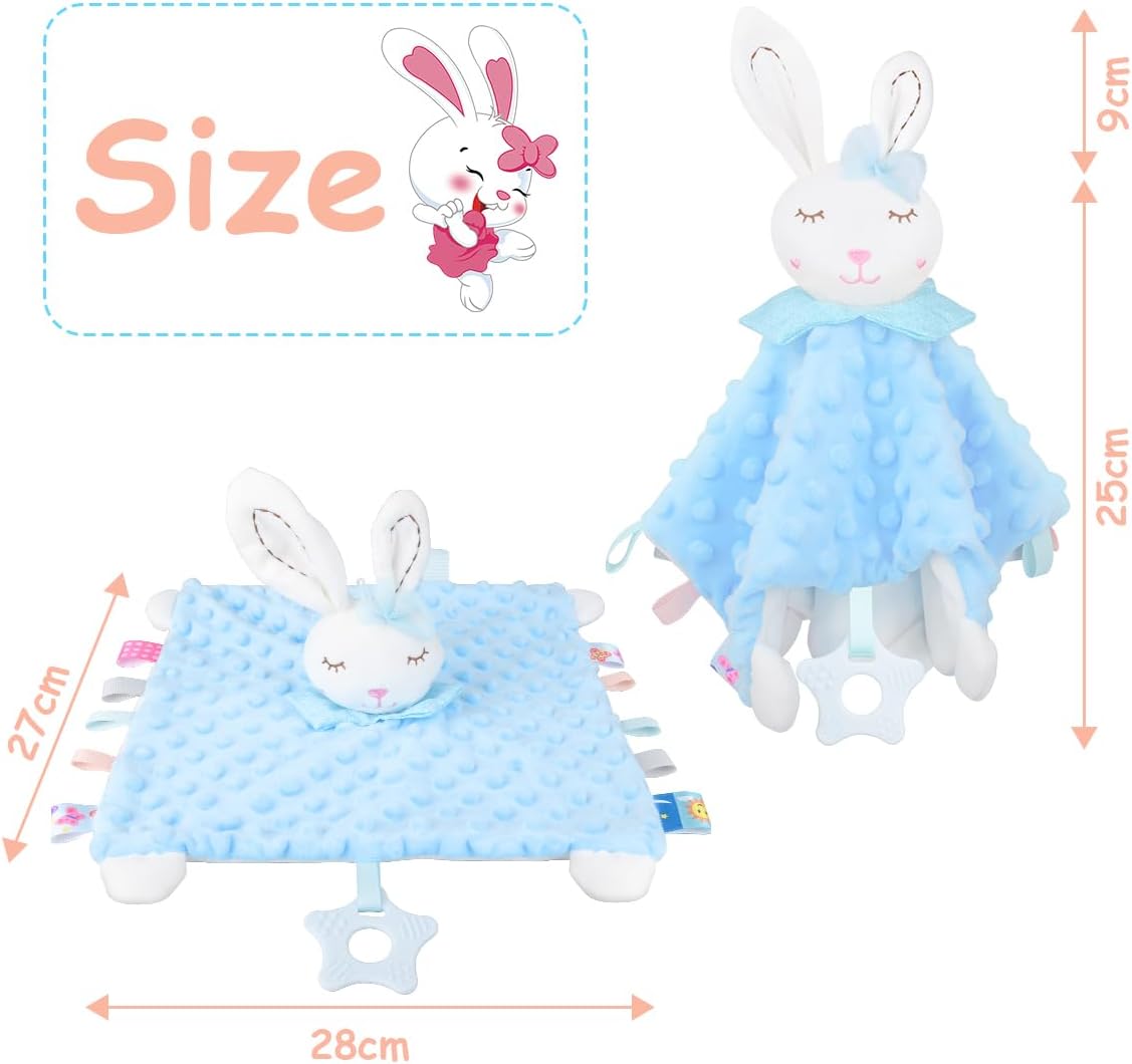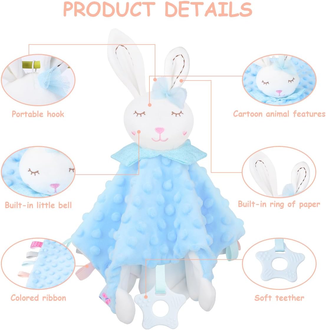 【Tessuto morbido】Fazzoletto-figura ultra-morbido e sicuro, realizzato in tessuto di prima qualità: soffice, leggero, traspirante, resistente a sfilacciature e pelucchi. 【Stimola i sensi】Il bordo è rifinito con un nastro che permette di afferrare e sollevare l’oggetto comodamente; mentre si tira o si morde il tessuto, si esplorano nuove sensazioni e si esercita la destrezza delle dita. 【Design speciale】Attiva vista, tatto e udito. I quattro nodi agli angoli stimolano il contatto. Pizzicando le orecchie del coniglio, si produce un delicato fruscio; il campanello interno emette un suono chiaro e piacevole. 【Design adorabile】Questa mini bambola fazzoletto è caratterizzata da un adorabile disegno a forma di coniglietto, che la rende la scelta ideale per attirare l'attenzione. 【Facile da trasportare】Di dimensioni compatte, solo 28 x 27 cm, può essere appeso al letto o al sedile dell'auto. Il fazzoletto a forma di coniglio non è solo bello, ma fa anche sentire i al sicuro.