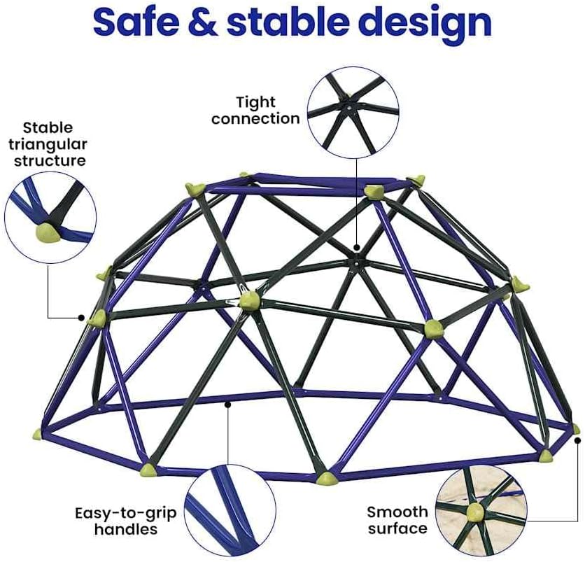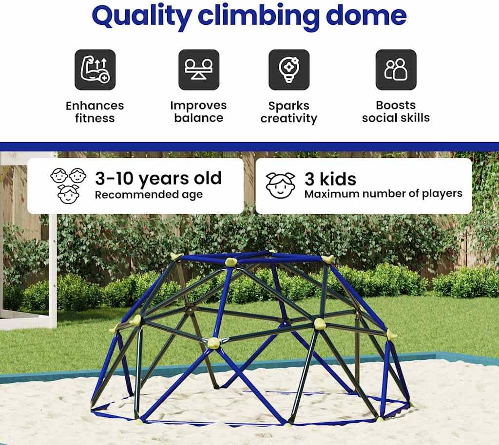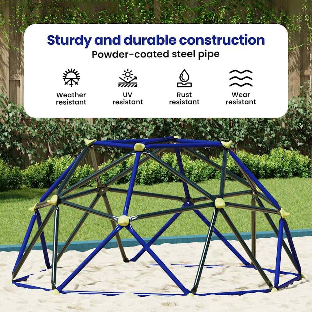 【 Struttura in Acciaio Robusto:】 Questo dome da arrampicata è fatto di acciaio resistente, garantendo stabilità e durata per il gioco attivo. La sua solidità supporta le avventure quotidiane, dando ai genitori la tranquillità che può resistere a qualsiasi sfida. Scegliendo l'acciaio per la sua resistenza, questo dome diventa una caratteristica duratura del tuo giardino. 【 Colori Vivaci:】 Con i suoi colori blu e giallo allettanti, il dome da arrampicata dà un bel tocco di colore a qualsiasi spazio esterno, mantenendo i bambini visivamente coinvolti e rendendo il gioco ancora più divertente. Queste tonalità vivaci non solo ravvivano l'ambiente, ma attirano anche i piccoli esploratori nei loro scenari di gioco immaginativi. 【 Resistente alle Intemperie:】 I materiali utilizzati sono impermeabili e resistenti ai raggi UV, assicurando che il dome duri in ogni condizione climatica. Che piova o ci sia sole, questo attrezzo da gioco è forte e sicuro, e il suo design aiuta a prevenire lo sbiadimento e il deterioramento nel tempo. 【 Assemblaggio Semplice:】 Servono solo due persone e un cacciavite per montarlo senza problemi, trasformando il tuo giardino in un ambiente divertente. Grazie alle istruzioni di assemblaggio chiare, le famiglie possono montarlo rapidamente, aumentando l'attesa per questa nuova aggiunta al divertimento.