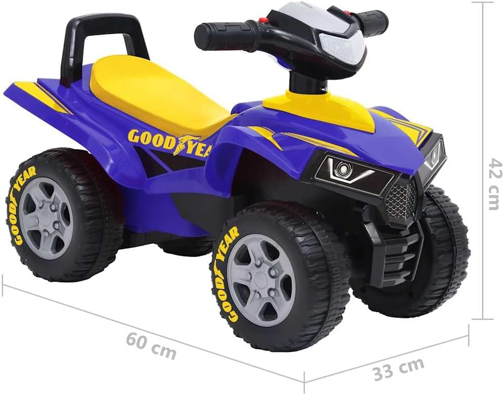 Questo fantastico quad cavalcabile Good Year, caratterizzato da un design iconico, è un giocattolo meraviglioso che offre ai tuoi bambini la migliore esperienza di guida È ufficialmente concesso in licenza da Good Year L'auto cavalcabile ha un sedile basso e uno schienale dal design ergonomico che facilita la salita e la discesa Lo schienale può fungere anche da barra di spinta per i genitori L'ampio spazio di stivaggio sotto il sedile può ospitare molti giocattoli e altri articoli che i vostri bambini vorrebbero portare con sé nelle loro avventure