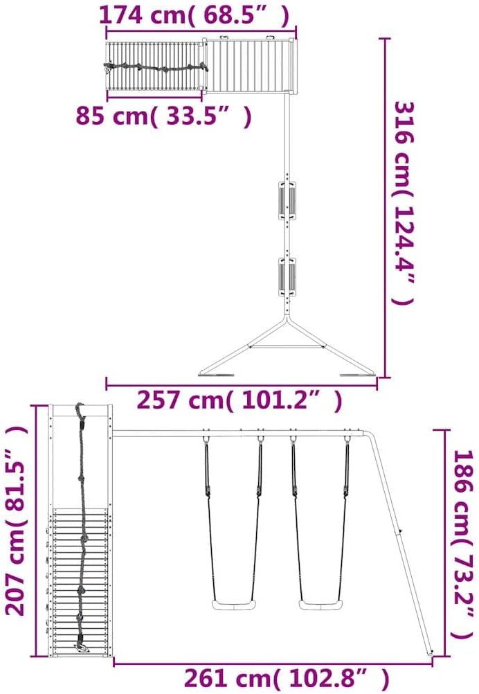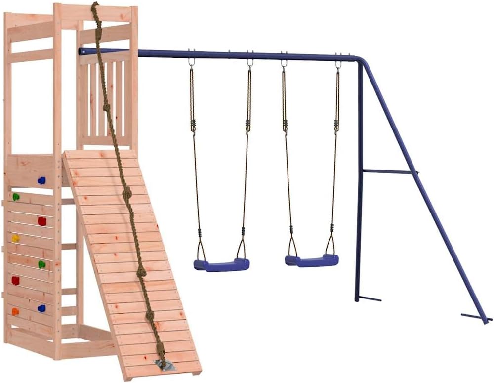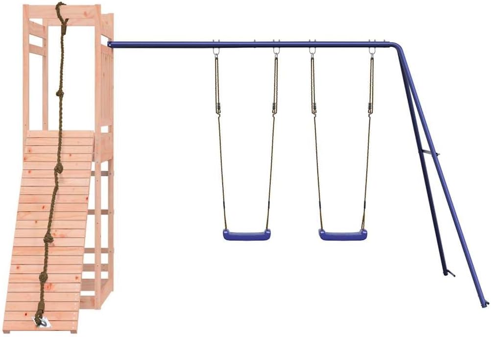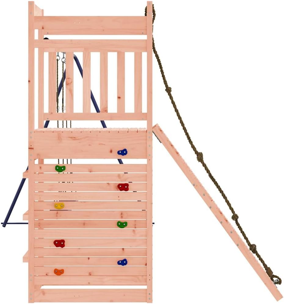 Vuoi dare ai tuoi figli la libertà di giocare a casa? Questo set da gioco all'aperto in legno trasforma il tuo giardino in un parco giochi adatto alle avventure fantasiose! Materiale durevole: questo set da gioco è realizzato in legno di douglas massiccio. Il legno Douglas massiccio è un legno molto resistente che funziona bene per esterni. Il legno Douglas è anche abbastanza forte da essere lavorato con la minima cura anche sotto l'influenza delle intemperie. 【Telaio robusto e stabile:】 Il telaio in legno dell'attrezzatura per il parco giochi garantisce robustezza e stabilità. Inoltre, i piedi a forma di A dell'altalena per bambini aiutano a mantenere l'equilibrio. 【Centri multi-attività:】 Il parco giochi in legno è dotato di una piattaforma di 118 cm di altezza e si distingue per la sua parete da arrampicata con corda, una parete da arrampicata, una doppia altalena e una sandbox. I tuoi figli possono anche invitare i loro amici a divertirsi. 【Design riflettente:】 Le ringhiere in legno che lo circondano sono progettate per garantire la sicurezza dei bambini durante i loro giochi.