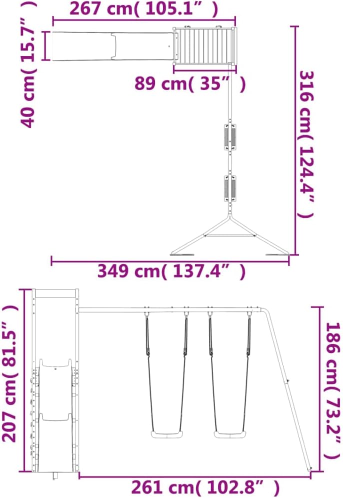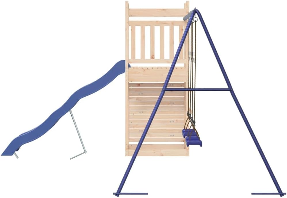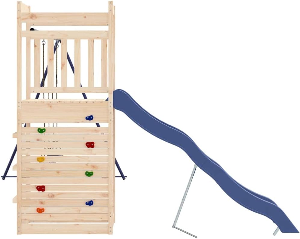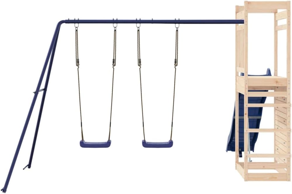 Vuoi dare ai tuoi figli la libertà di giocare a casa? Questo set da gioco all'aperto in legno trasforma il tuo giardino in un parco giochi adatto alle avventure fantasiose! Materiale durevole: questo parco giochi è realizzato in legno di pino massiccio. Il legno di pino massiccio è un materiale naturale bellissimo. Il legno di pino ha una grana dritta e i nodi conferiscono al materiale il suo aspetto caratteristico e rustico. Telaio robusto e stabile: il telaio in legno dell'attrezzatura per il parco giochi garantisce robustezza e stabilità. Inoltre, i piedi a forma di A dell'altalena per bambini aiutano a mantenere l'equilibrio. Centri multiattività: il parco giochi in legno è dotato di una piattaforma di 118 cm di altezza e si distingue per lo scivolo ondulato, la parete da arrampicata, una doppia altalena e una sandbox. I tuoi figli possono anche invitare i loro amici a divertirsi. Design riflettente: le ringhiere in legno che lo circondano sono progettate per garantire la sicurezza dei bambini durante i giochi.