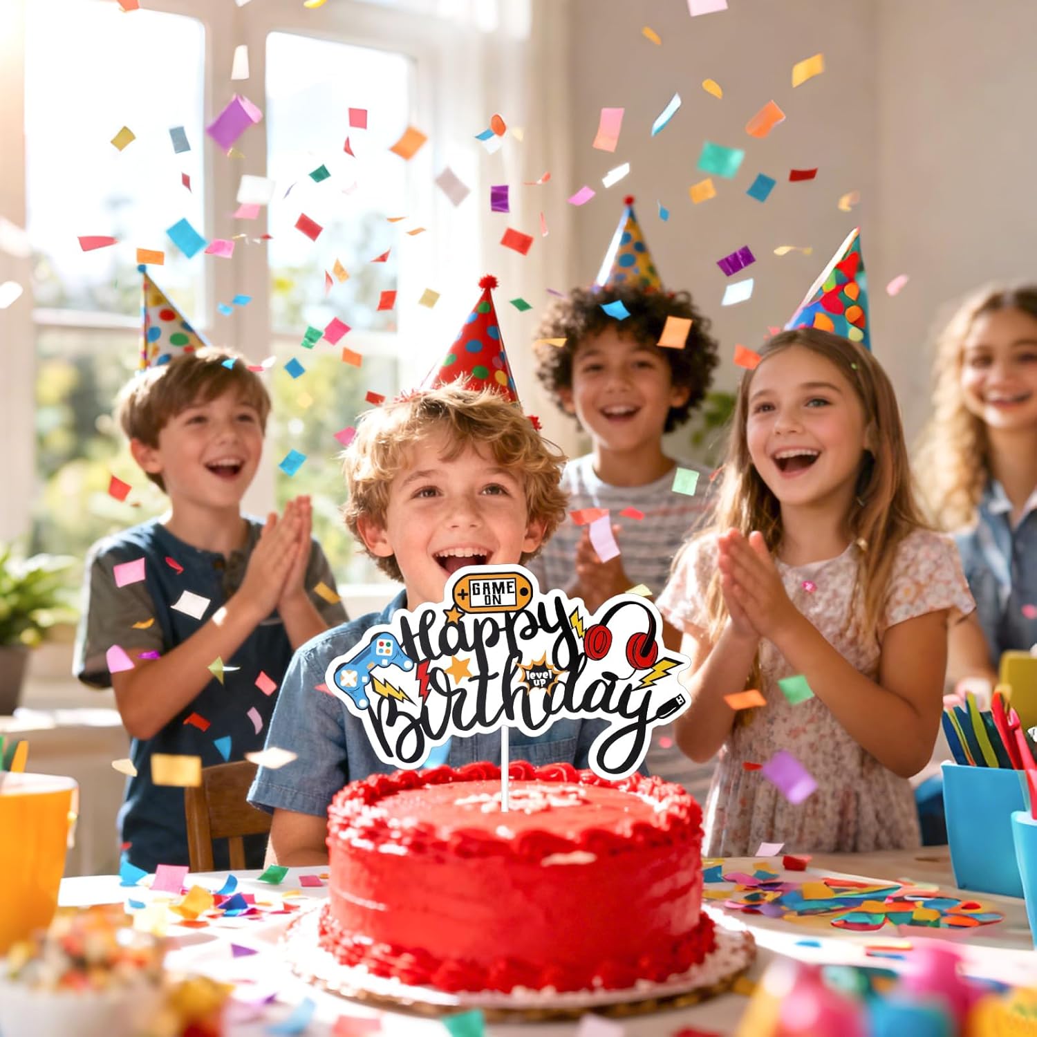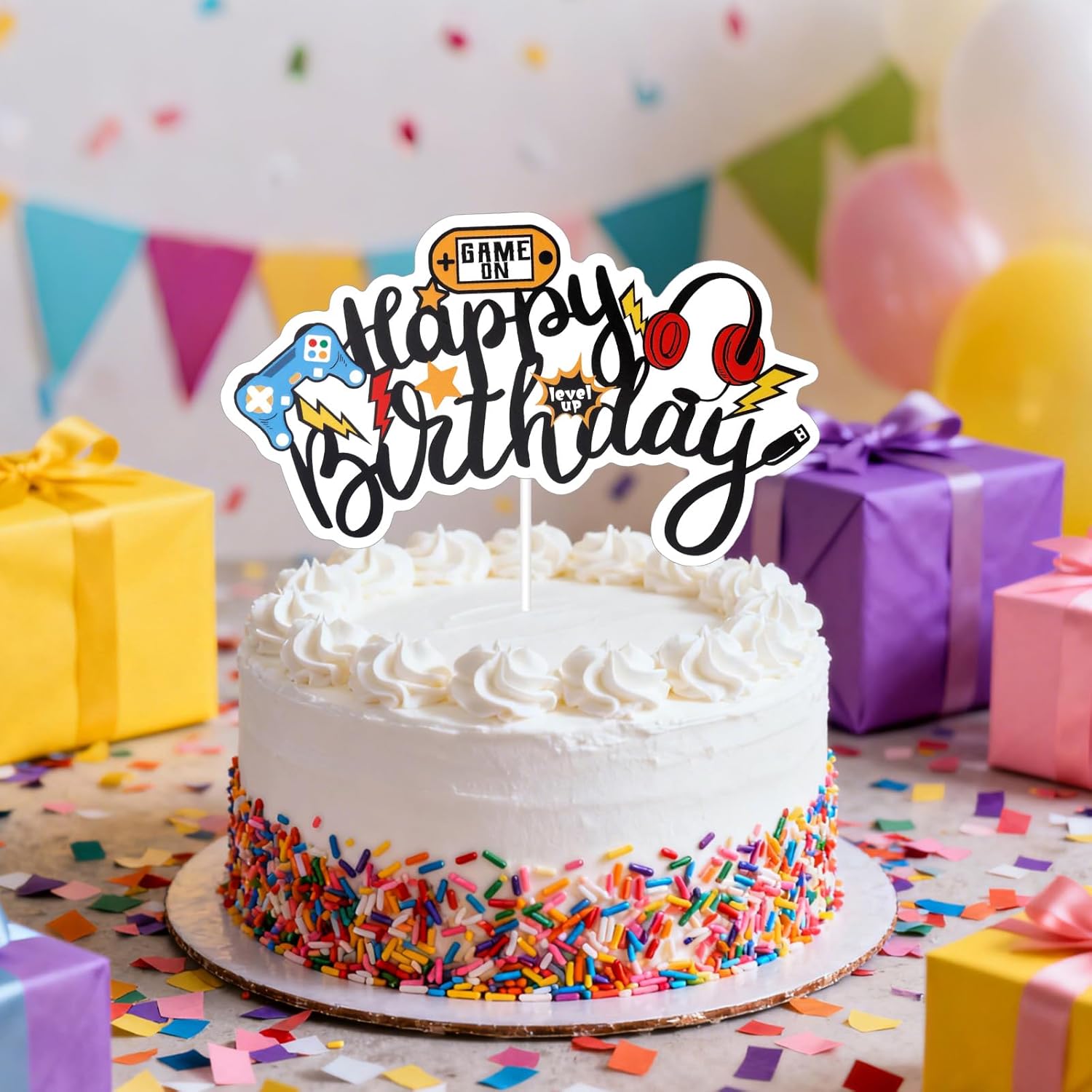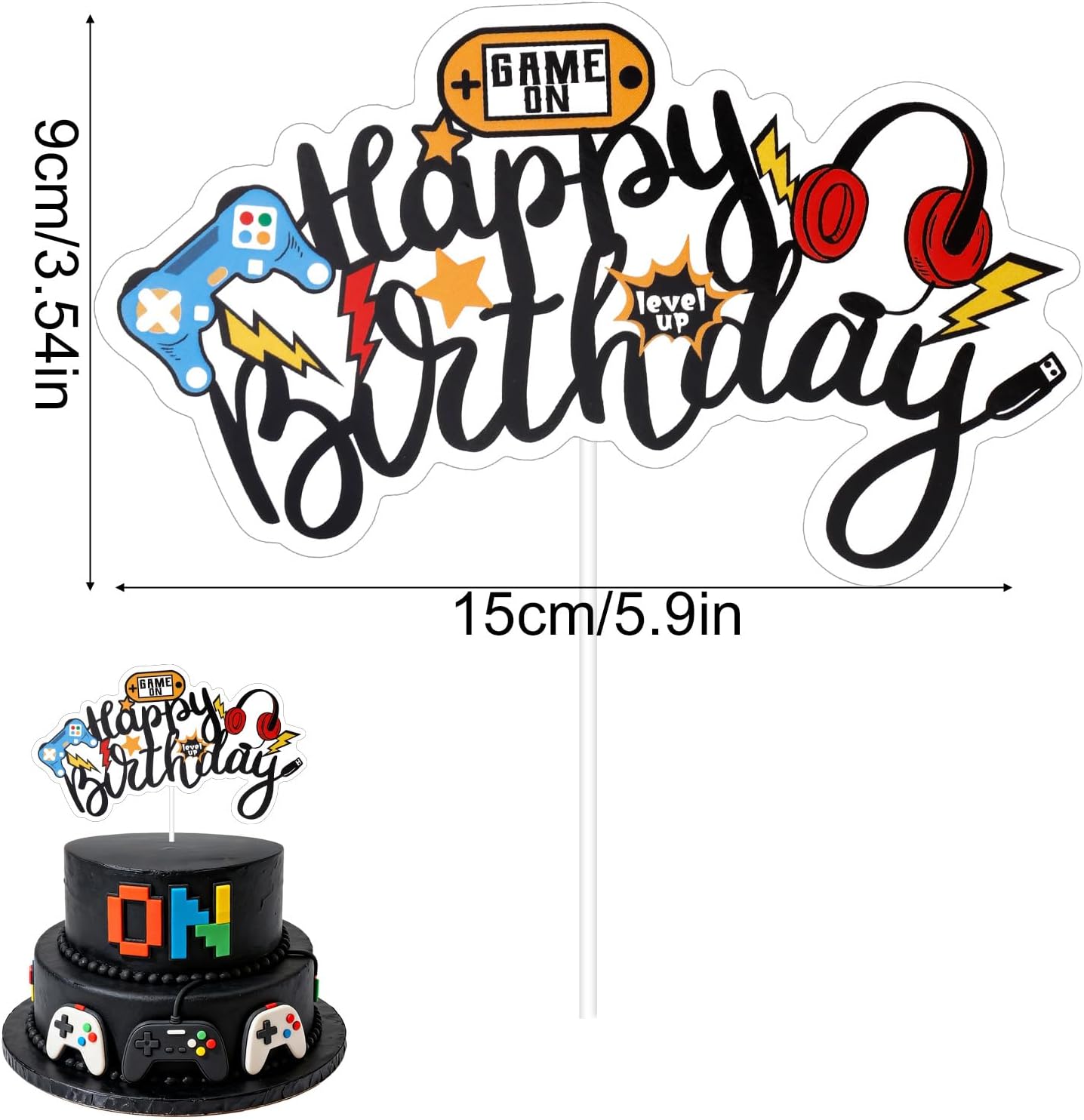 Contenuto del pacchetto: riceverai 1 pezzo di topper per torta di buon compleanno, con lettere "Happy Birthday" decorate con elementi di gioco colorati come controller, cuffie e fulmini, ecc. Plus 1 bastone e 2 punti adesivi per un facile assemblaggio fai-da-te. Materiale premium: realizzato con cartone di qualità e spessa, i nostri topper per torta per giocatori sono resistenti, leggeri, non facili da rompere o sbiadire e stabili, garantendo che la tua torta rimanga elegante durante la celebrazione. Dimensioni perfette per le torte: questo topper per torta per videogiochi misura circa 15x9 cm, rendendolo perfetto per la maggior parte delle torte, cupcake, piatti di frutta o dessert per feste senza schiacciare il display. Facile da visualizzare: il nostro prodotto viene fornito con un bastone e punti adesivi, che consente di assemblare facilmente e personalizzare il posizionamento sulla tua torta. Utilizzo ampio: la decorazione della torta dei videogiochi è accattivante e realizzata magnificamente, rendendola perfetta per feste di compleanno di videogiochi, docce per bambini, eventi a tema Gamepad o celebrazioni a tema dei giochi. Anche un grande regalo per ragazzi, ragazze, bambini, giocatori, amici, familiari e altro ancora.